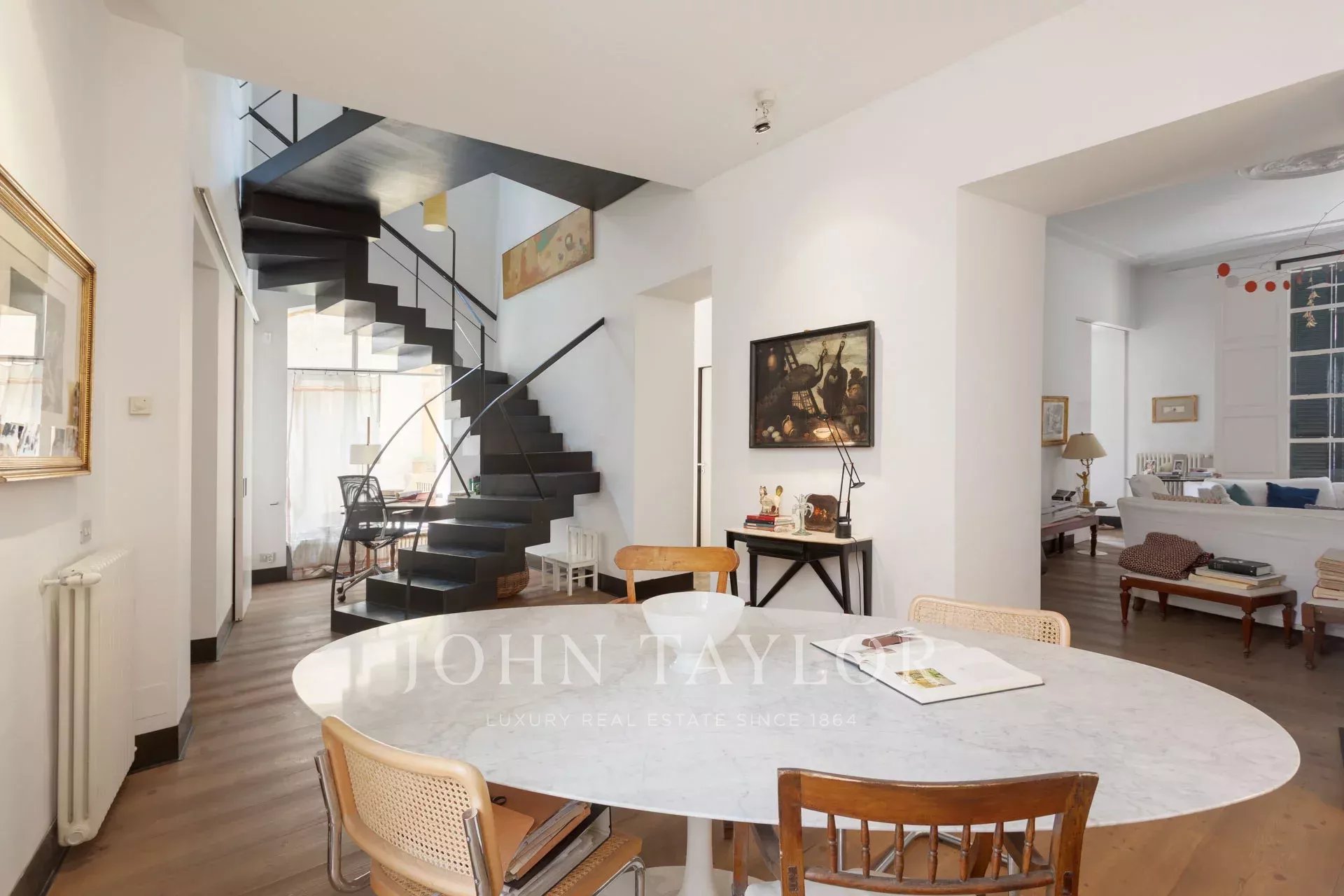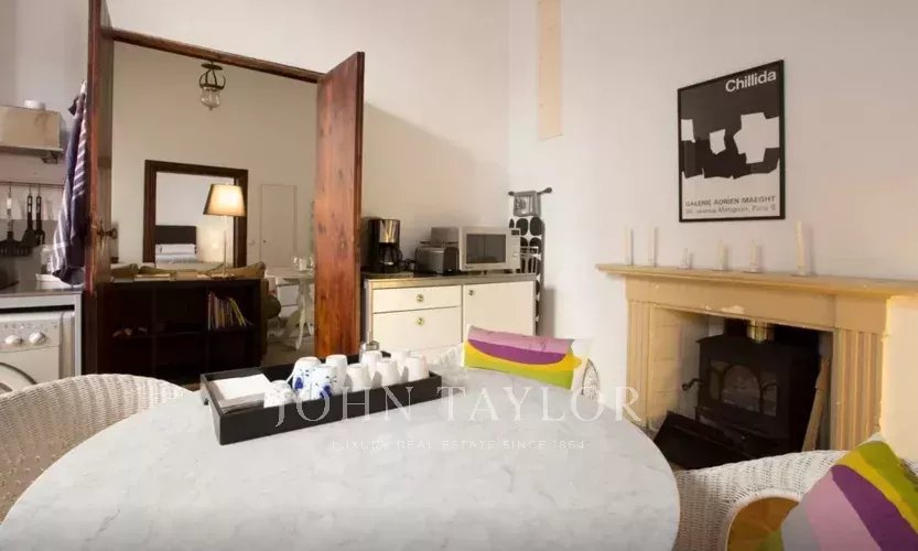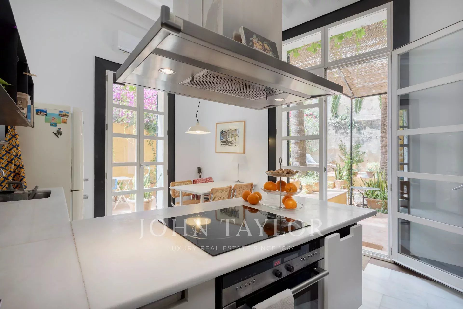 Ve spodní úrovni se jídelna, obývací prostor a plně vybavená kuchyň otevírají přímo na působivou soukromou terasu, která je klidným útočištěm v centru města. Několik míst k posezení a bazén o rozloze 25 m² vytvářejí dokonalé prostředí pro relaxaci nebo zábavu. Vysoké okolní stěny zajišťují naprosté soukromí a zároveň umožňují dostatek přirozeného světla.