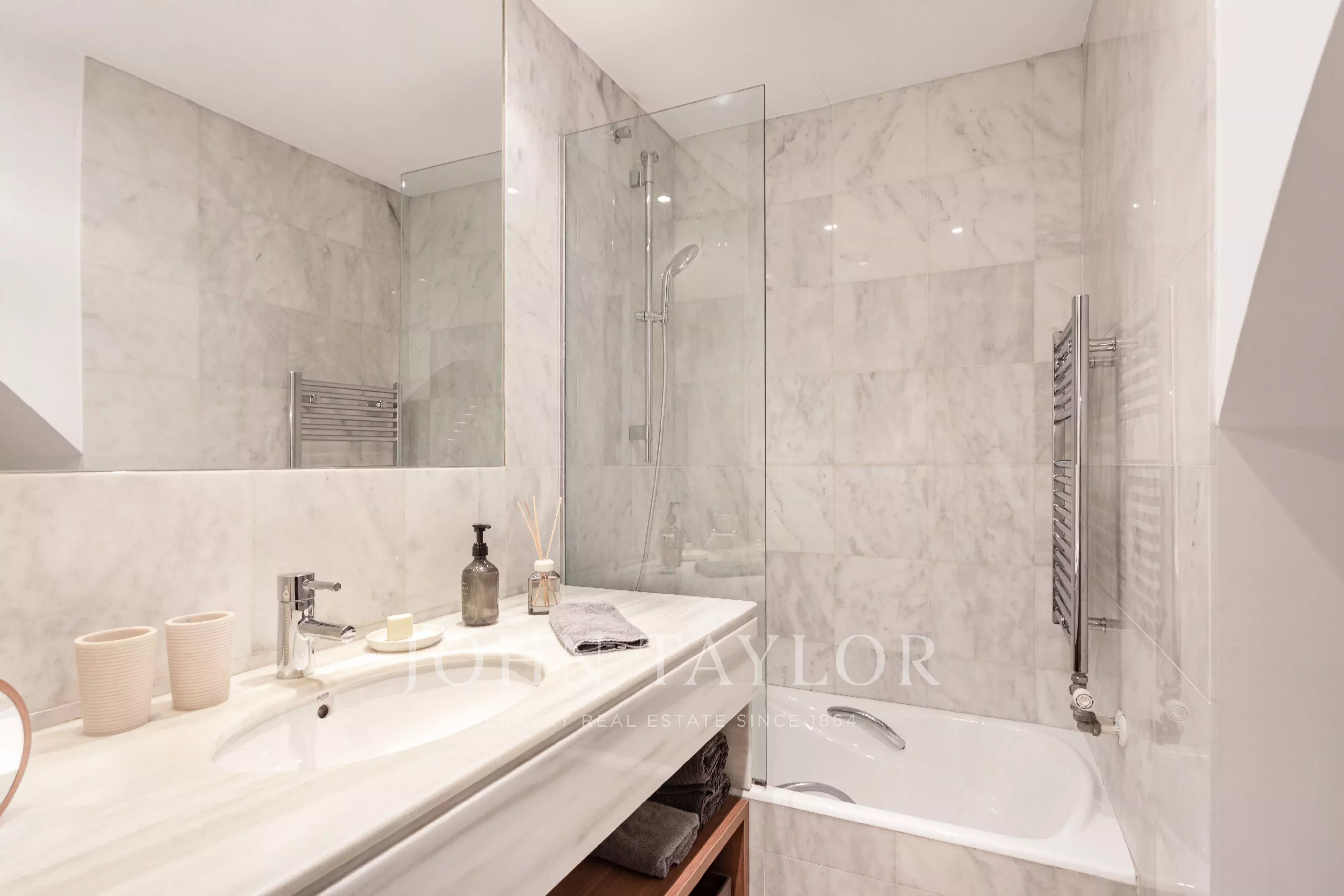 Dispozice bytu je promyšleně naplánována pro pohodlí a soukromí: dvě ložnice jsou umístěny na opačných koncích domu, každá má prostornou koupelnu a vestavěné skříně - ideální pro sdílení nebo hostování hostů. Vysoké stropy, původní tmavé parkety a úžasné odhalené dřevěné trámy dodávají prostoru charakter a nadčasovou eleganci.