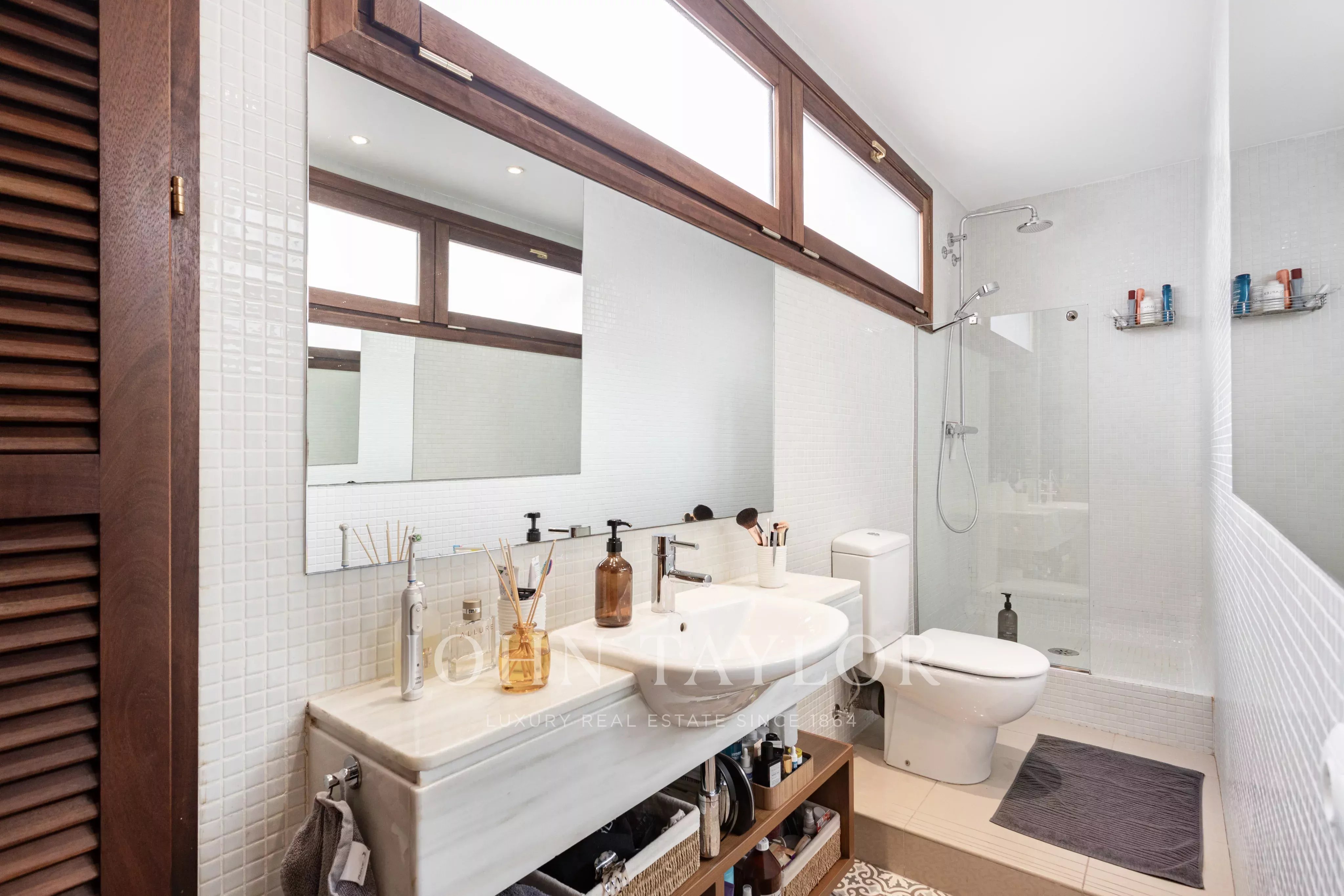Otevřený obývací a jídelní prostor plynule navazuje na moderní, plně vybavenou kuchyň s centrálním ostrůvkem - ideální pro zábavu. Dva okouzlující francouzské balkony, které jsou na stejné úrovni jako obývací prostor, vytvářejí pocit plynulého propojení interiéru s exteriérem. Díky tradičním mallorským okenicím a absenci schodů mezi obývacím prostorem a balkony se stávají prodloužením bytu a nabízejí naprosté soukromí a klidné místo pro odpočinek nebo posezení u nápoje venku.