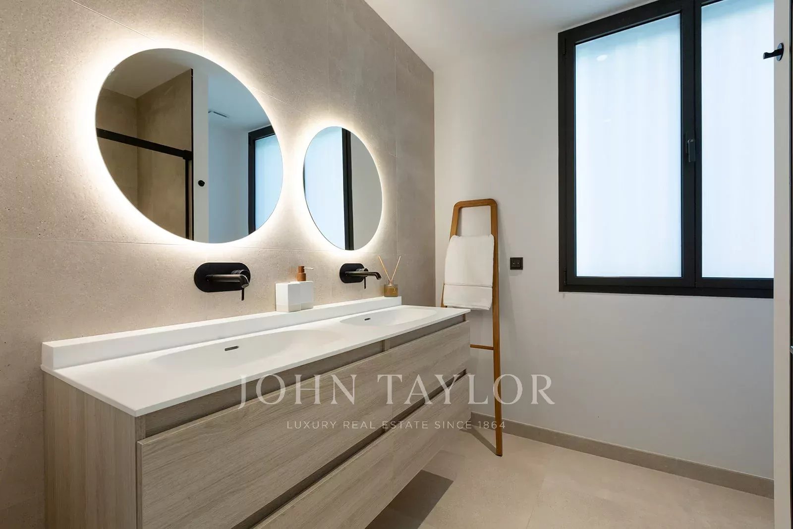 Obě ložnice jsou prostorné a plné přirozeného světla. Hlavní apartmá zahrnuje přímý vstup na terasu a vlastní koupelnu. Obě koupelny jsou navrženy s elegantními detaily, včetně prosklených sprchových koutů, ambientního osvětlení, umyvadel z masivního povrchu s velkými zásuvkami a LED zrcadel, které kombinují styl a praktičnost.
