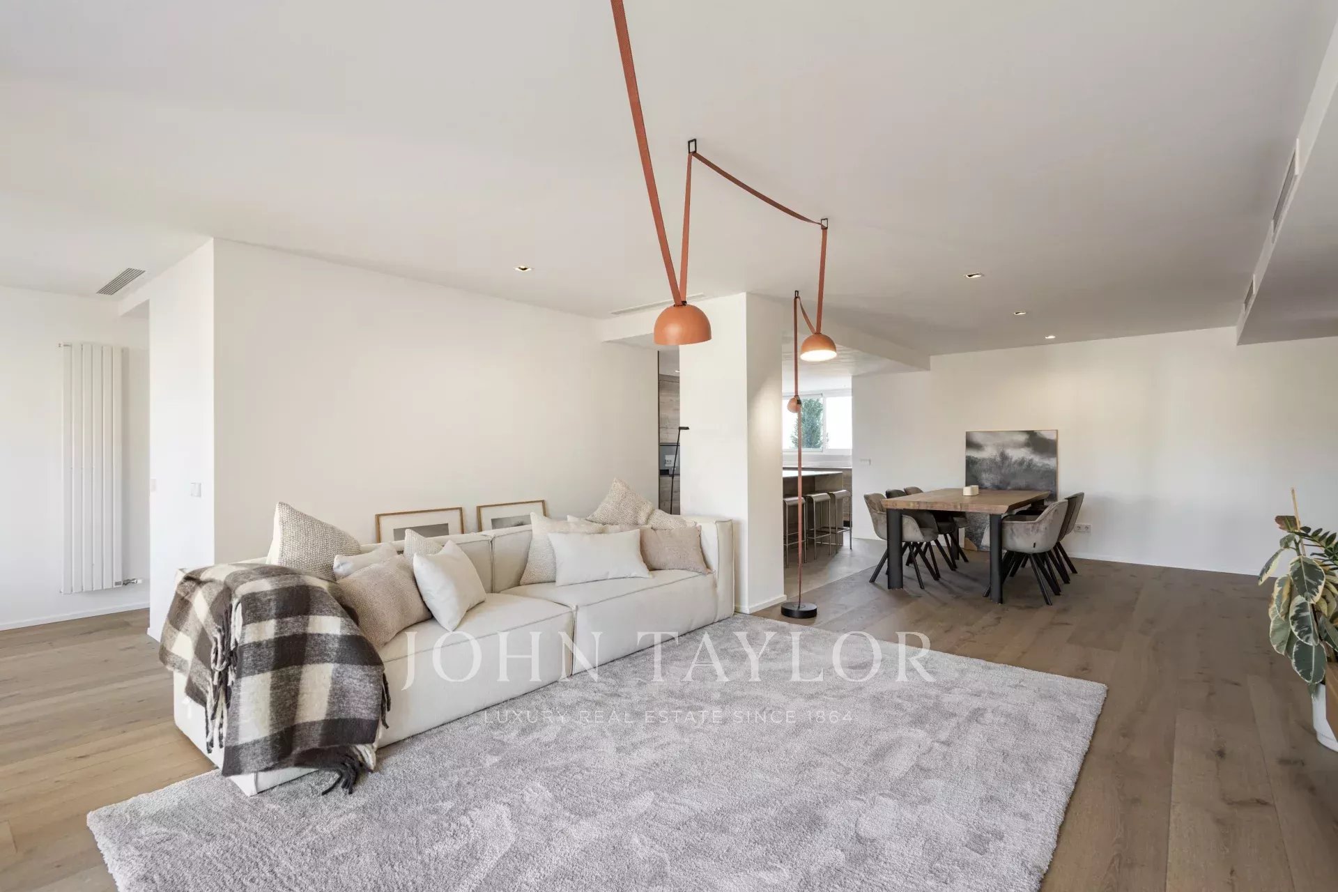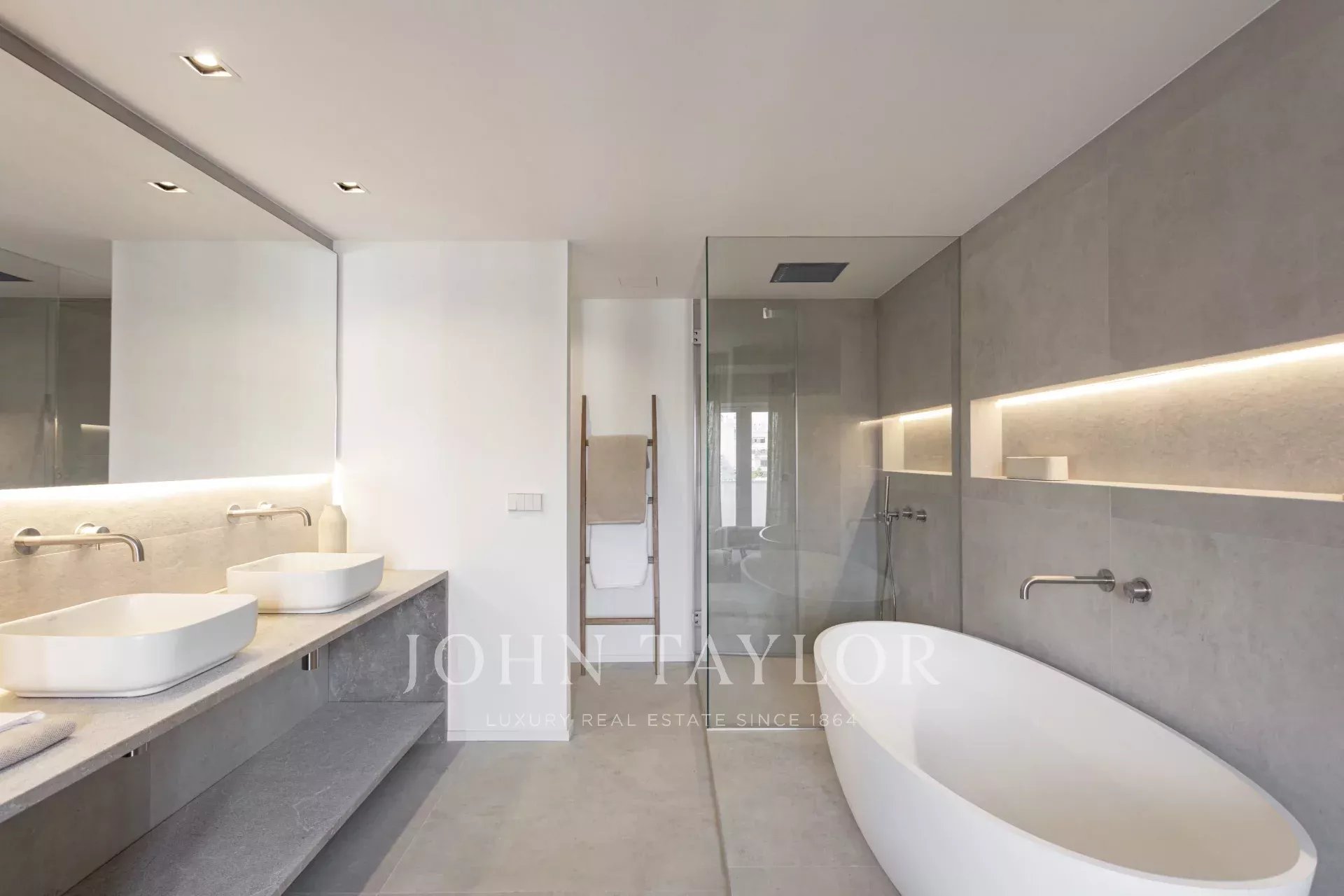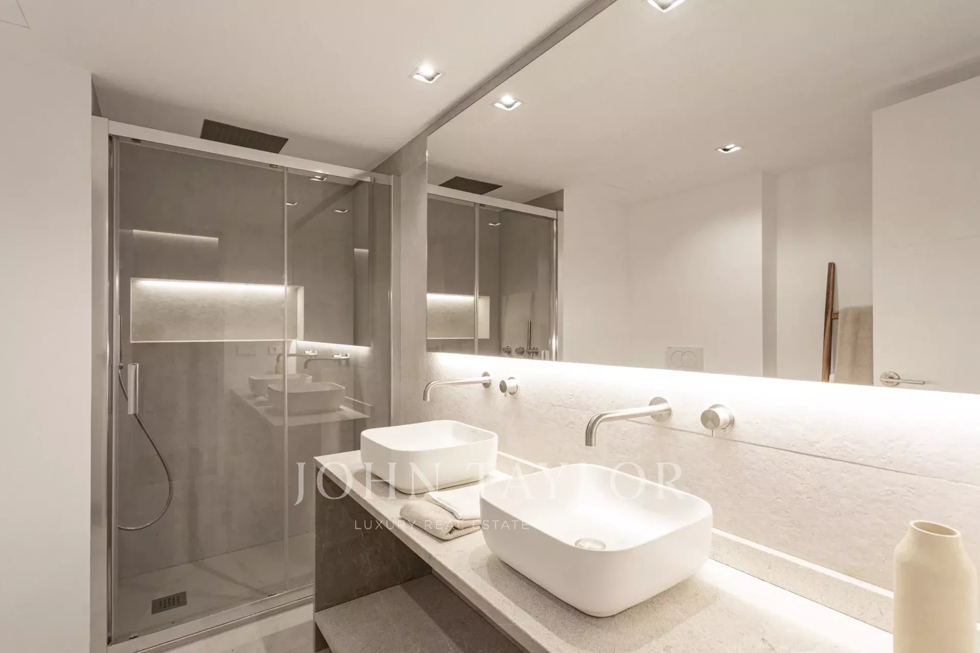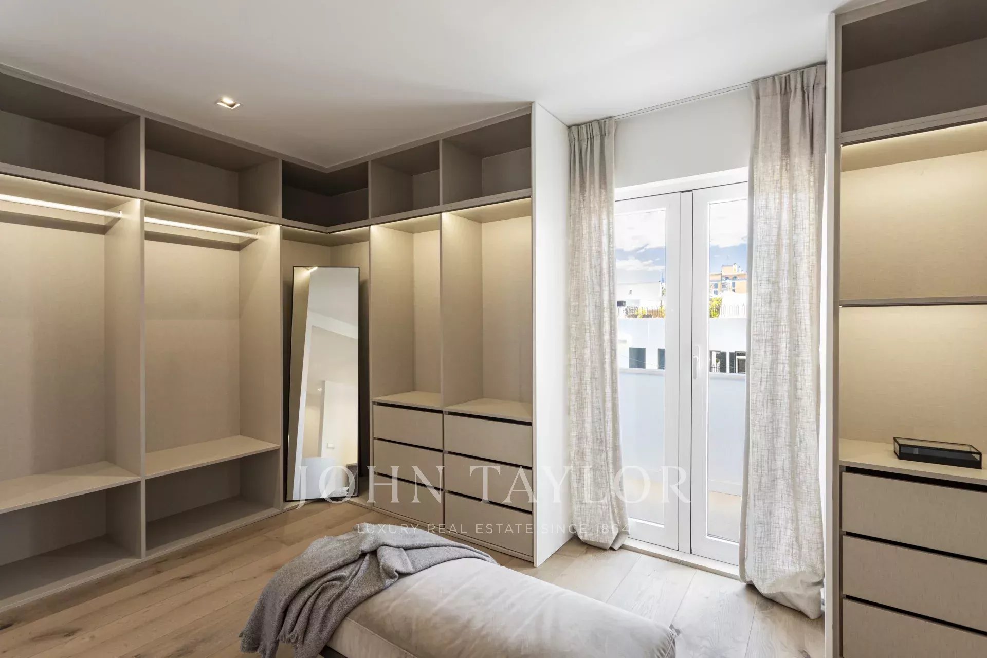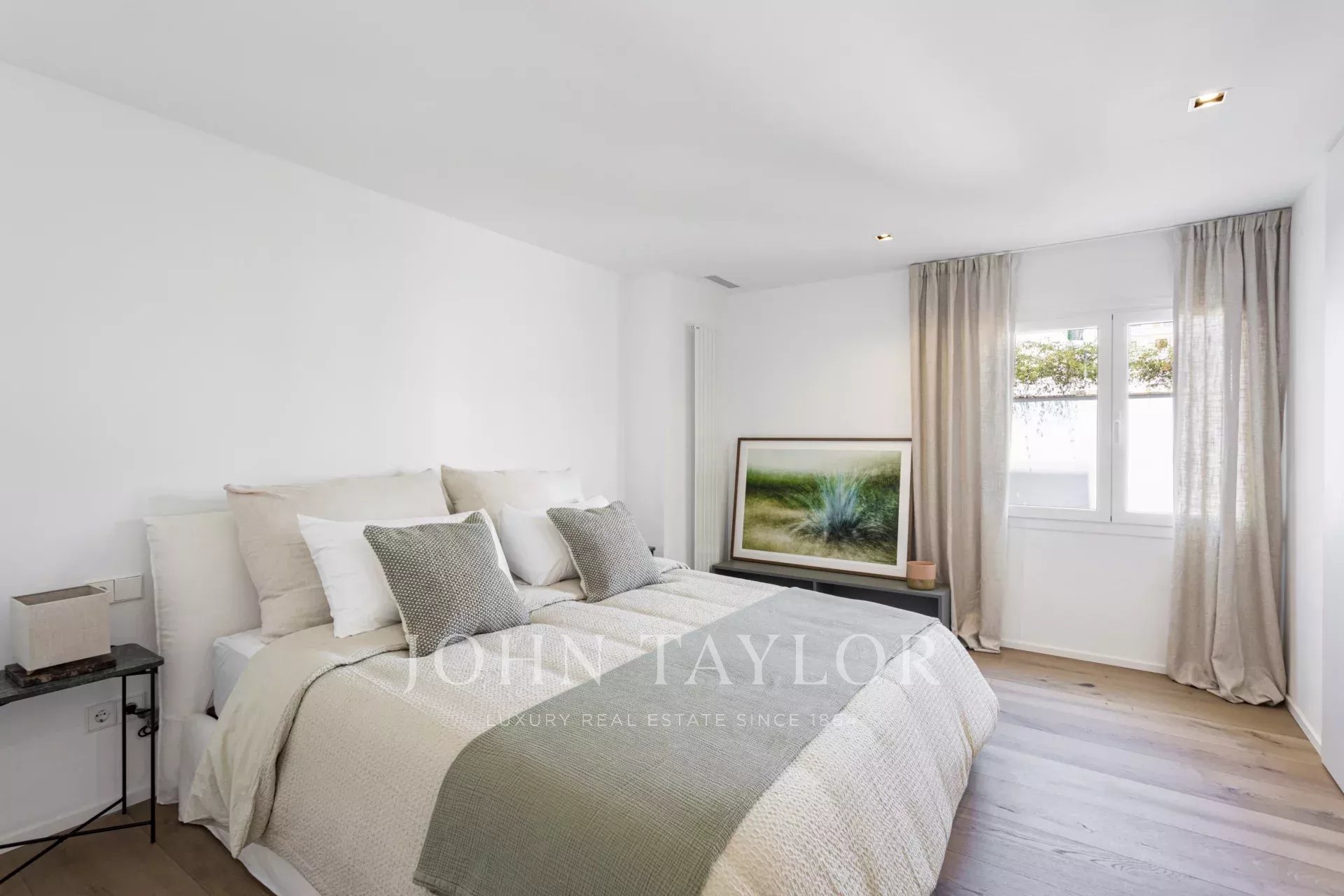 Byt má dvě prostorné ložnice, z nichž jedna je vybavena šatnou a vlastní koupelnou, a nabízí tak elegantní a pohodlný prostor. Existuje také možnost vytvořit třetí ložnici využitím prostoru vedle toalety pro hosty, což této nemovitosti přidává ještě větší hodnotu. Dispozice byla pečlivě navržena tak, aby maximálně využila každý metr čtvereční: jsou zde dvě kompletní koupelny, praktická samostatná prádelna a toaleta pro hosty, vše s vysoce kvalitními povrchovými úpravami a moderními detaily. Díky vysokým stropům, nádherným dekoracím a vkusně vybraným materiálům je tato nemovitost plně zařízená a připravená k nastěhování.