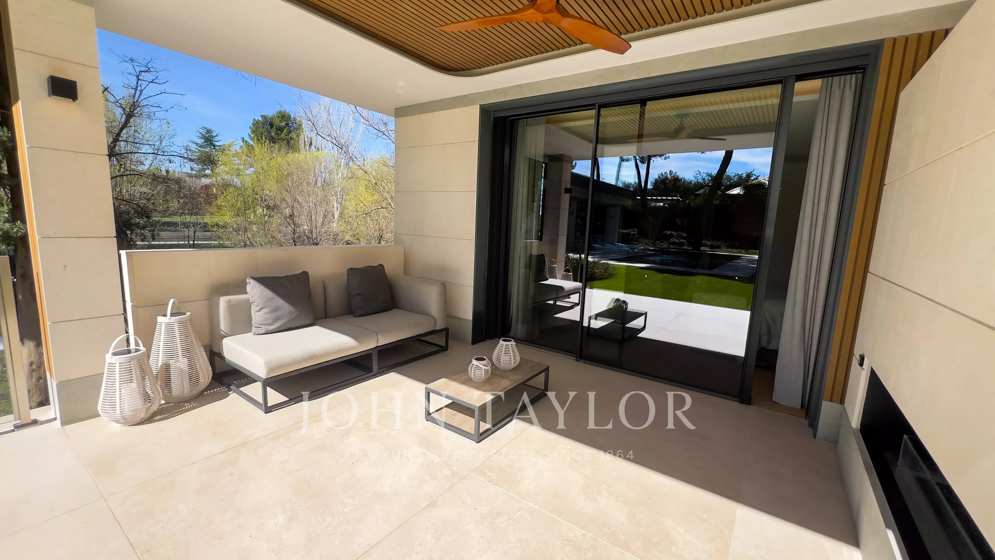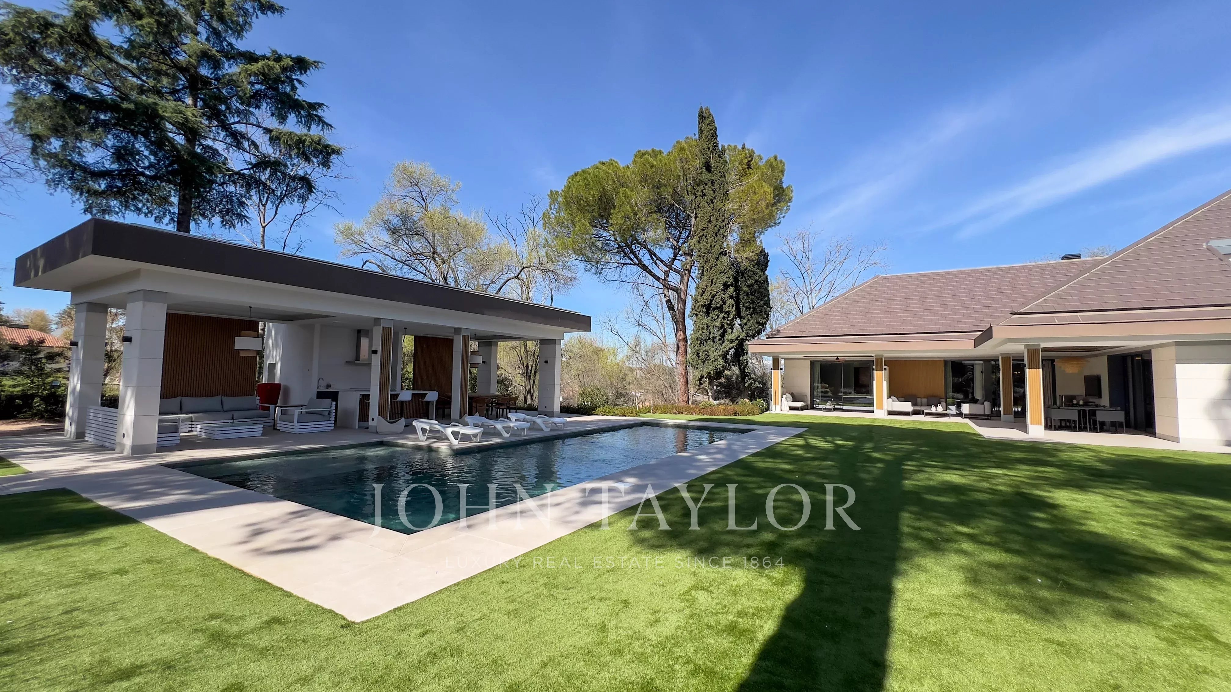 Zahrada, s udrženým stálezeleným stromovím, venkovním bazénem a chill-out zónou, doplňuje tuto nemovitost, která kombinuje eleganci, soukromí a komfort v jednom z nejexkluzivnějších rezidenčních míst Madridu.
