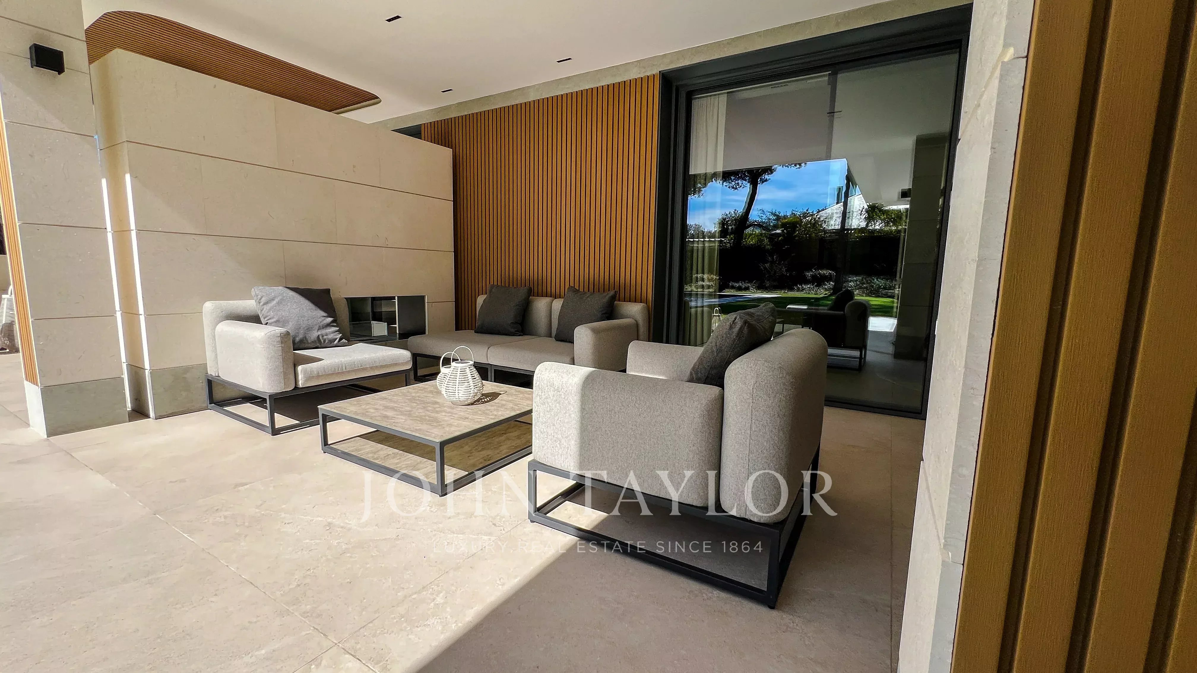 Vrchní patro má tři další ložnice, z nichž dvě jsou s vlastní koupelnou a šatnou, a všechny mají přístup na terasy s výhledem na zahradu.