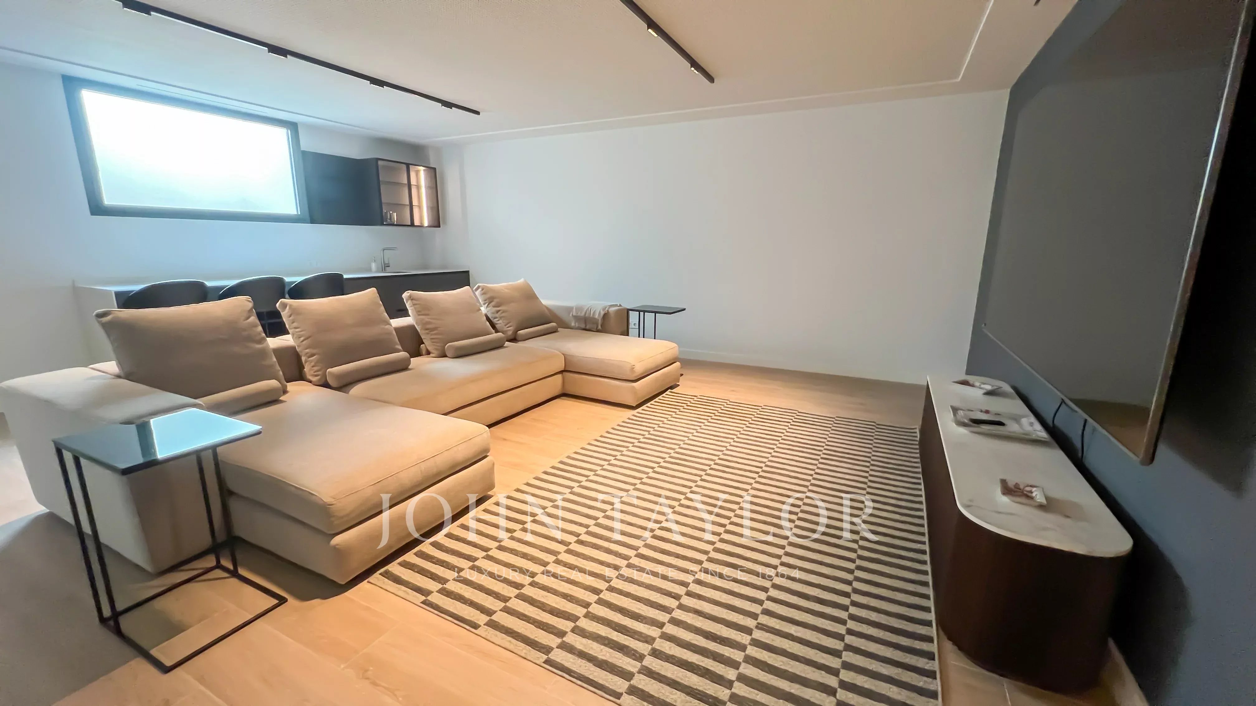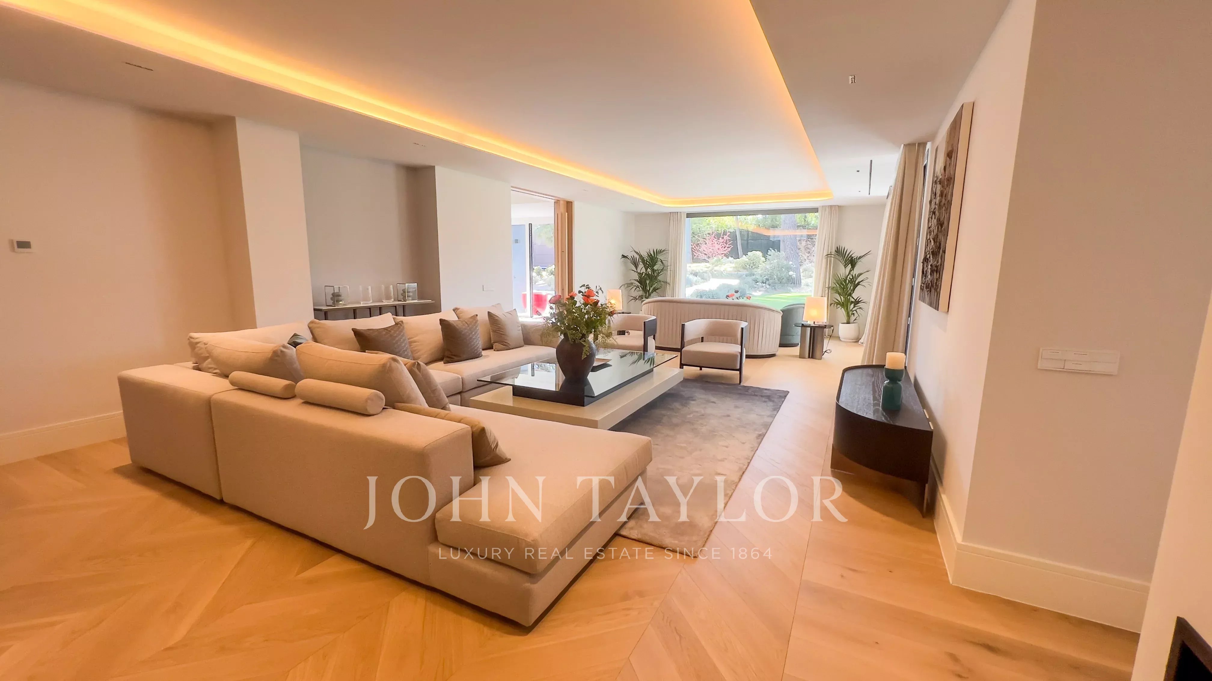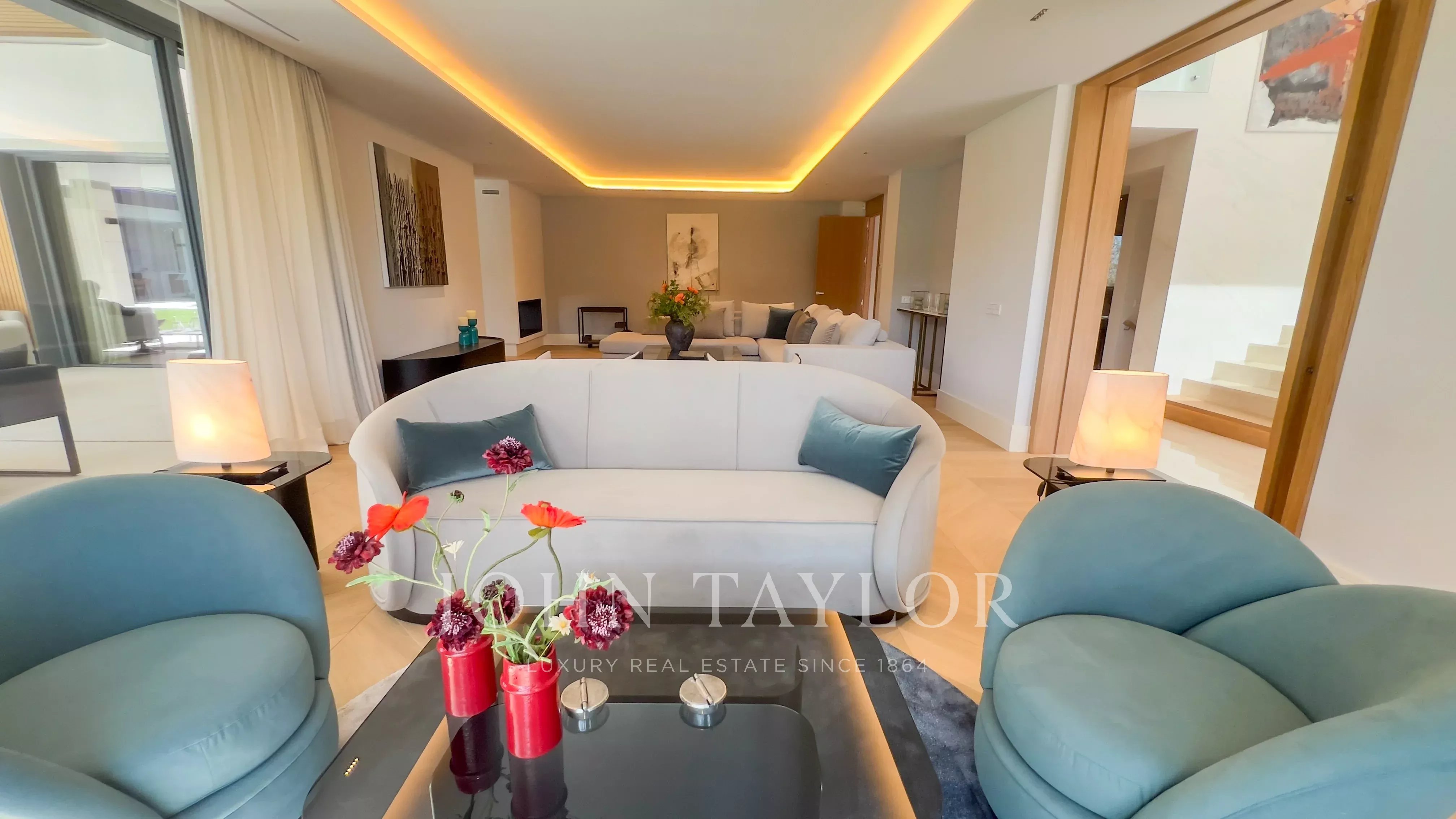 Hlavní patro obsahuje elegantní halu s dvojitou výškou, velký obývací pokoj s výstupem do zahrady a bazénu, obývací pokoj s barem, kuchyň s designem vybavenou spotřebiči Gaggenau a jídelní kout. V této úrovni se nachází také hlavní suite s vlastním salónem, dvěma šatnami a koupelnou, kromě toalet pro hosty.