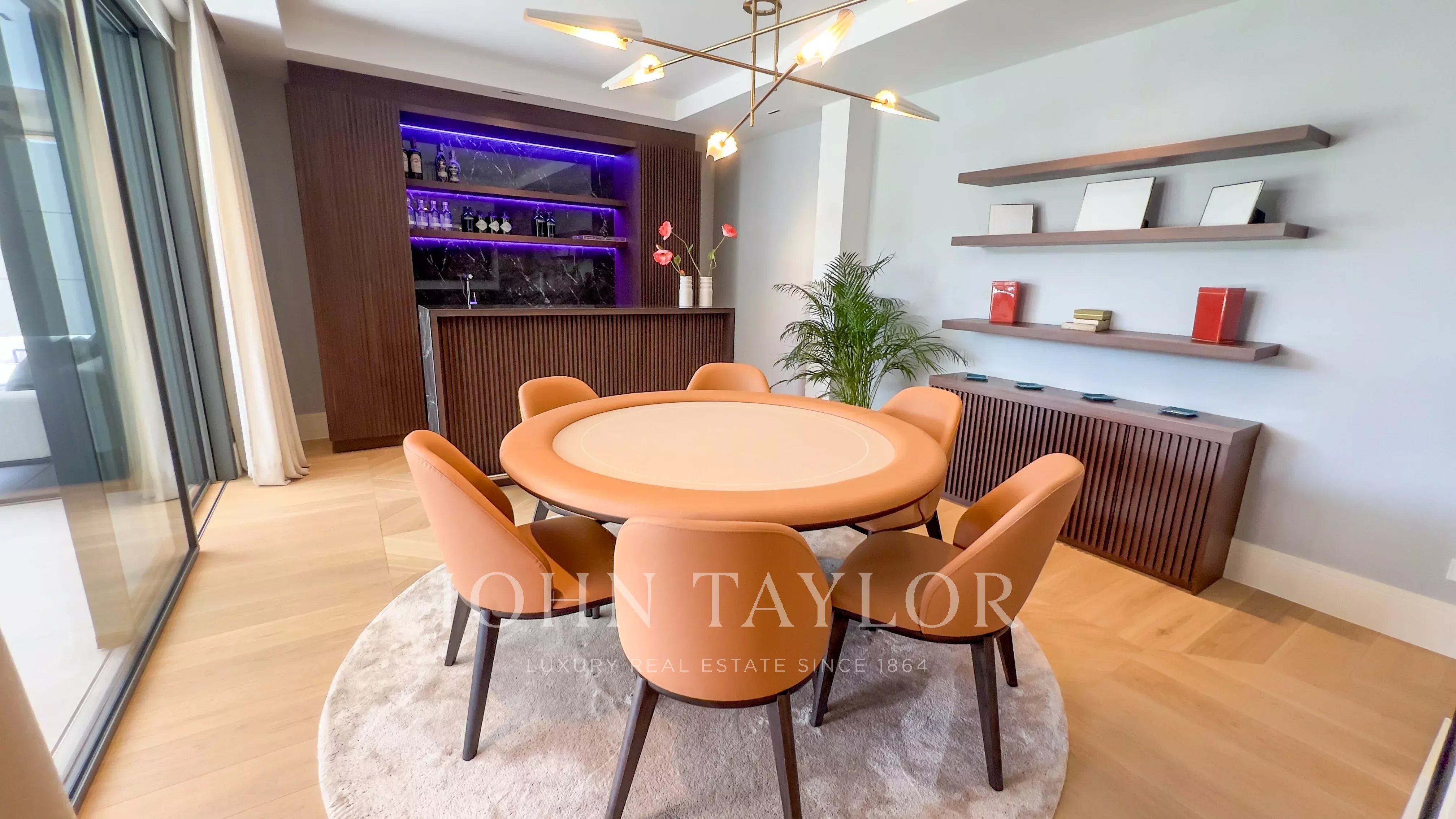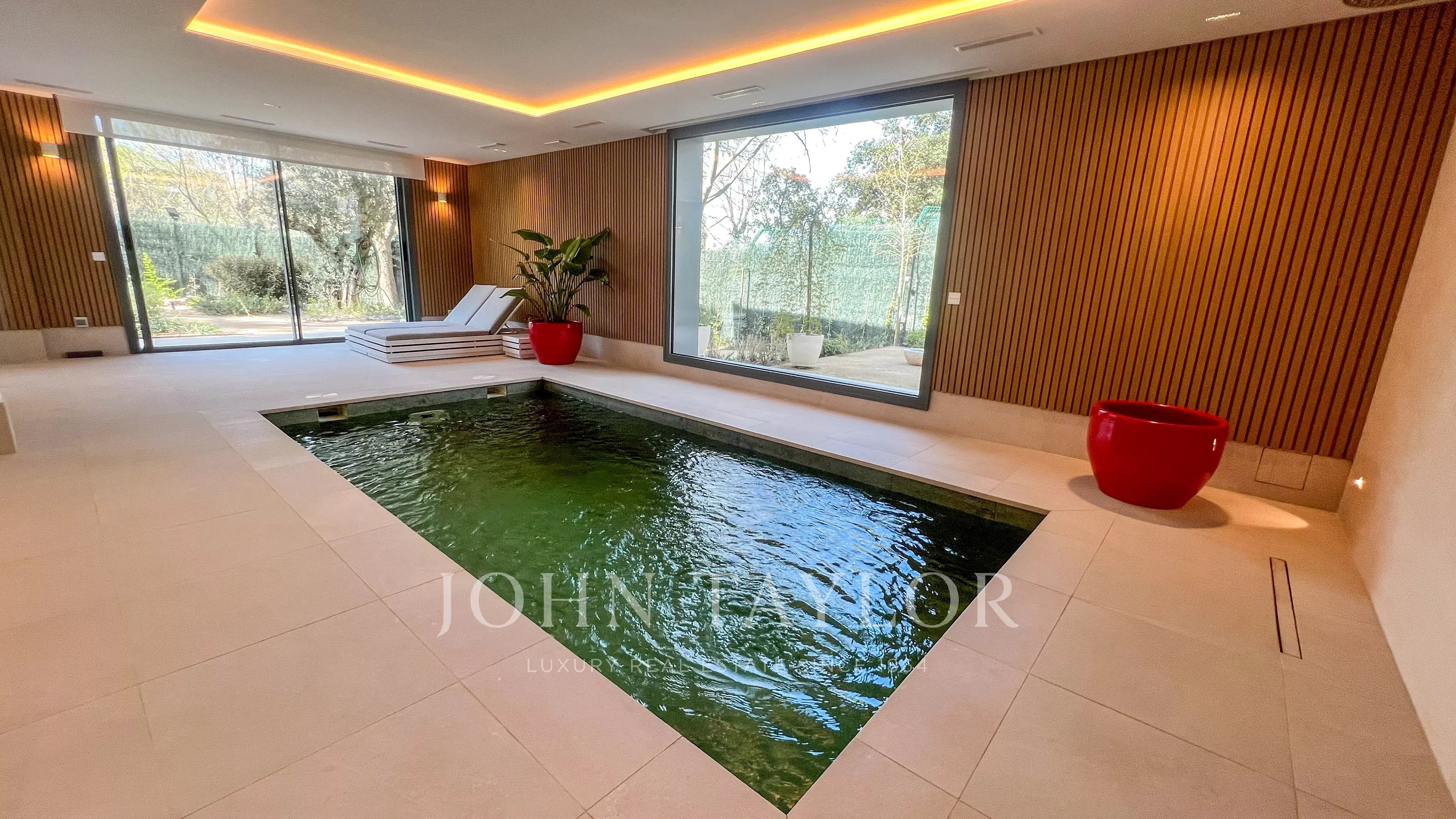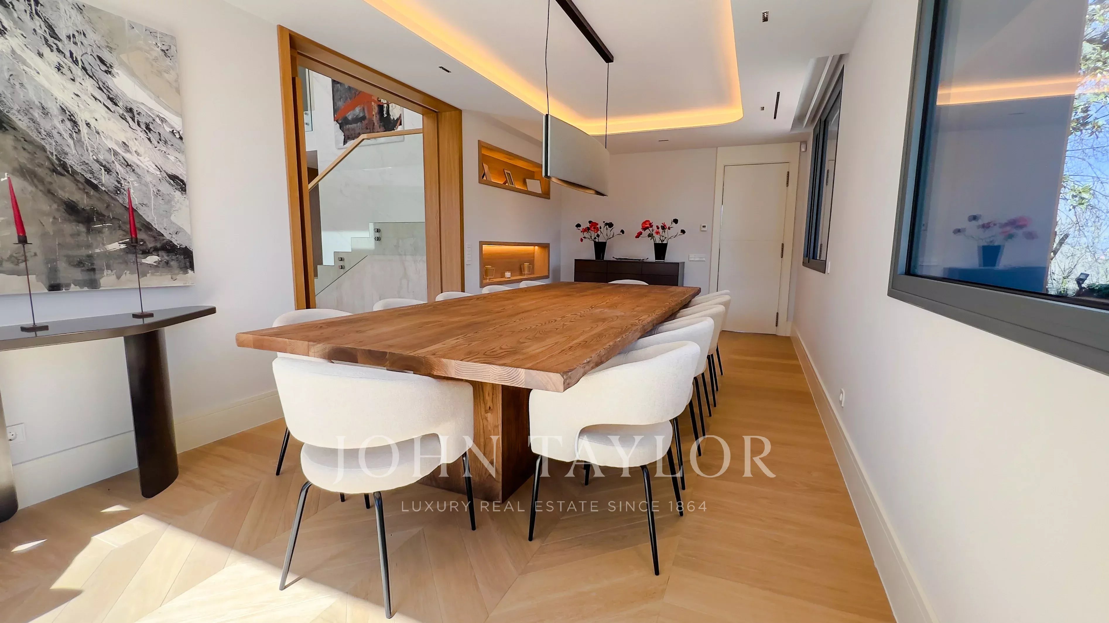 Hlavní patro obsahuje elegantní halu s dvojitou výškou, velký obývací pokoj s výstupem do zahrady a bazénu, obývací pokoj s barem, kuchyň s designem vybavenou spotřebiči Gaggenau a jídelní kout. V této úrovni se nachází také hlavní suite s vlastním salónem, dvěma šatnami a koupelnou, kromě toalet pro hosty.