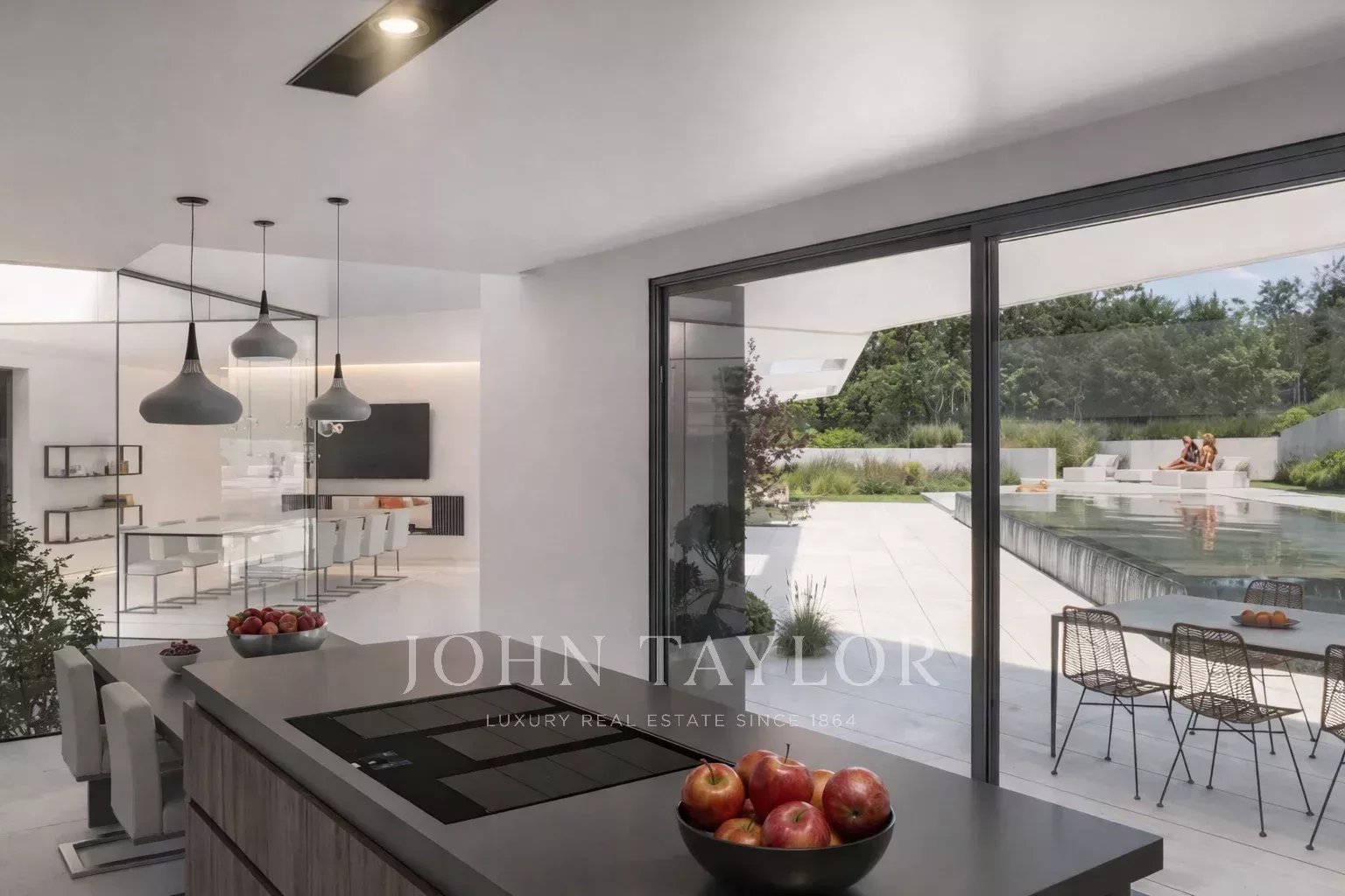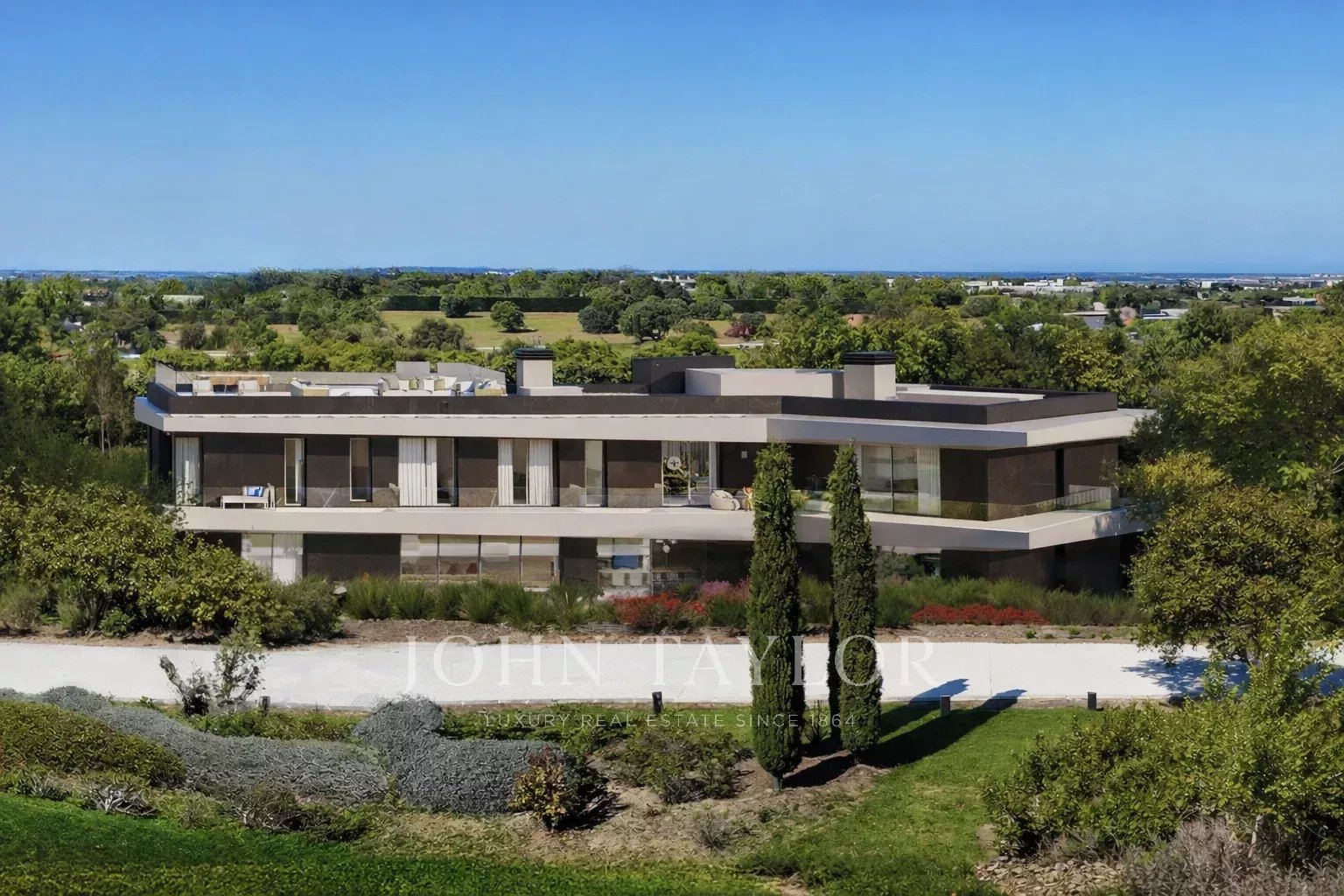 Elegantní projekt terénních úprav v souladu se stavbou, začlenění parkoviště a nekonečného bazénu s vyhřívanou vodou. Na střešní terase se nachází nádherná odpočinková zóna s výhledem do krajiny a na hory.