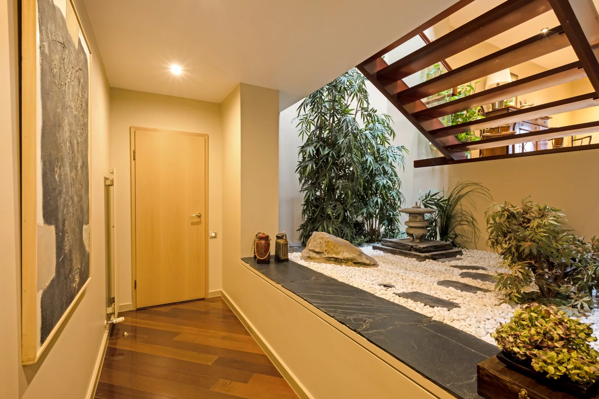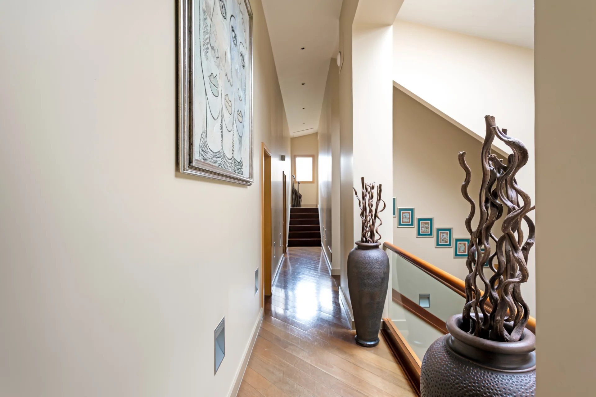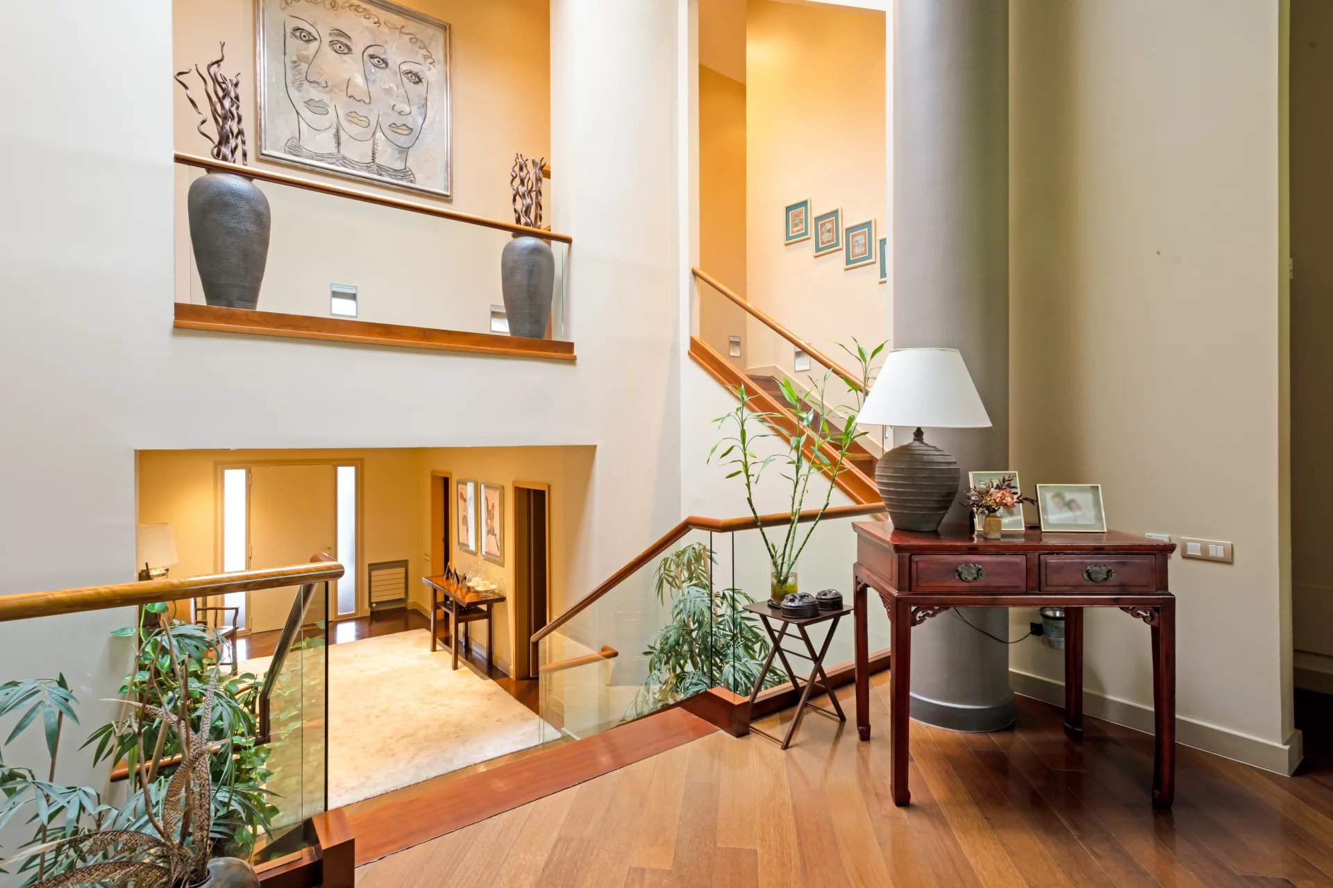 Ze vstupního prostoru vede sedmistupňové schodiště na mezipatro, které rozděluje hlavní obývací pokoj, kuchyň, krytou verandu, bazén a přímý přístup do společných zahrad.