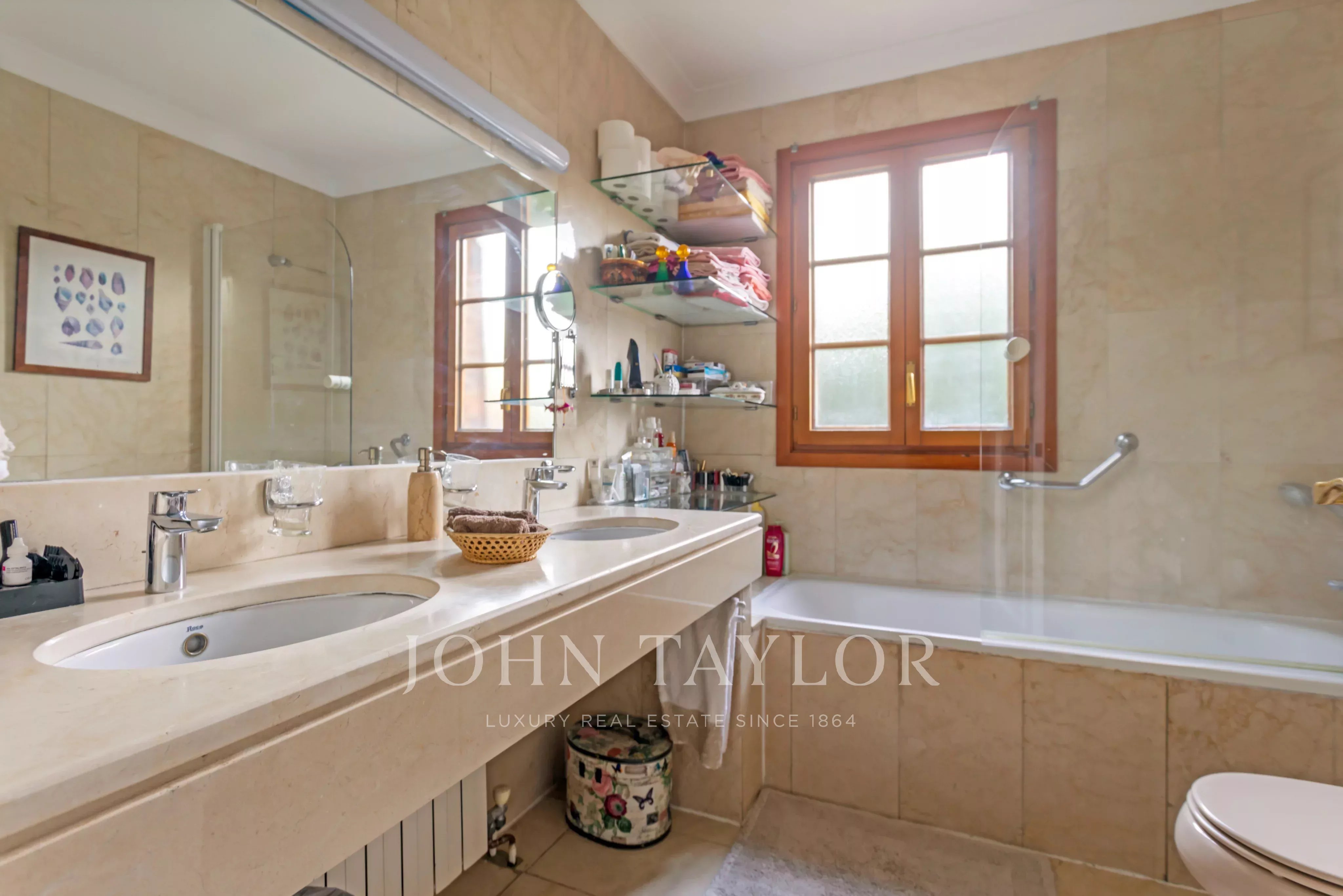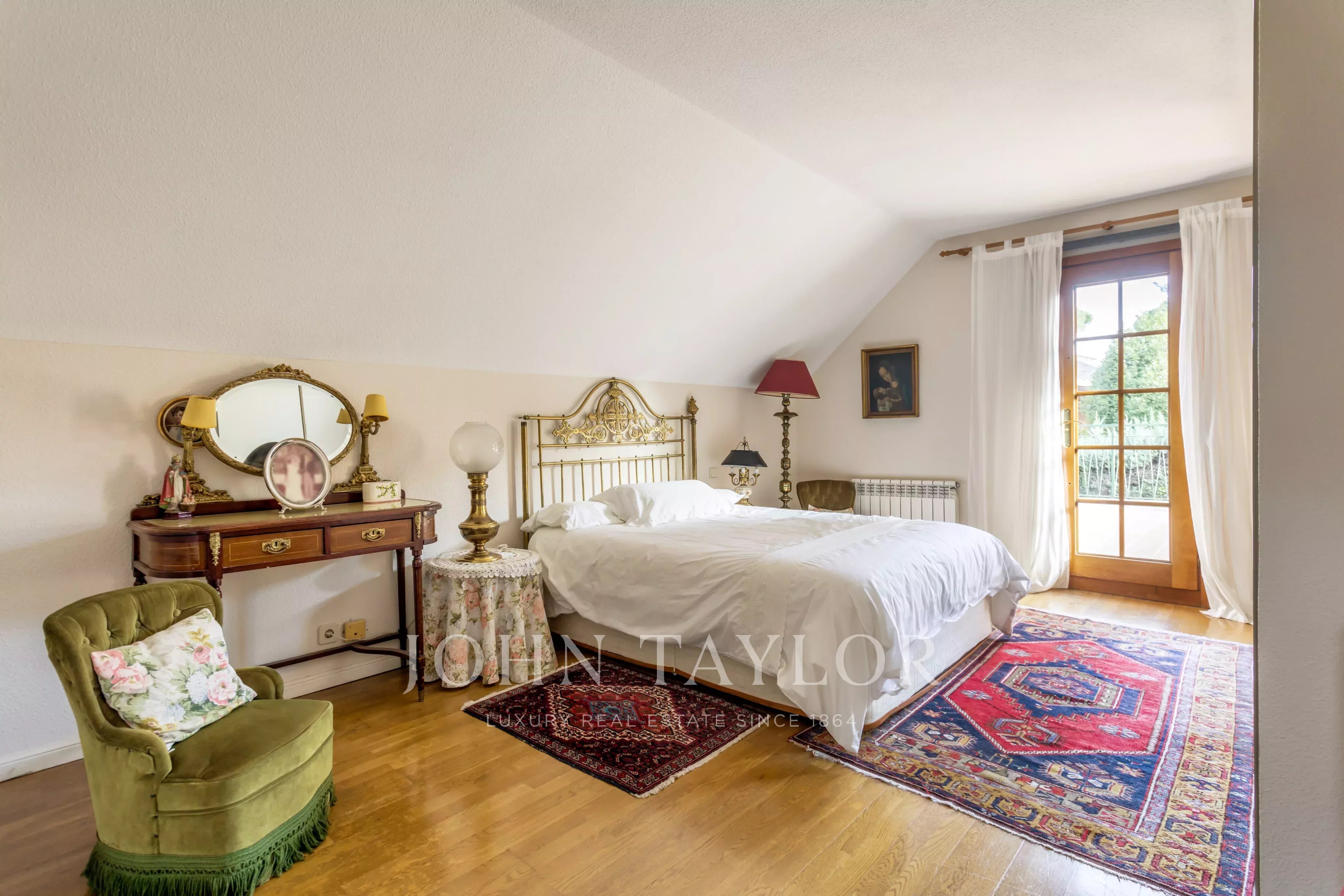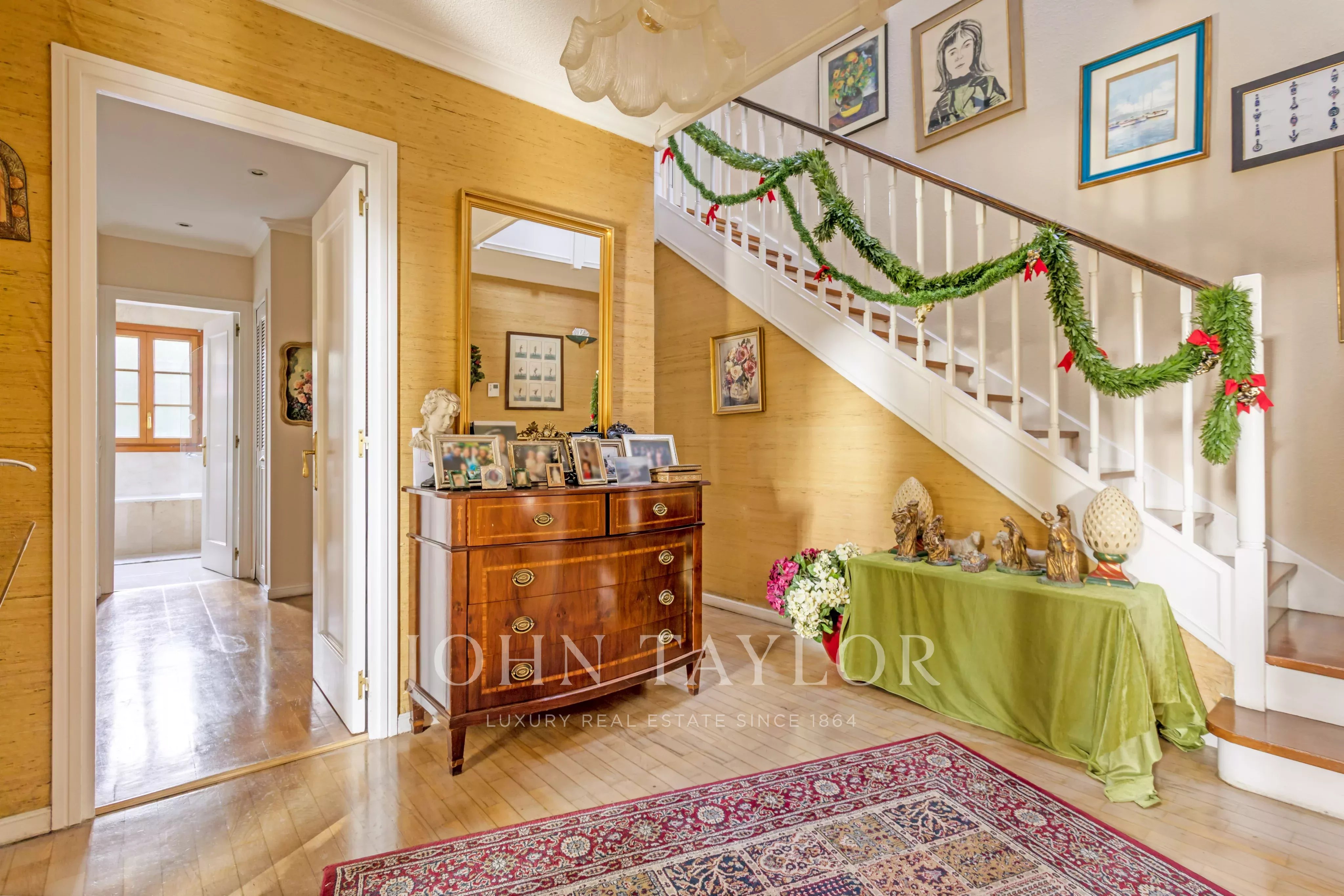 Ve vstupním podlaží prostorná vstupní hala s dvojitou výškou, velký obývací pokoj, jídelna, kuchyně, rodinná jídelna, toaleta pro hosty a pokoj pro služku s koupelnou. Ve stejném patře rodinný pokoj nebo pracovna a hlavní ložnice s vlastní koupelnou a šatnou. V prvním patře pět ložnic a dvě koupelny, možnost vytvořit další koupelny. Velká terasa s výhledem na pozemek.