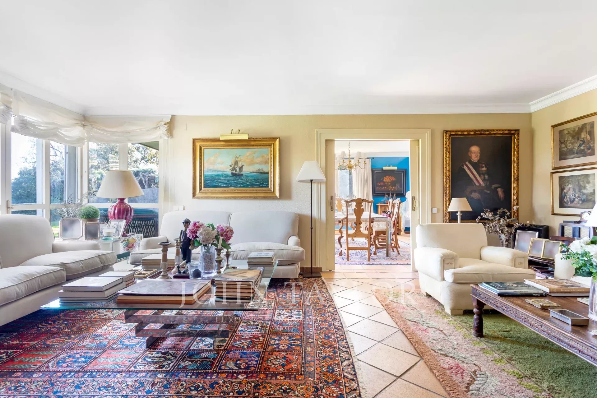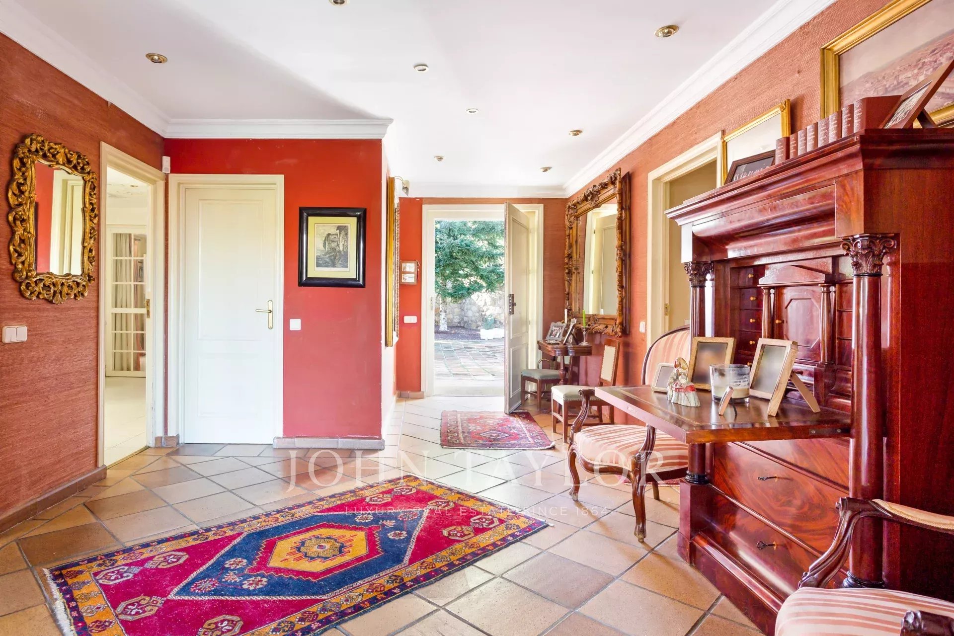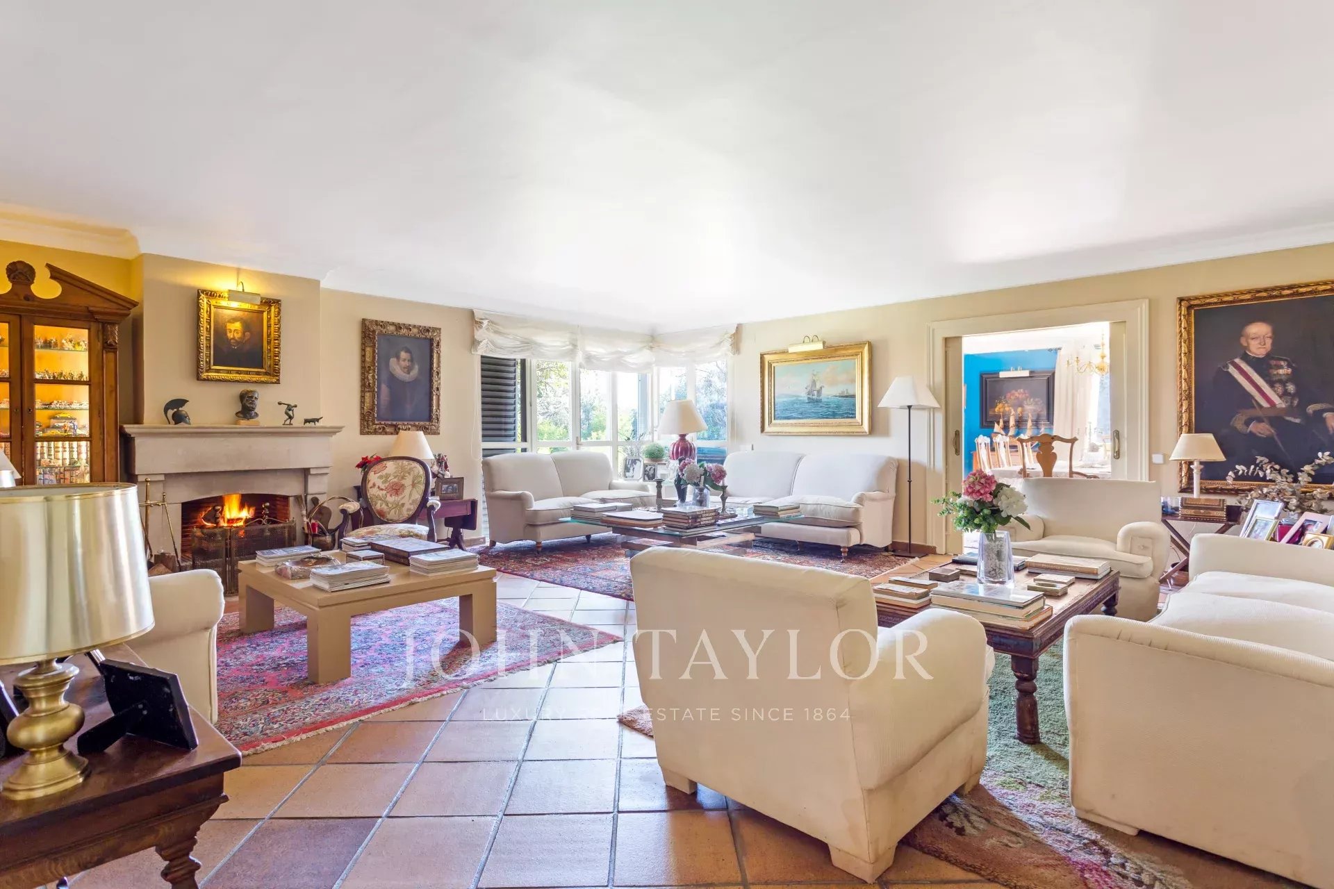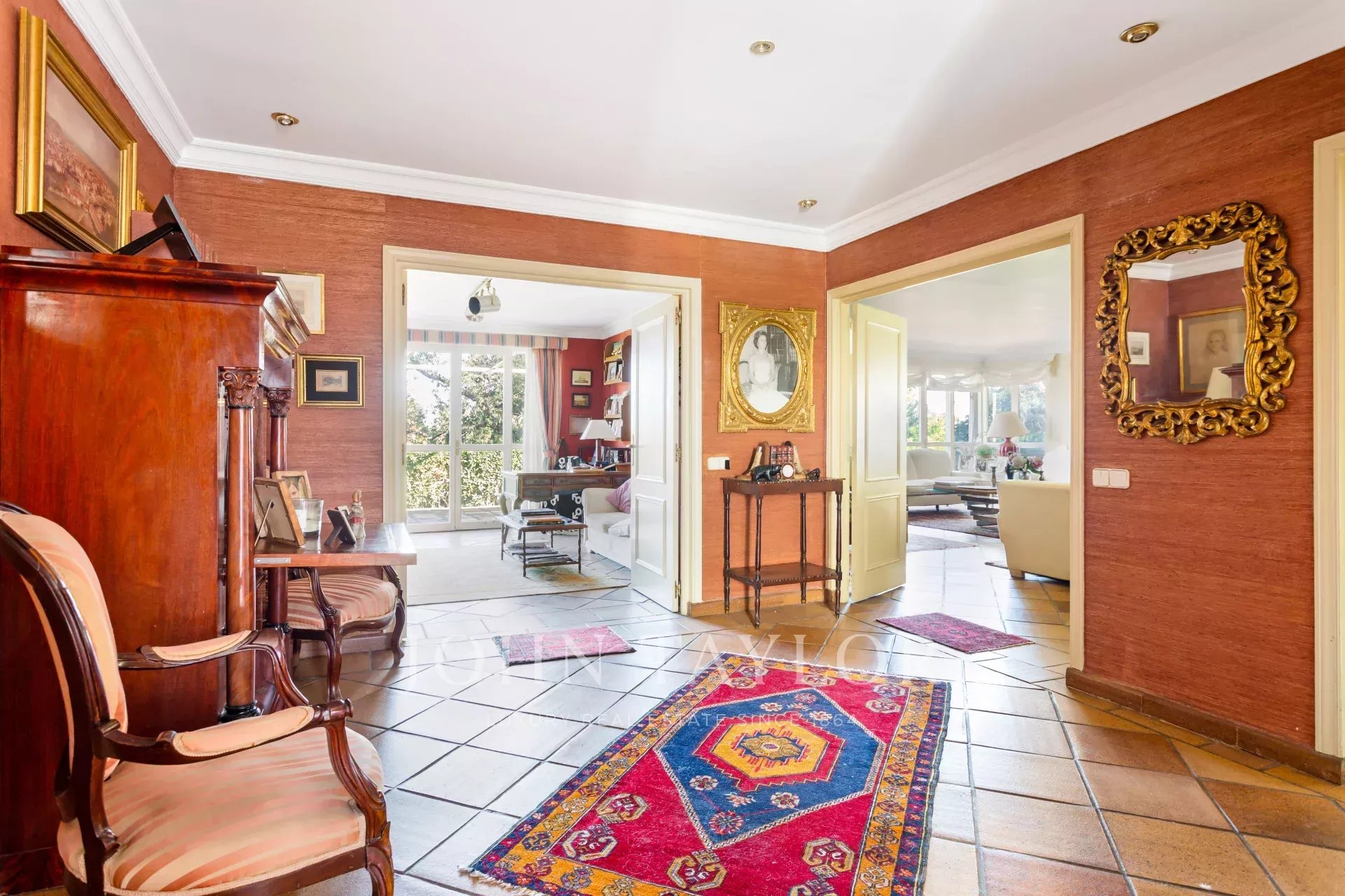 V hlavním patře je velká vstupní hala, obývací pokoj ve třech místnostech, nádherná jídelna, která se otevírá na velkou verandu a zahradu, dále kancelář-knihovna a koupelna.