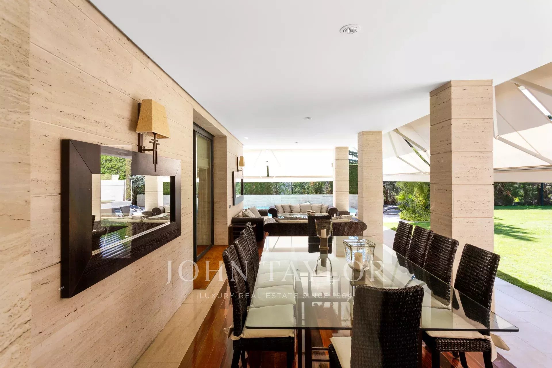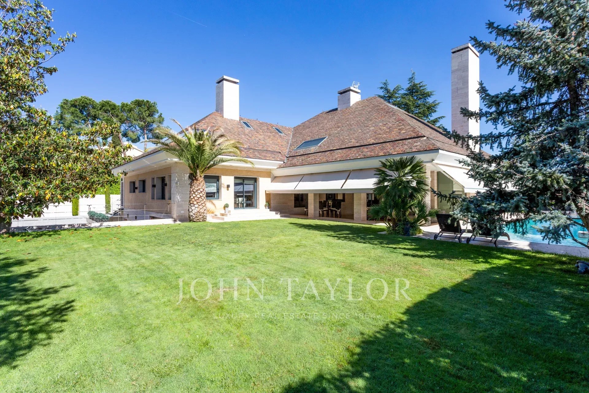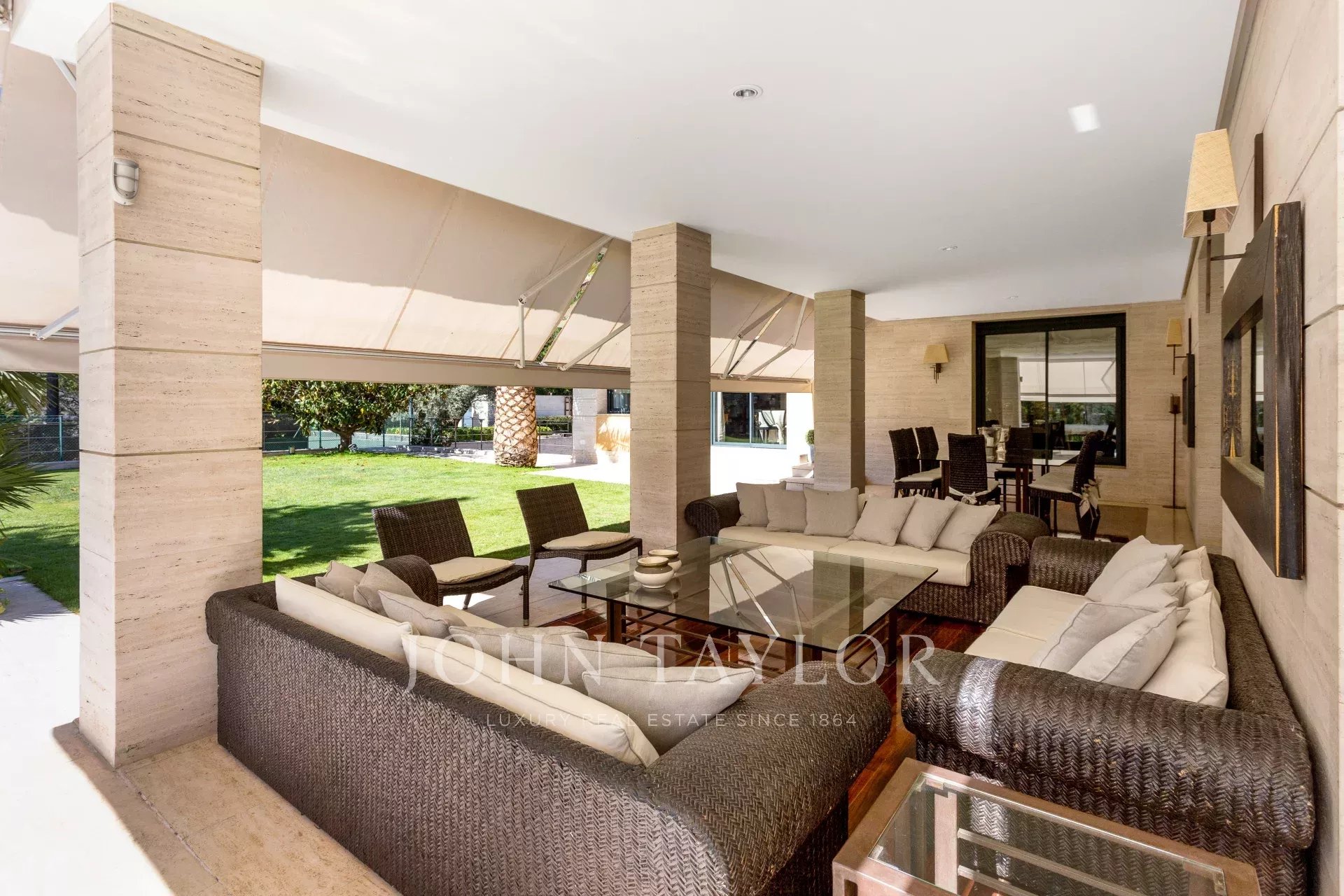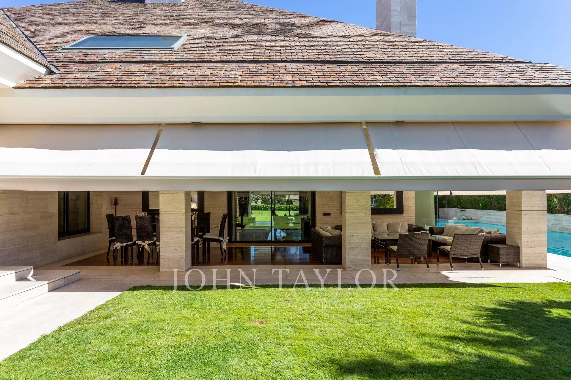 Venku bazén vedle verandy a salonků, tenisový kurt a venkovní garáž pro 4 auta.