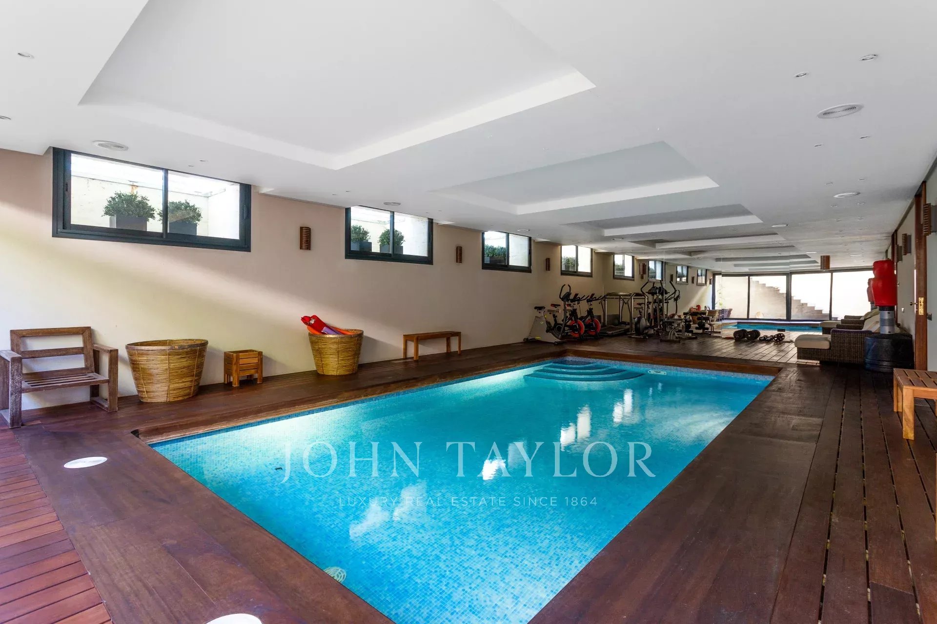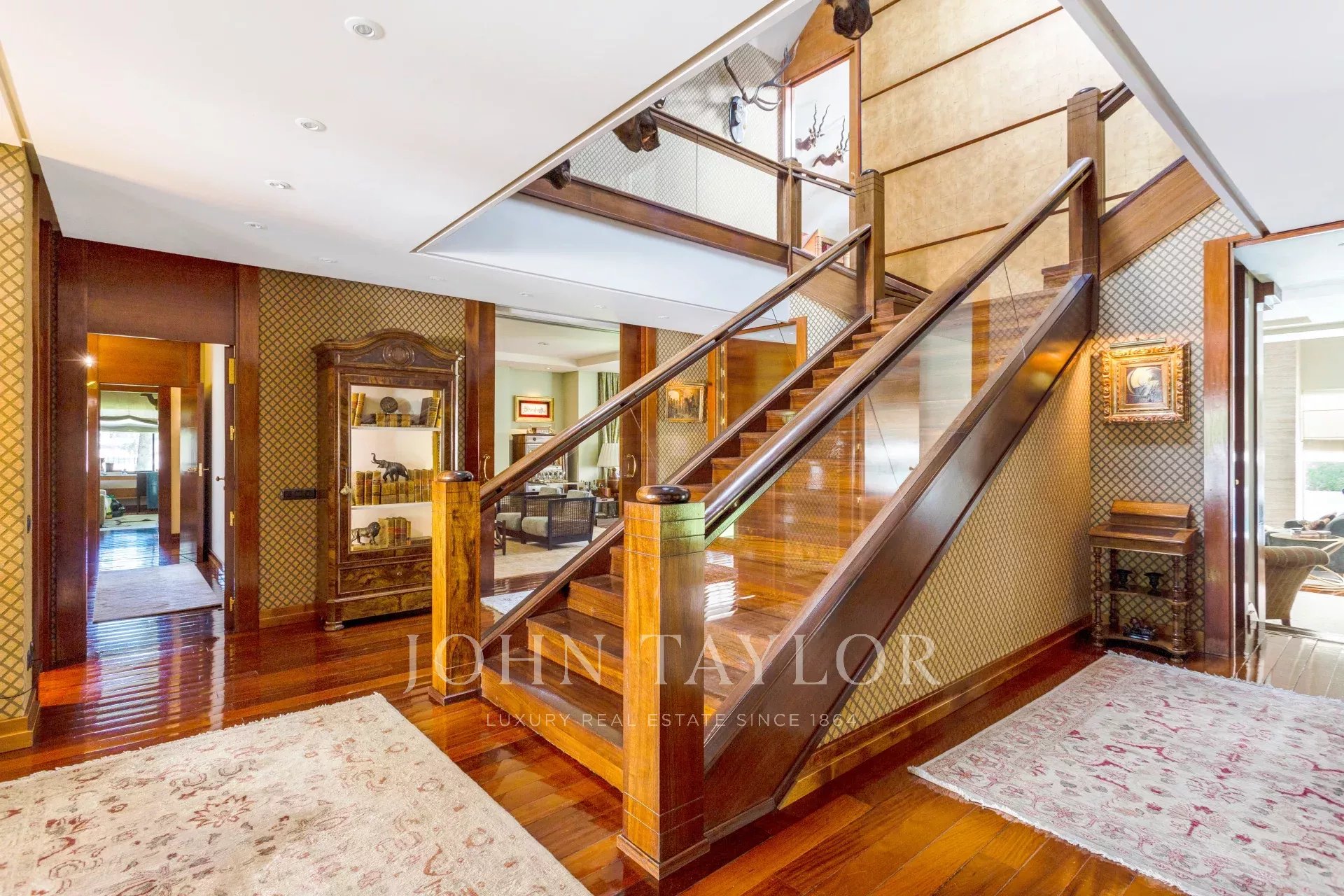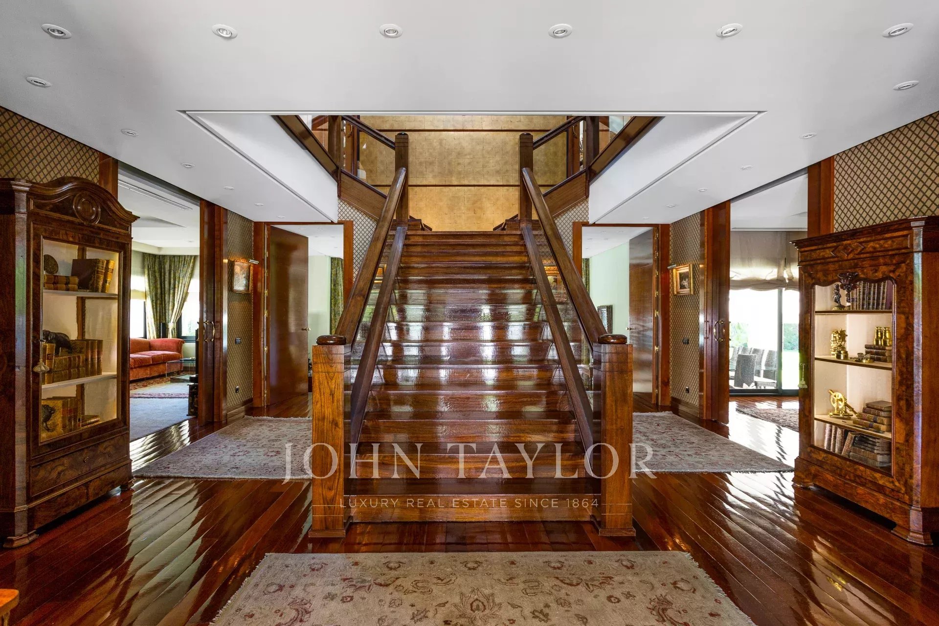 V přízemí se nachází obývací pokoj ve dvou velkých místnostech rozdělených do tří pokojů, dva salonky a jídelna. Obývací pokoje s krbem a dvě velké terasy, jedna pro léto a druhá pro zimu. Dále z přístupu toaleta pro hosty, obývací pokoj a soukromá rodinná jídelna. Velmi prostorná kuchyně se špičkovým značkovým vybavením a součástí je i pracovna. Spížní prostor, malá obslužná terasa v přístavbě a prádelna. Na druhém konci patra čtyři ložnice s vlastními koupelnami a šatnami a úložným prostorem na prádlo. Všechny ložnice s výhledem na les.