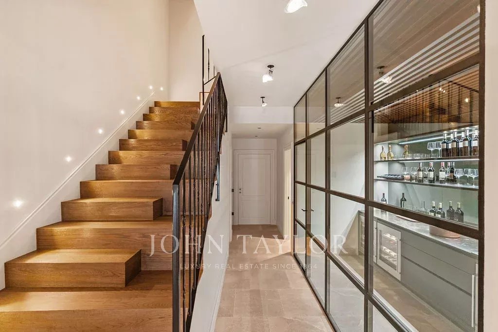 V přízemí vás přivítá příjemná vstupní hala s reprezentativním krbem, vysokými dřevěnými stropy a jedinečným schodištěm. V tomto patře se také nachází velkolepá vinárna, prádelna a garážové stání s dostatkem místa pro auta i kola.