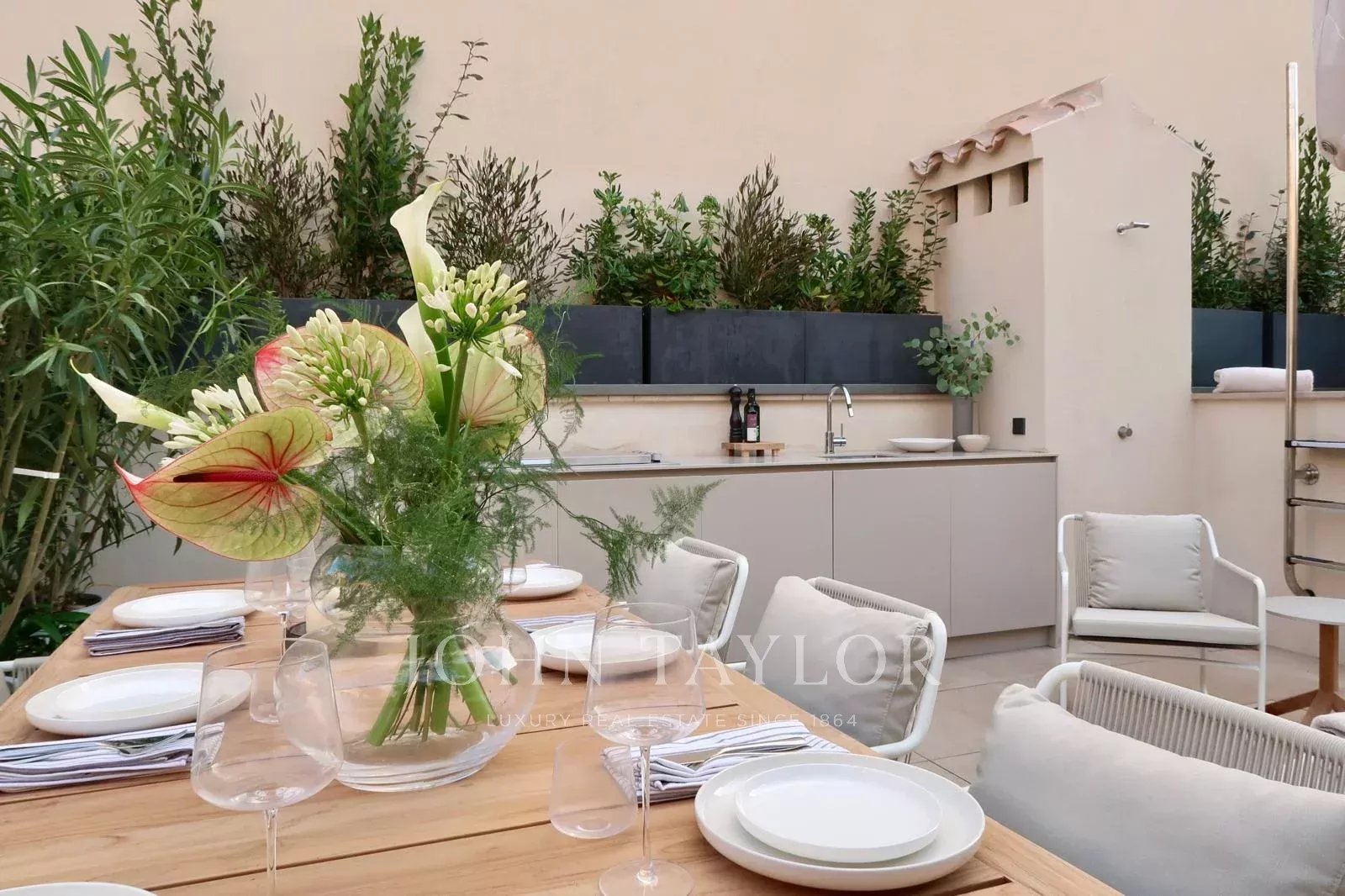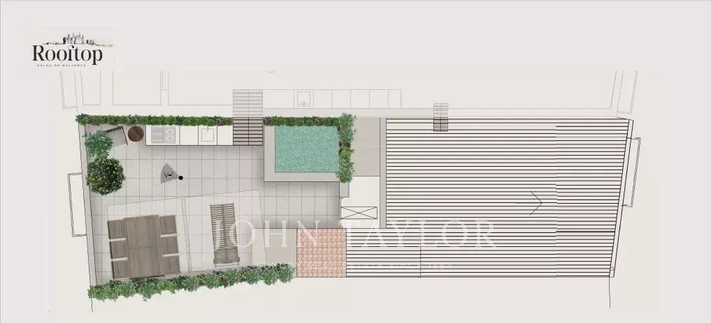 Střešní terasa: Střešní terasa, která je korunou celého objektu, nabízí idylický prostor pro odpočinek a zábavu. Těšit se můžete na soukromý bazén, letní kuchyň, venkovní sprchu a vyhrazené prostory pro stolování, lenošení a odpočinek - to vše s úchvatným výhledem na historické panorama Palmy.