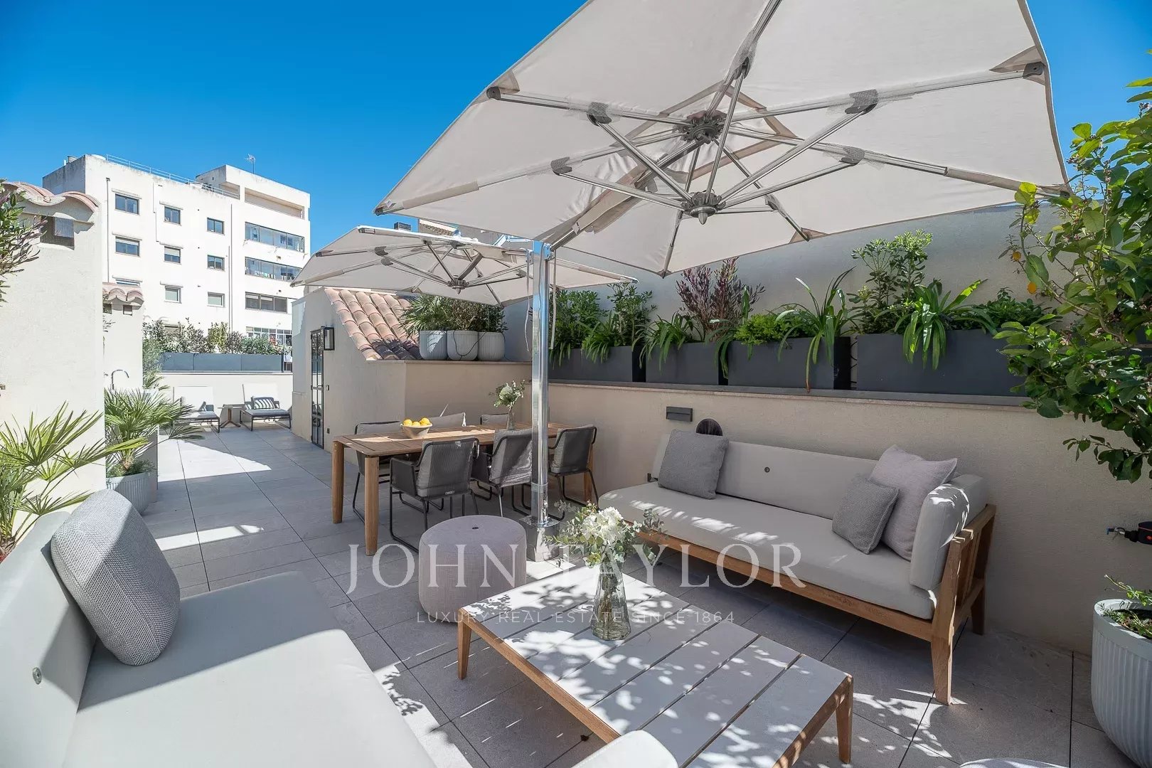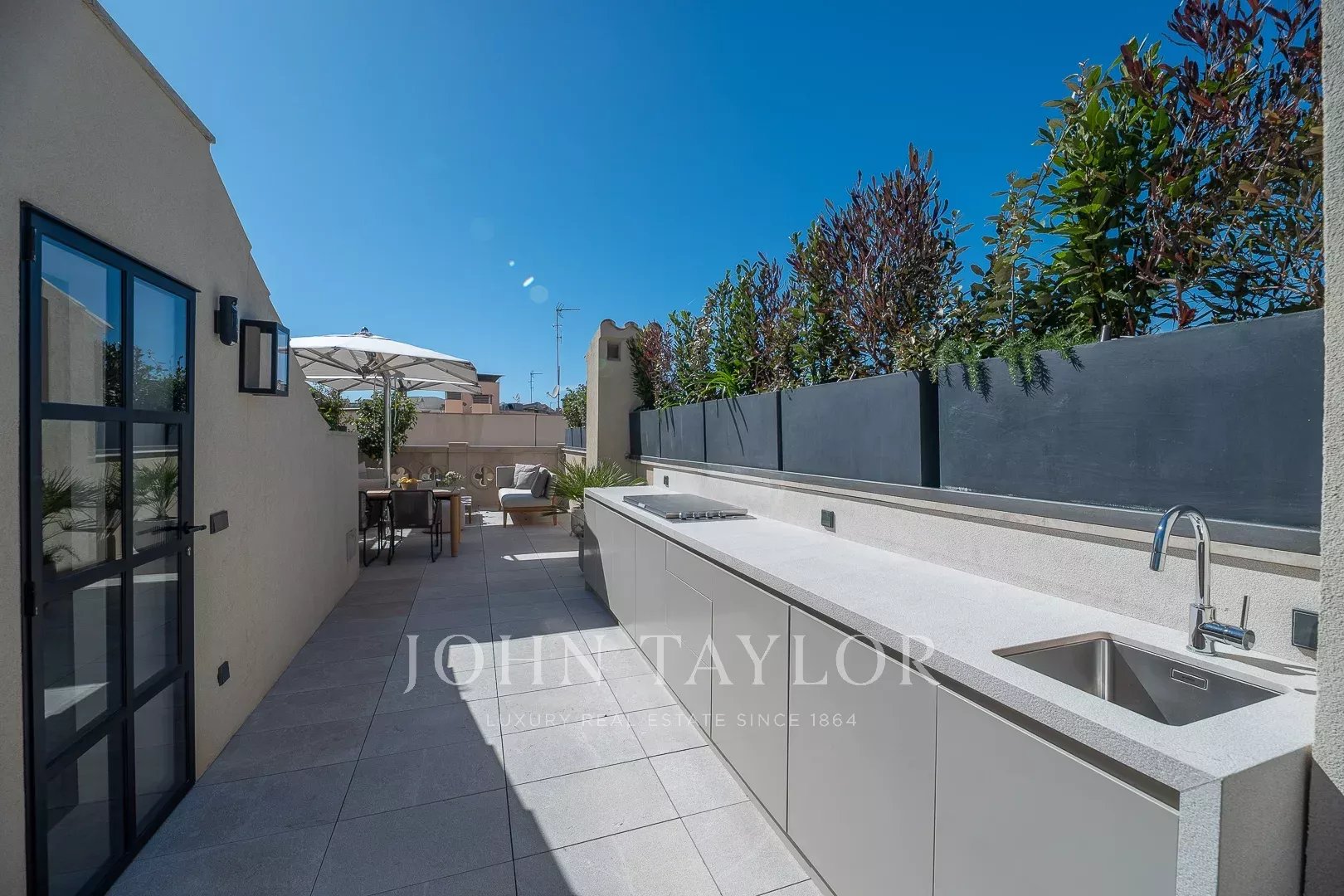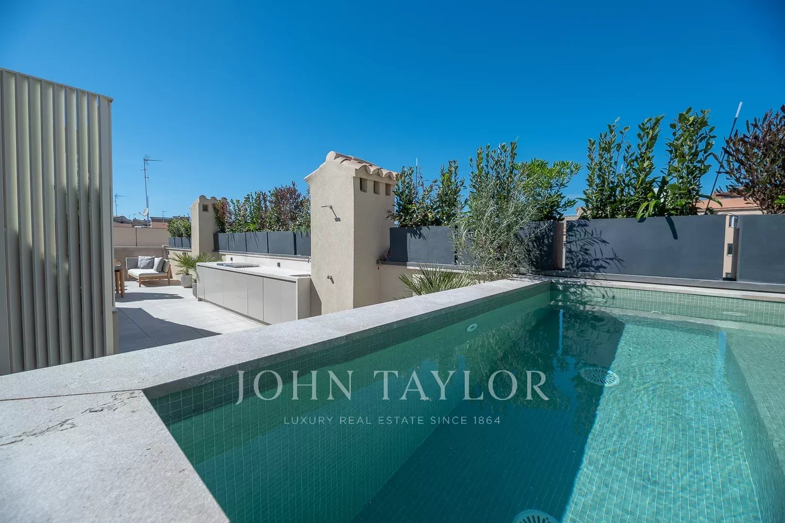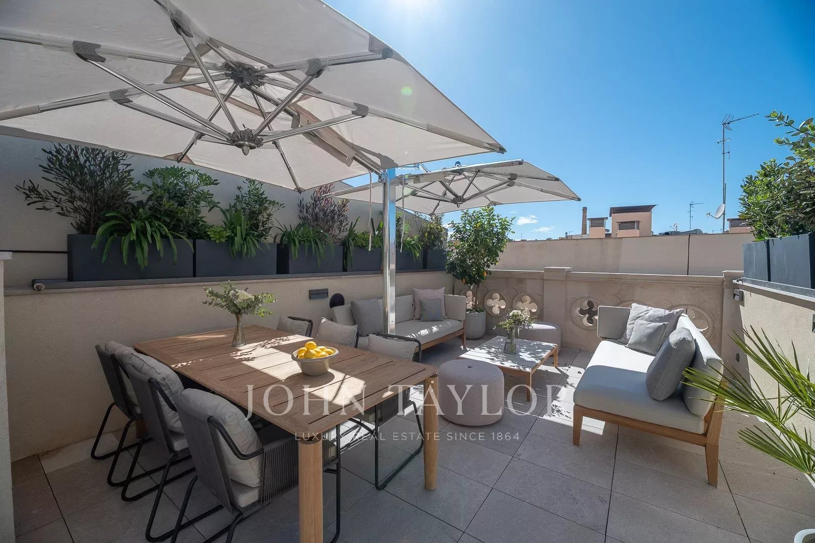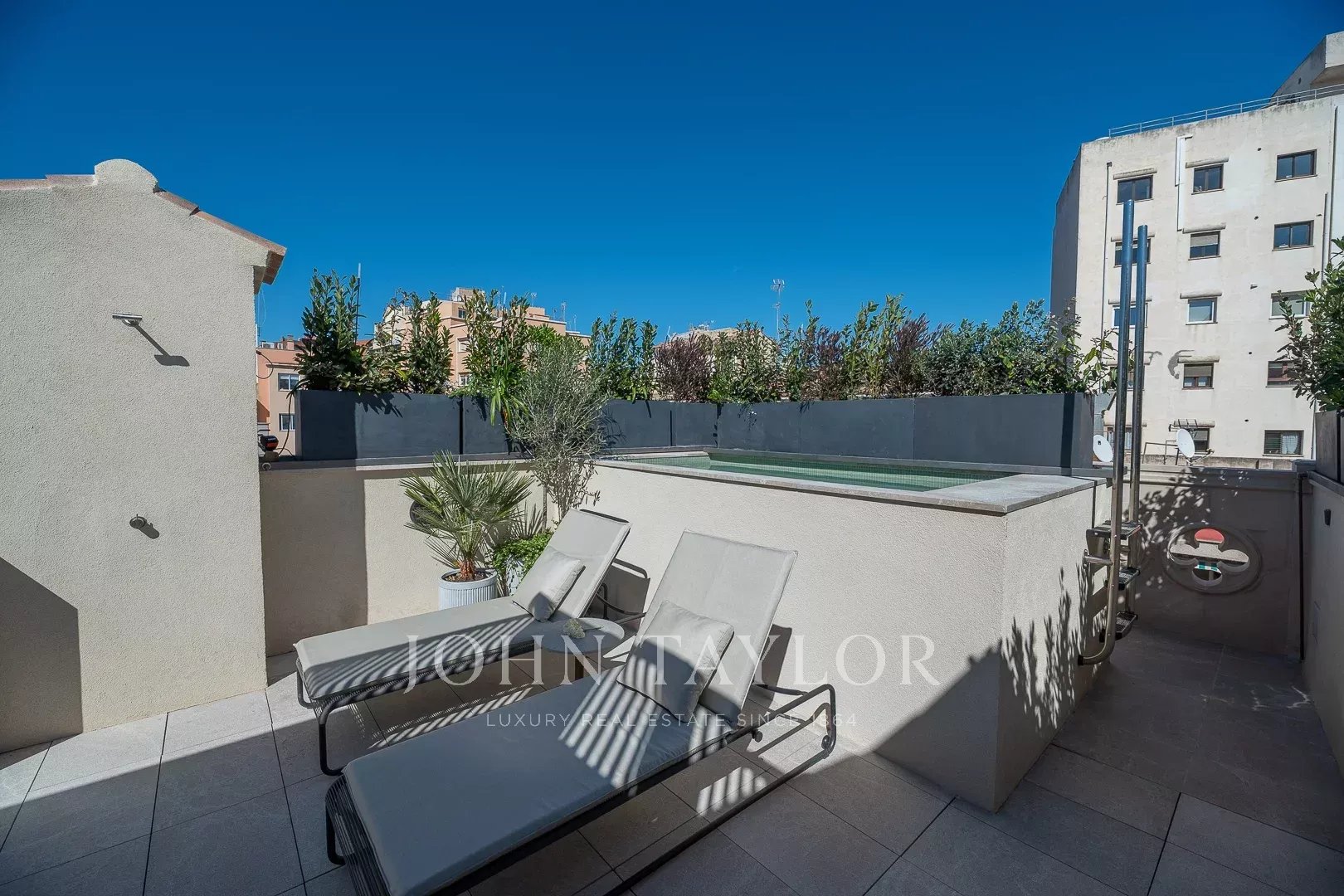 Střešní terasa: Královská perla nemovitosti, střešní terasa, nabízí idylický prostor pro odpočinek a pořádání akcí. Užijte si soukromý plavecký bazén, letní kuchyň, venkovní sprchu a vyhrazené prostory pro stolování, odpočinek a relaxaci — vše s dechberoucím výhledem na historickou siluetu Palmy.