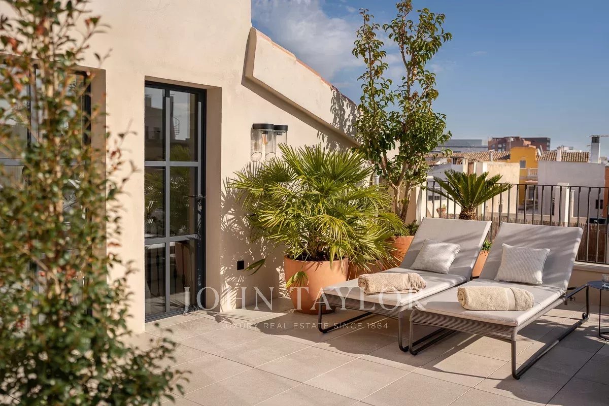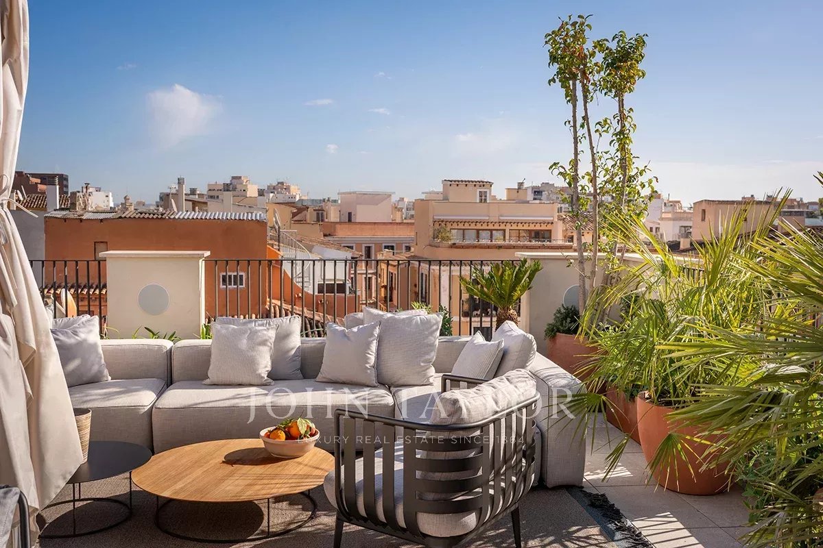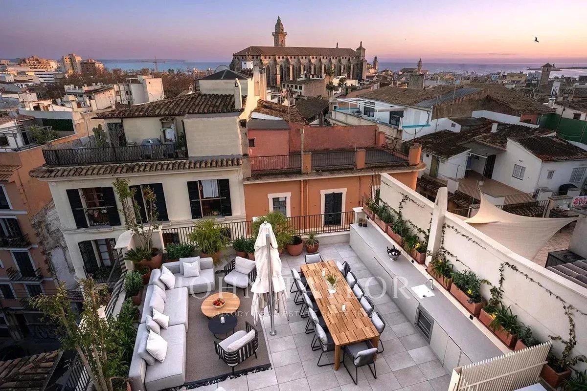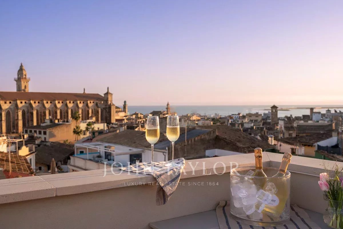 Tento na míru navržený design nabízí plynulý přechod z přízemí na střešní terasu, odkud se vám naskytne rozsáhlý výhled na katedrálu a azurové Středozemní moře, zatímco si budete užívat slunce na lehátkách nebo jídlo připravené v plně zařízené venkovní kuchyni. V doplňkovém střešním baru se šampaňským máte nerušený 360stupňový výhled na vše od zálivu Palma až po impozantní horskou kulisu. Jedná se skutečně o jeden z nejúchvatnějších výhledů na staré město Palmy.