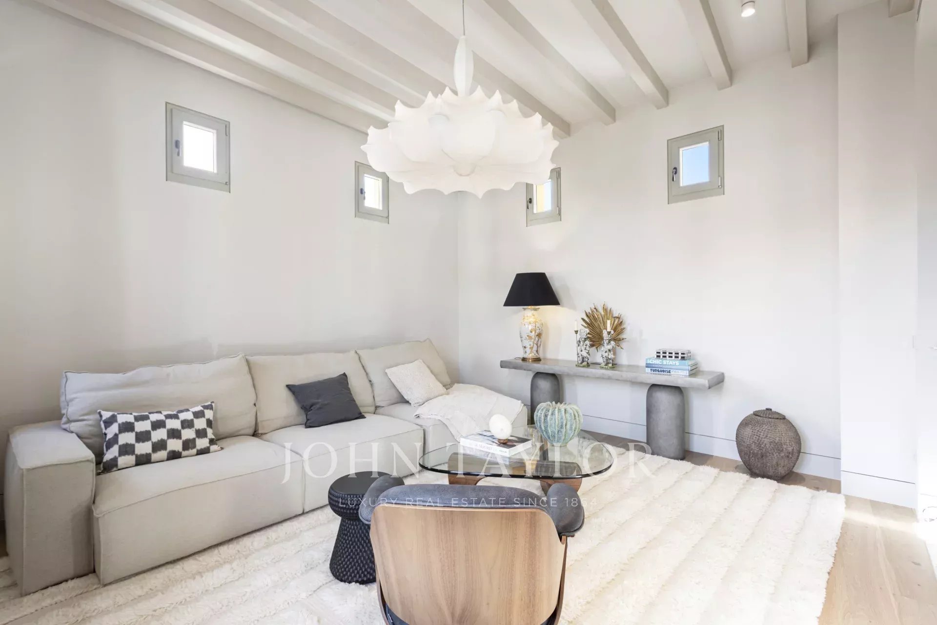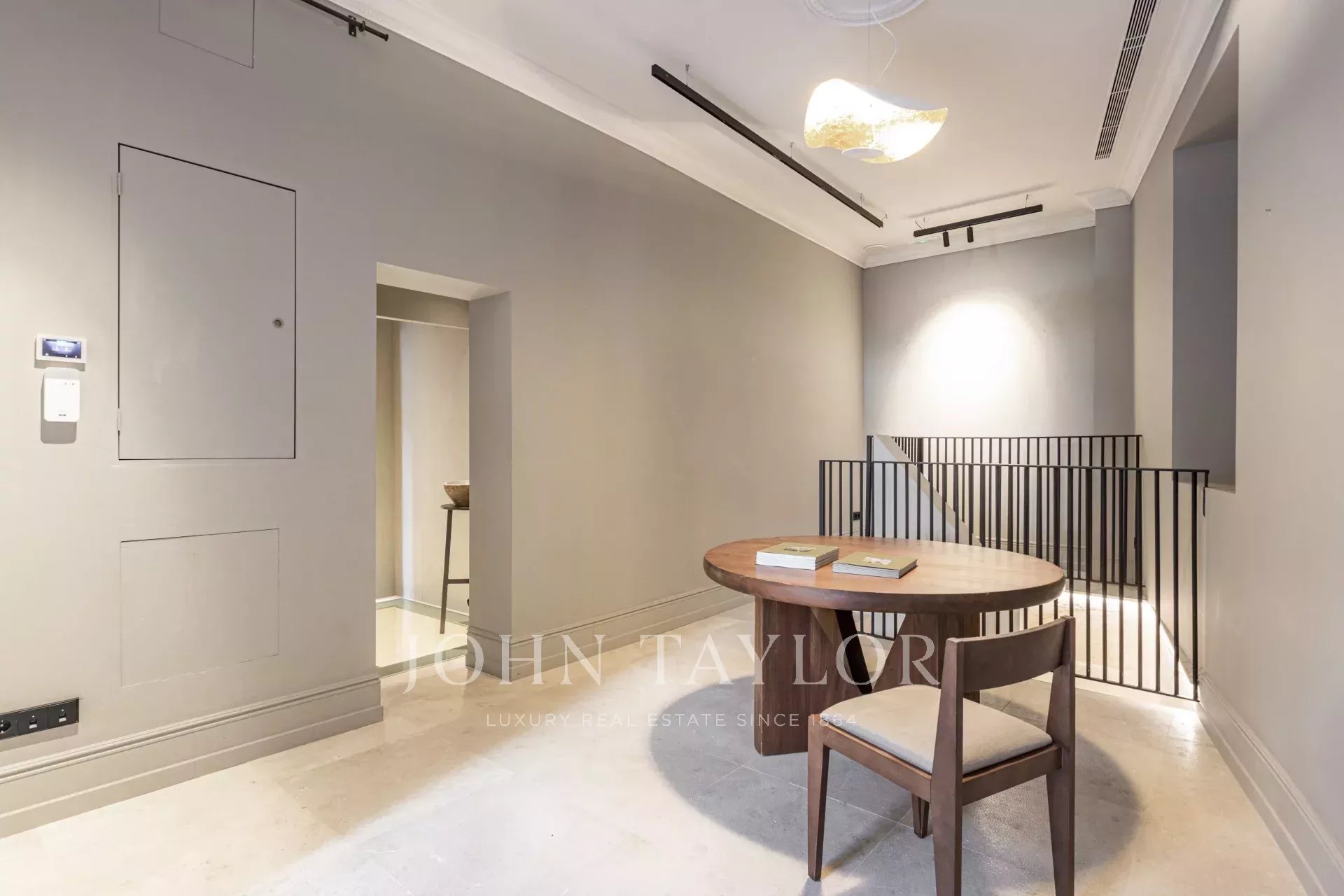 Prostorné čtvrté patro se skládá z několika společenských prostor, jídelní části a kuchyně. Výtah vede přímo do třetího i čtvrtého patra. Celým půdorysem prochází masivní olejované dubové podlahy s vytápěním. Odtud vede schodiště na střešní terasu s nádherným výhledem. Stropy zdobí robustní trámy v aktualizovaném vintage provedení. Ve společenské části najdete plynový krb z mramoru Calacatta Gold a dvojité dveře otevírající se na náměstí Placa Cort. Dům je kompletně zařízen ručně vybranými kousky od nejlepších designérů a výrobců, jako je krásná lampa od Floos, konferenční stolek od Vitry, příborník a koberec od Dusty Deco. A nesmíme zapomenout na klasické křeslo Eames Lounge Chair.
