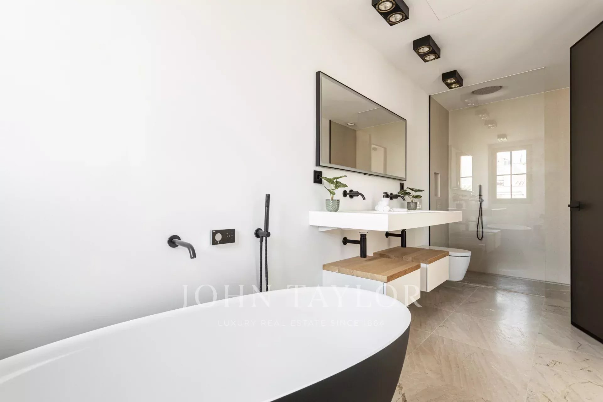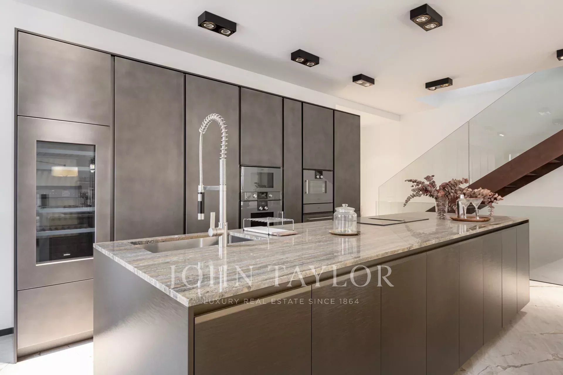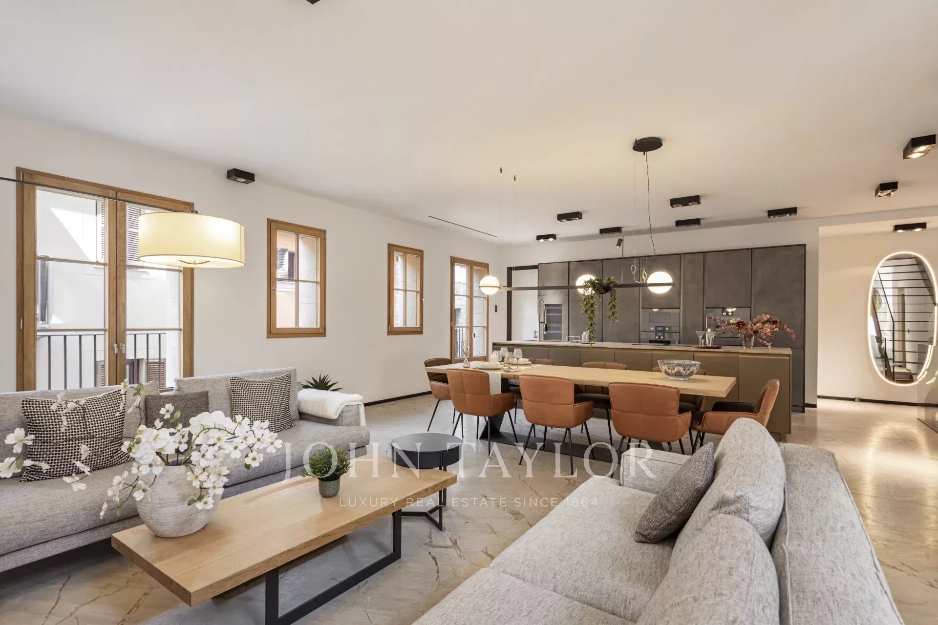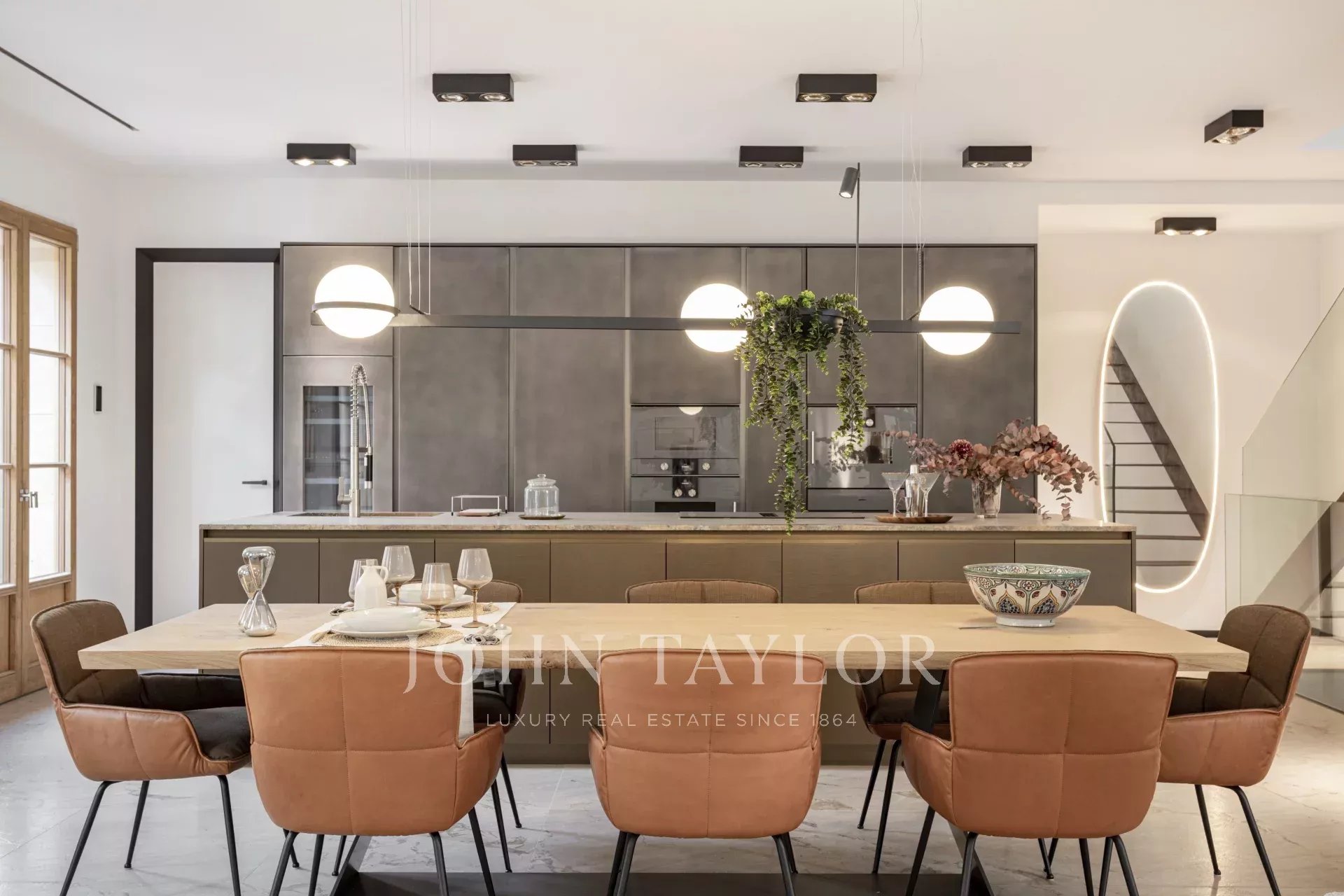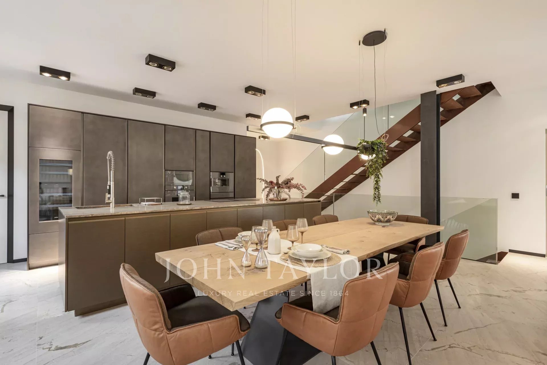 Prvotřídní materiály, jako je přírodní kámen a dubové dřevo, výška stropů až 4,5 metru a elegantní designové schodiště propůjčují nemovitosti jedinečný a sofistikovaný charakter.