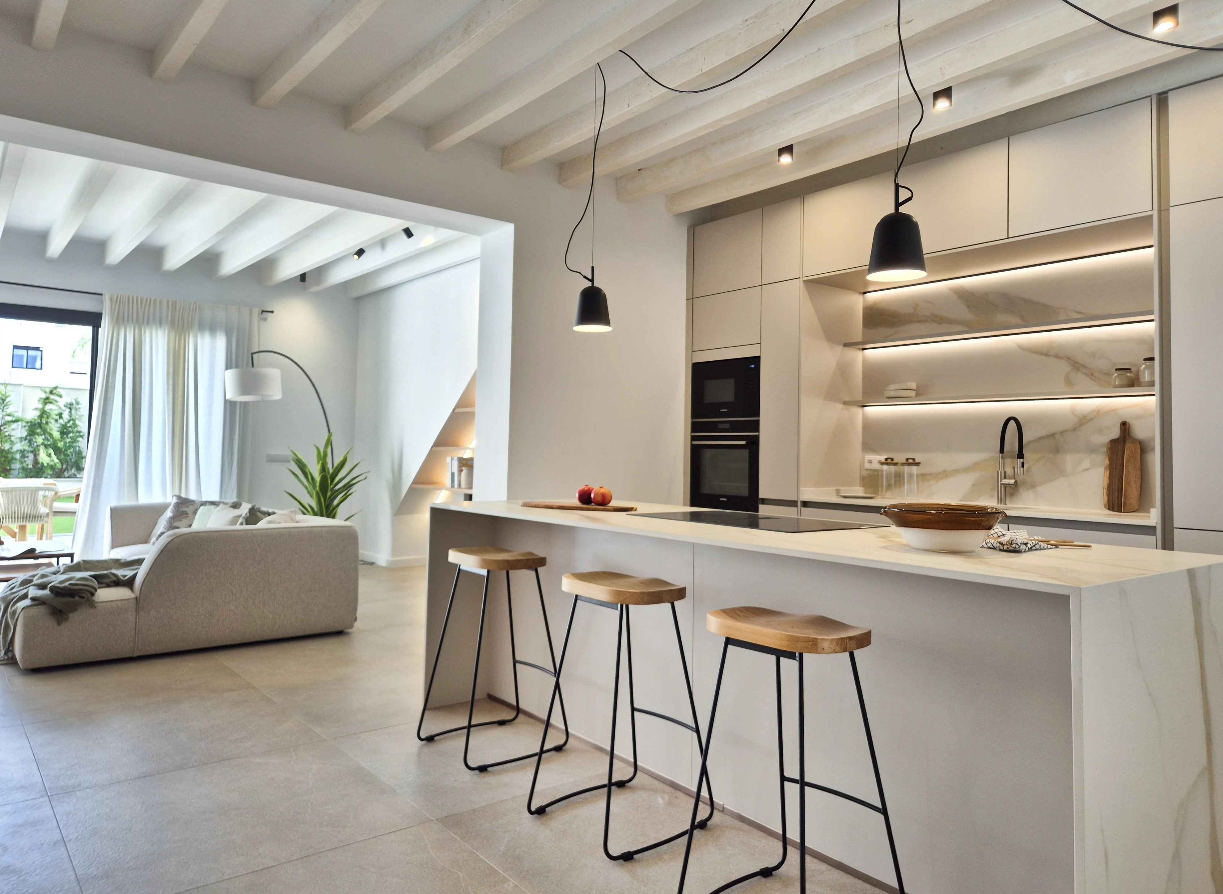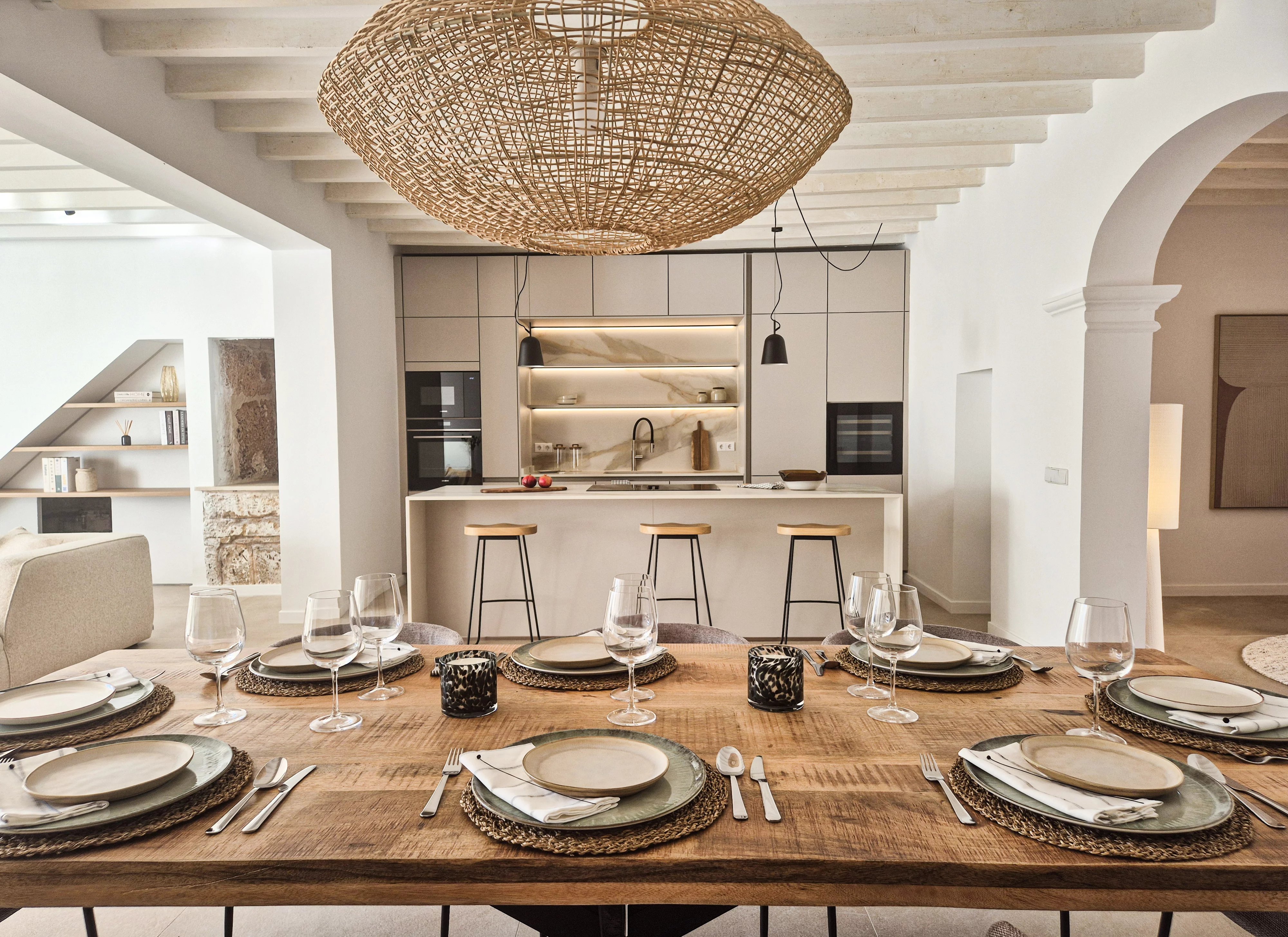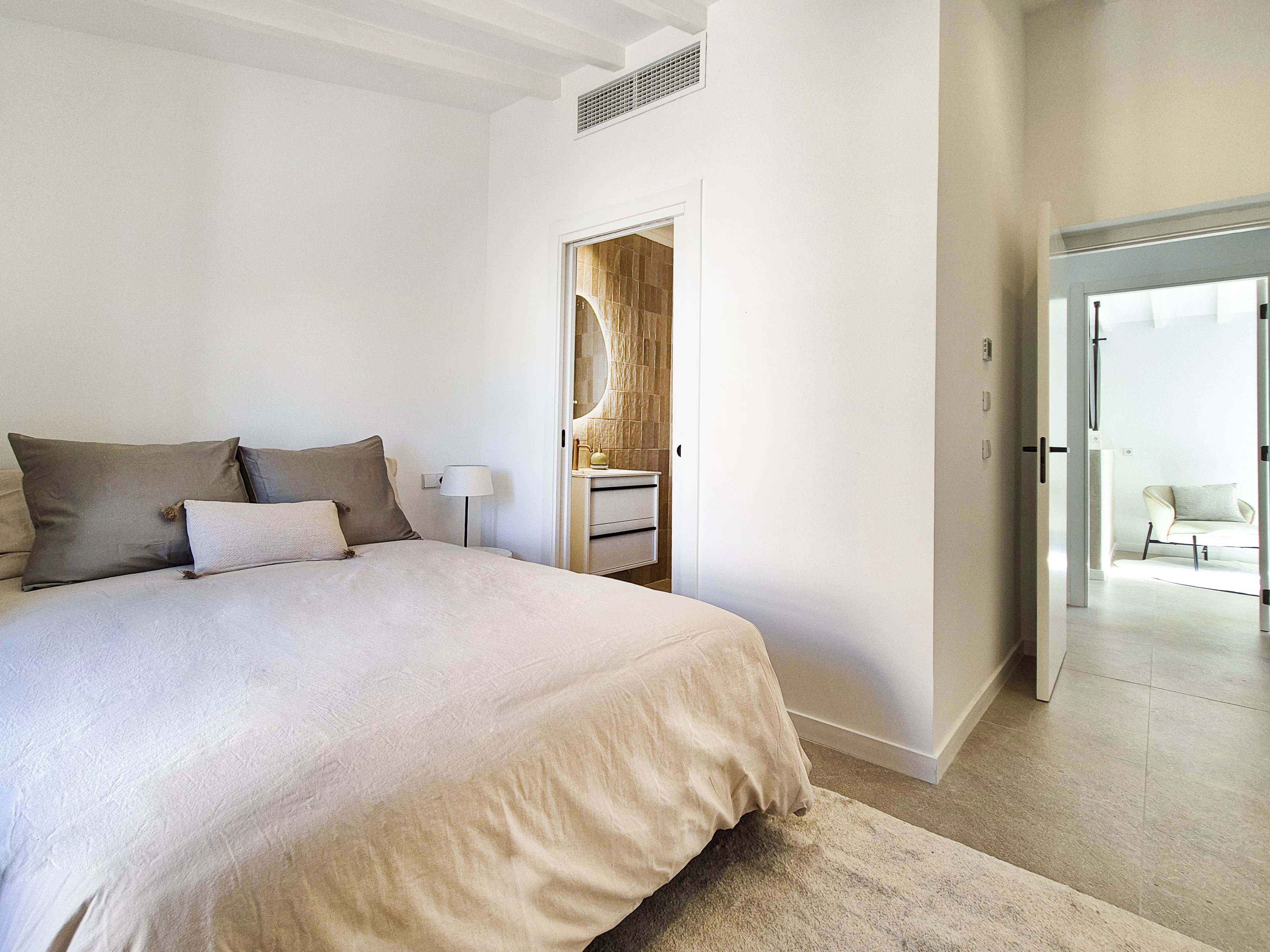 Stropy s dvojitou výškou, kamenné akcenty a prosluněný otevřený obývací a jídelní prostor vedou na soukromou terasu a upravenou zahradu, ideální pro zábavu nebo odpočinek pod mallorským sluncem. Tři prostorné ložnice s vlastní koupelnou v patře poskytují maximální soukromí a vytvářejí klidné útočiště.