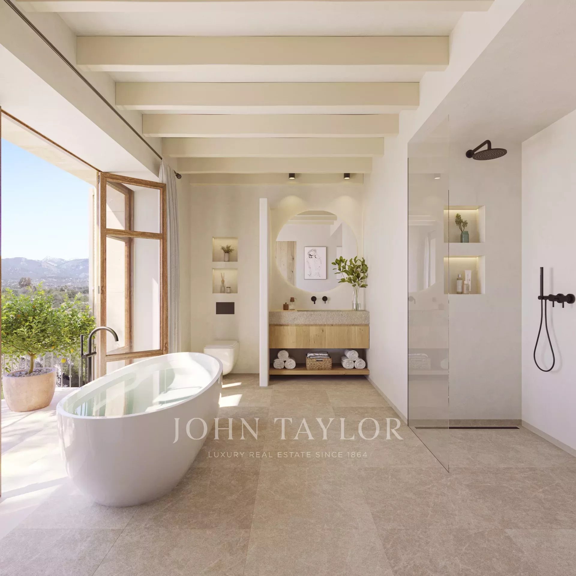 Tento dvojdomek s bazénem je postaven v klidné ulici v útulné a krásné vesničce Santa Maria, jen pár kroků od centra města s živými kavárnami, restauracemi a lidmi. Nemovitost bude mít tradiční fasádu a moderní, vysoce kvalitní interiér. Velké dřevěné dveře vedou do nádherného domu, rozloženého do 3 podlaží. Součástí je také soukromá garáž, zahrada s bazénem a také terasa v každém patře domu, která nabízí úchvatný výhled na pohoří Tramuntana. Tato nemovitost, která dokonale kombinuje tradiční mallorskou architekturu s moderním bydlením, neponechává nic náhodě.
