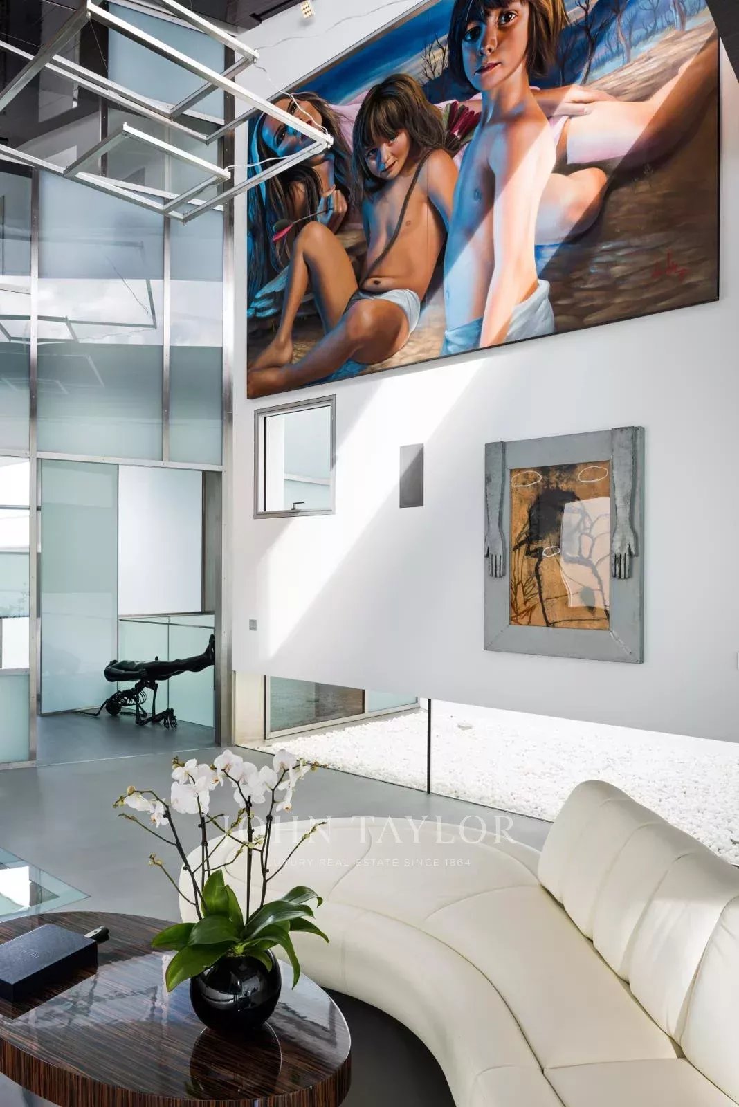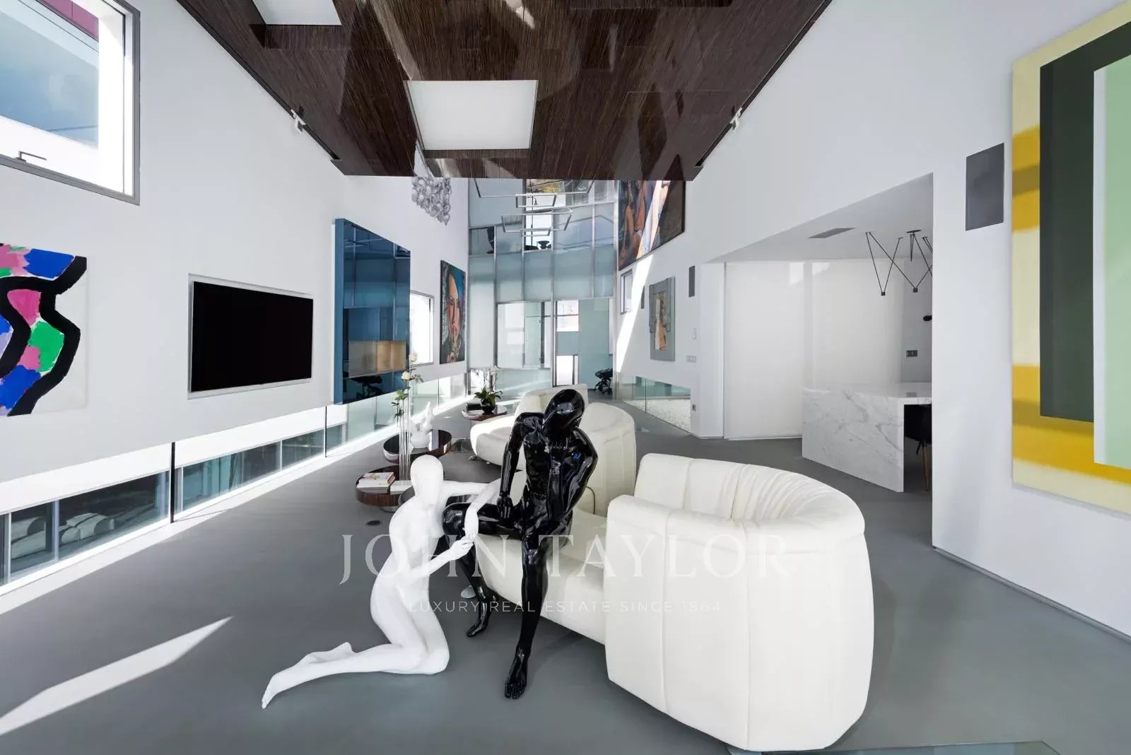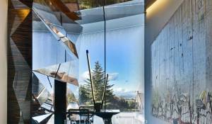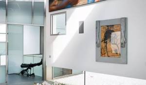 mezi neosobním a dynamickým světem exteriéru a pohodlným a klidným světem interiéru. Cestu nám ukazuje zurčení vody. U vstupu se nachází výstavní prostor. Ve dvojité výšce pokračuje místnost z oceli a skla, která skrývá přístup do pokojů.