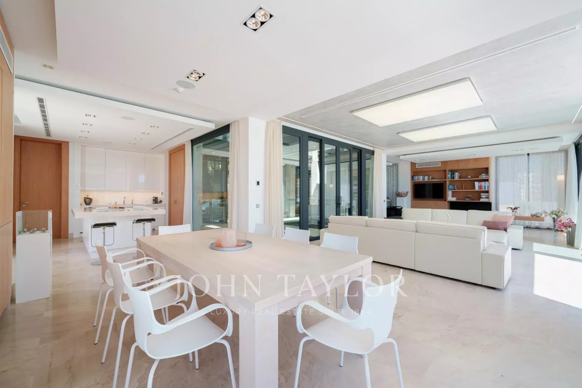 Objekt vyniká působivým architektonickým řešením a prosklenou fasádou orientovanou k moři, která zajišťuje maximální přirozené osvětlení a výhled na moře z každé místnosti. Po vjezdu do soukromé garáže máte k dispozici výtah i schodiště do nižších pater. Druhé podlaží zahrnuje tři ložnice, každou s vlastní koupelnou. Třetí úroveň je zcela vyhrazena pro každodenní bydlení. Plně vybavená kuchyň a jídelna plynule přecházejí do obývacího pokoje, který má přímý vstup do venkovního obývacího pokoje s útulným krbem, terasou a bazénem. Spodní úroveň zahrnuje domácí kino a soukromou posilovnu. Vila je postavena pouze z těch nejkvalitnějších materiálů a je vybavena centrální klimatizací, podlahovým vytápěním, osmózovým systémem a domácí automatizací.