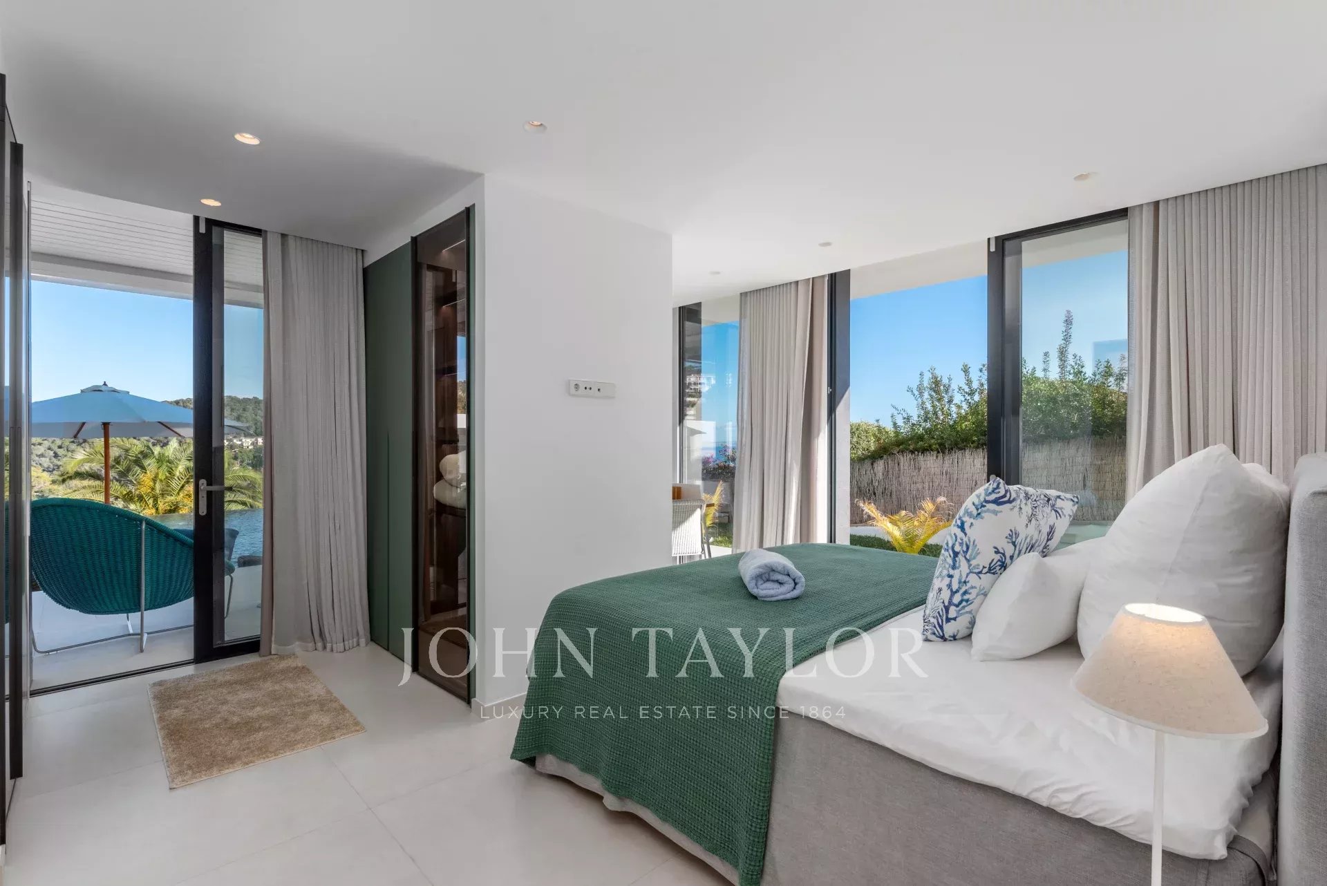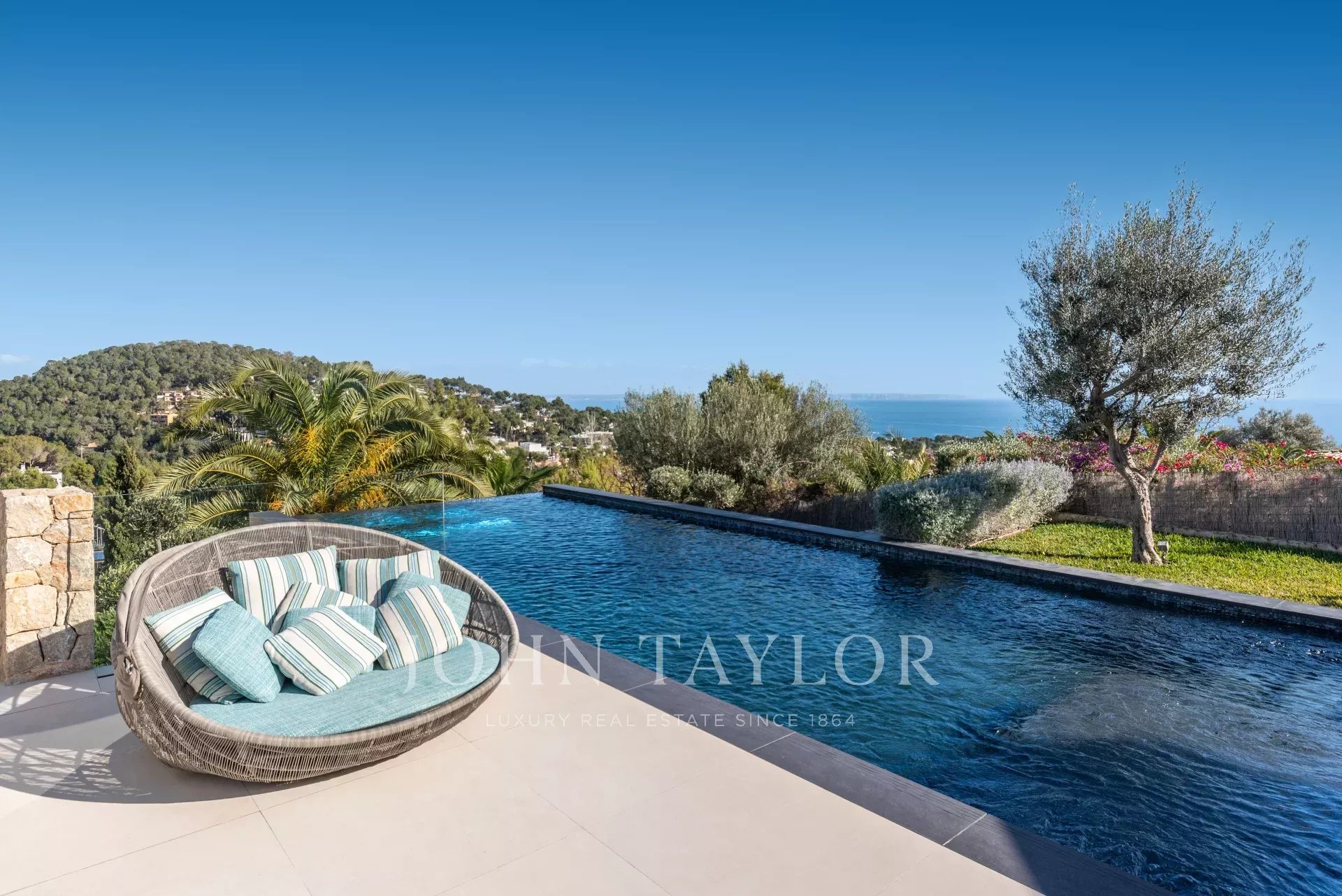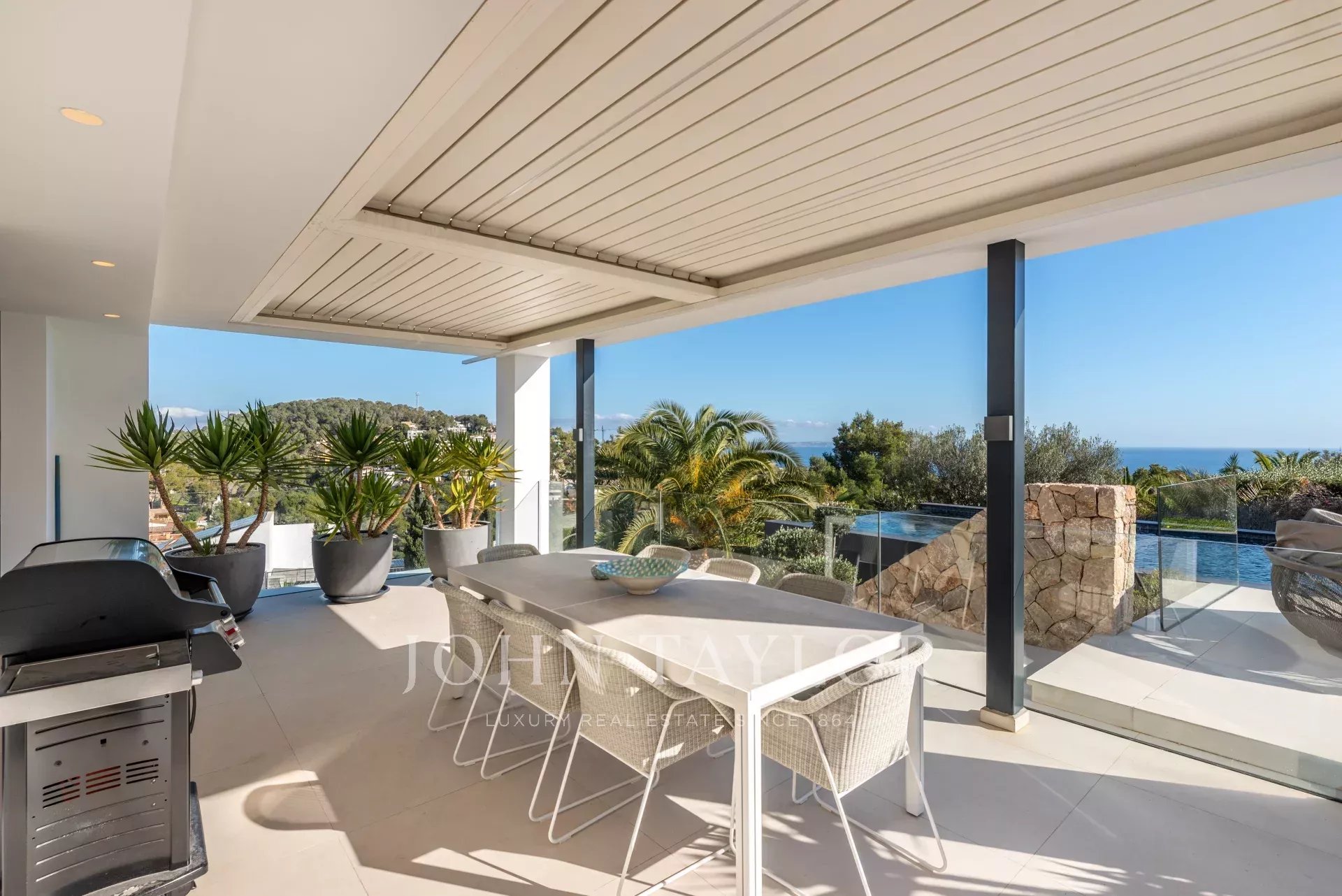 V srdci Costa d'en Blanes, jedné z nejvyhledávanějších rezidenčních oblastí na jihozápadě Mallorky, se nachází tato působivá luxusní vila. Její výsadní poloha na vrcholu kopce zaručuje nejen soukromí a klid, ale také nádherný panoramatický výhled na Středozemní moře, který se táhne až k obzoru a mění každý západ slunce v umělecké dílo. Tato elegantní, nově postavená nemovitost kombinuje moderní architektonický design s nejkvalitnějšími povrchovými úpravami. Vila se zastavěnou plochou 517 m² na velkorysém pozemku o rozloze 1 374 m² nabízí 5 prostorných ložnic, z nichž každá má vlastní koupelnu, a poskytuje tak maximální pohodlí a soukromí. Hlavní obývací pokoj, zaplavený přirozeným světlem díky velkým oknům, se otevírá do moderní kuchyně s otevřeným konceptem, dokonale vybavené a navržené tak, abyste si mohli vychutnat kulinářské umění a zároveň rozjímat nad nekonečnou modří moře. Odtud je přímý vstup na terasu a nekonečný bazén, který vytváří ideální prostředí pro zábavu a relaxaci. Venku vila odhaluje svůj skutečný půvab: elegantní domek u bazénu, nádherně upravená zahrada a dvojgaráž, doplněné nejmodernější technologií domácí automatizace, která zajišťuje maximální pohodlí a efektivitu. Tato vila není jen nemovitostí, ale vyjádřením stylu a sofistikovanosti, ideální pro ty, kteří hledají dokonalost v každém detailu. Objevte dokonalou harmonii luxusu, pohodlí a polohy.