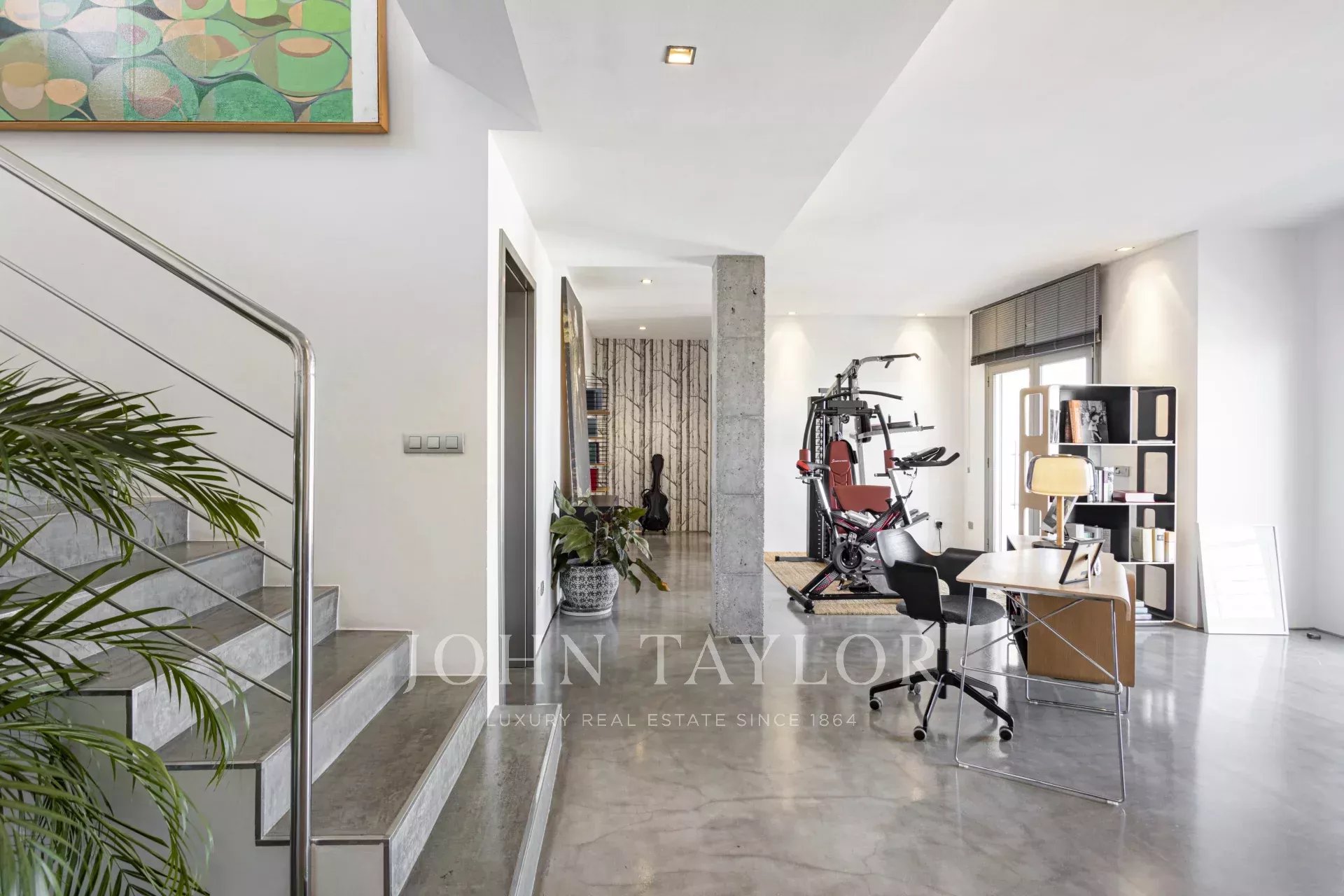 V dolním patře jsou dvě hostinské ložnice s vlastní koupelnou, pracovna, soukromá posilovna (nebo čtvrtá ložnice) a zázemí pro personál — všechny s přístupem k bazénu a sluneční terase. Zde si můžete zaplavat v klidu kopců, přesto jen pár minut od restaurací, přístavu a mezinárodních škol v Palmě.