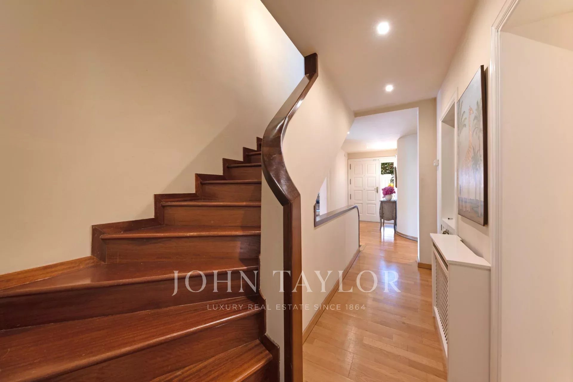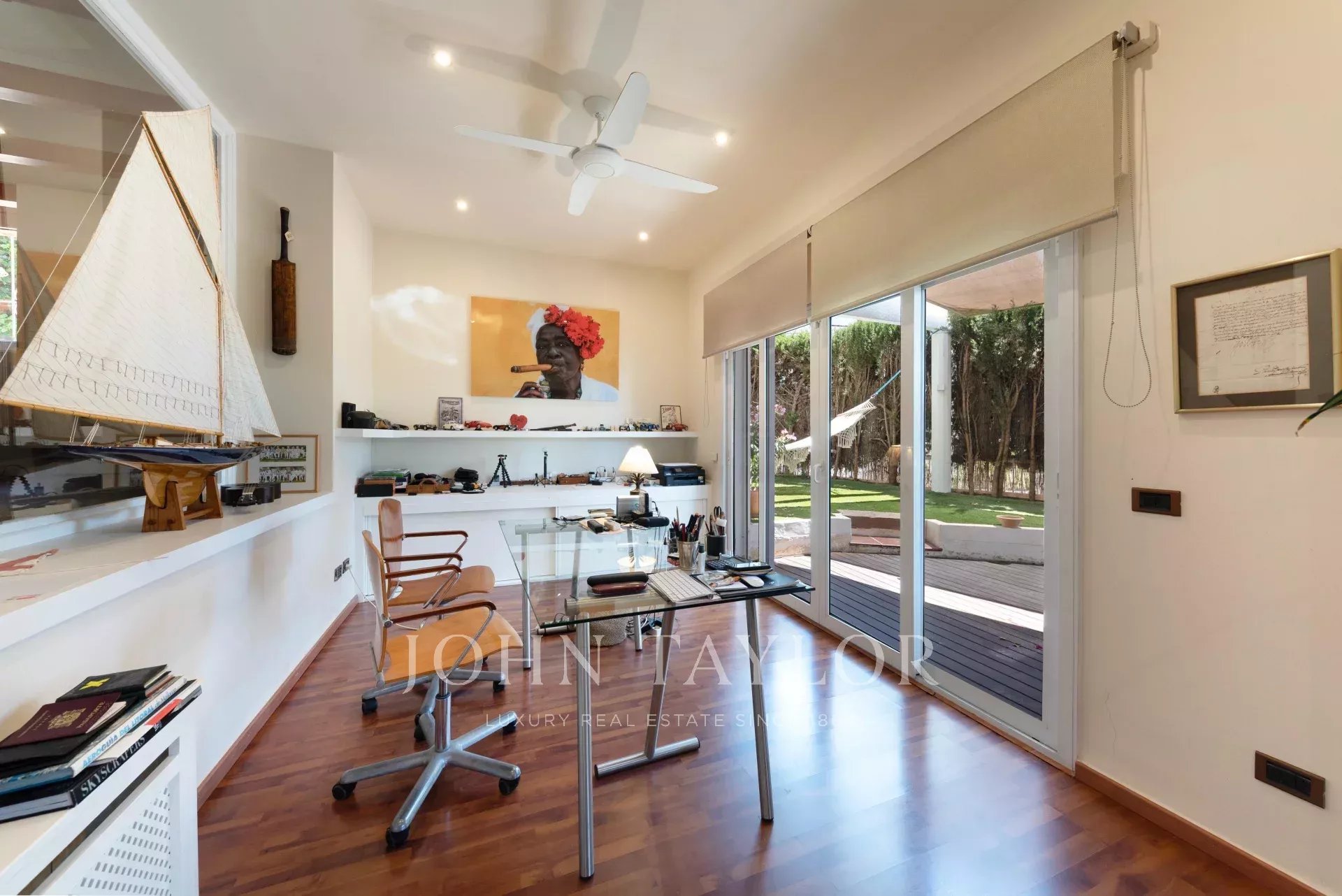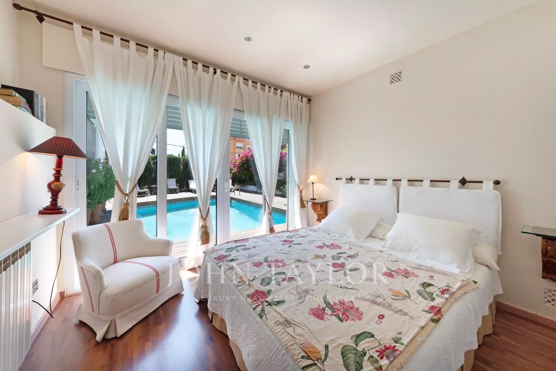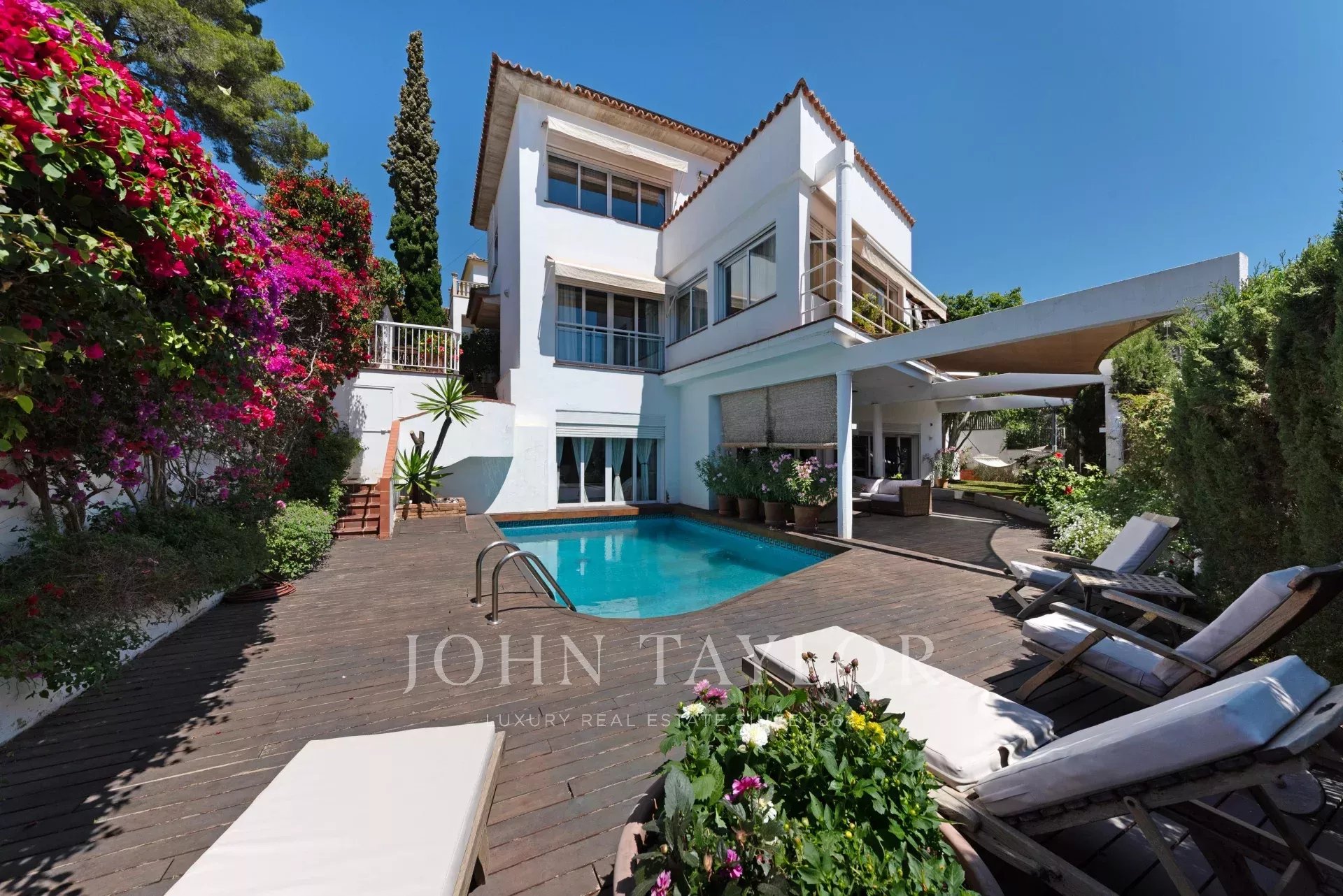Tento krásný dům s částečným výhledem na moře, zahradou a bazénem je ideálním místem pro trávení volného času. Rozložení ve třech podlažích a garáž nabízí spoustu prostoru a všestrannosti. V prvním patře se nachází vstupní hala, velký obývací pokoj s jídelnou a terasou, kuchyně s jídelním koutem, spíž, prádelna. Jsou zde 2 ložnice, jedna z nich s vlastní koupelnou a šatnou, plus velká toaleta. V horním patře je obývací pokoj, 2 ložnice, 1 koupelna a 1 terasa. Ve spodním patře je TV místnost s plynovým krbem, 2 ložnice, 1 koupelna a další pokoj, vše se vstupem na terasu a zahradu s bazénem. Suterén nabízí velký prostor pro několik aut.