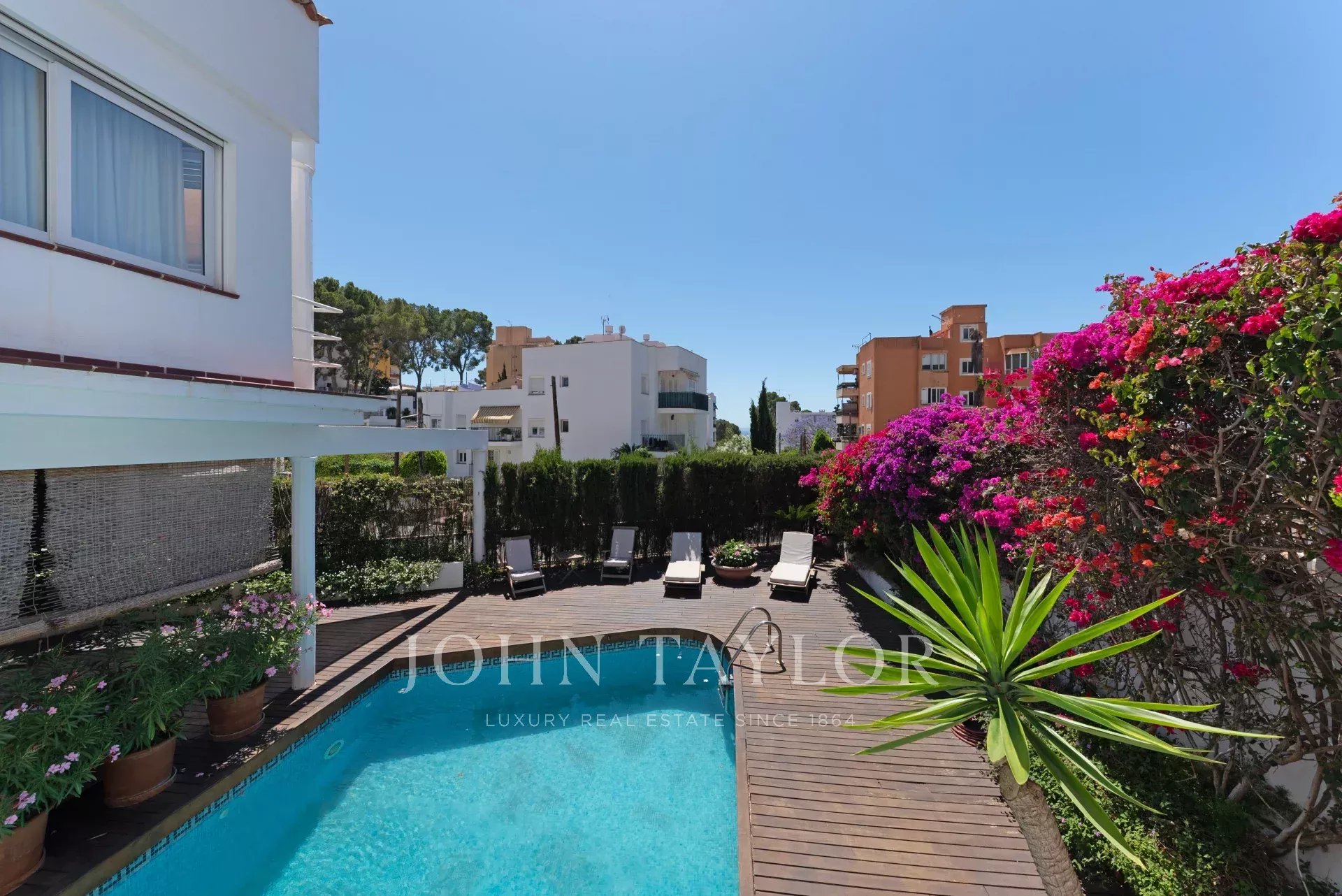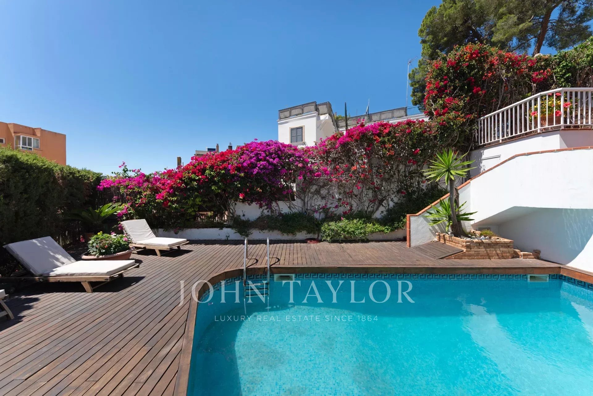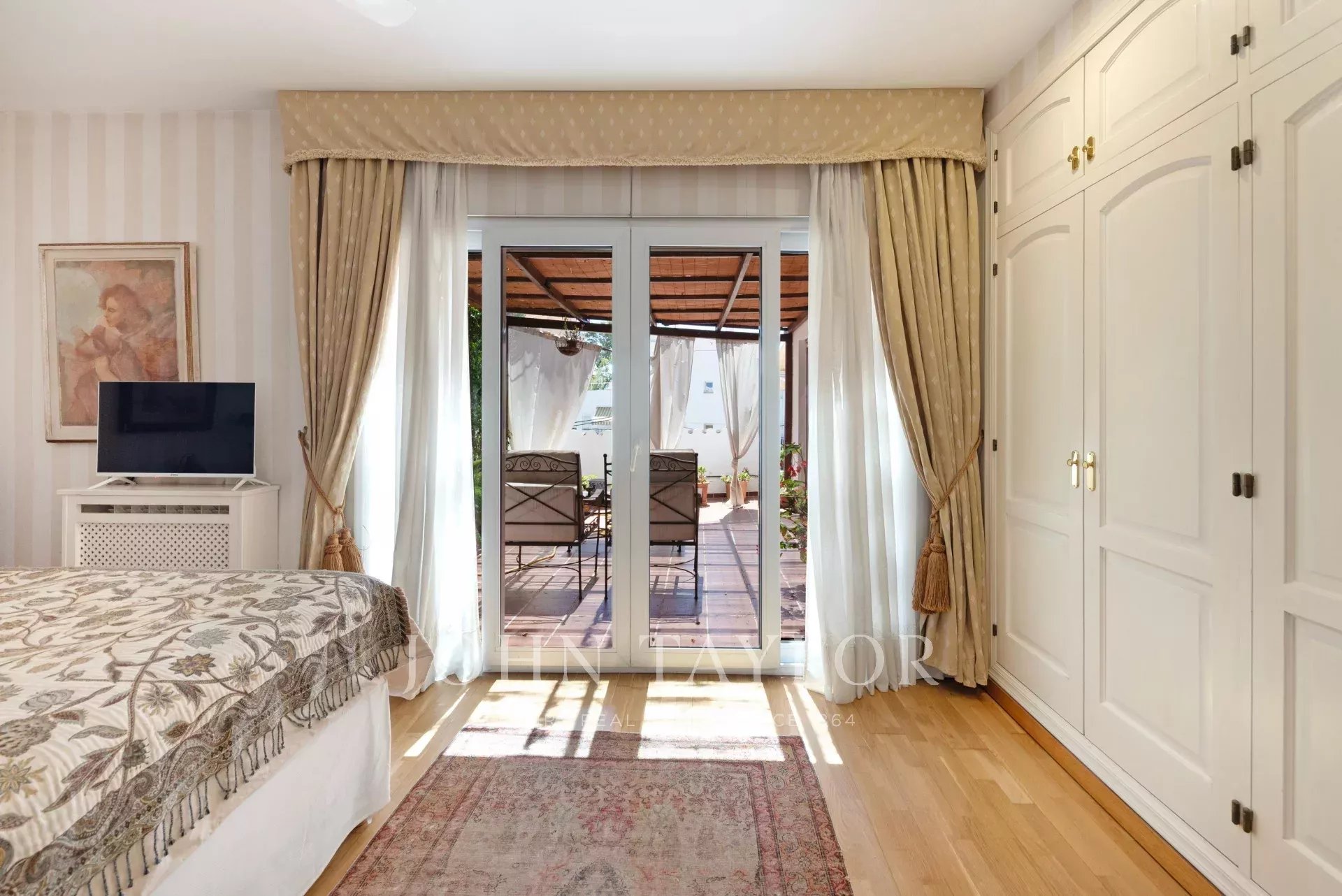 Tento krásný dům s částečným výhledem na moře, zahradou a bazénem je ideálním místem pro trávení volného času. Rozložení ve třech podlažích a garáž nabízí spoustu prostoru a všestrannosti. V prvním patře se nachází vstupní hala, velký obývací pokoj s jídelnou a terasou, kuchyně s jídelním koutem, spíž, prádelna. Jsou zde 2 ložnice, jedna z nich s vlastní koupelnou a šatnou, plus velká toaleta. V horním patře je obývací pokoj, 2 ložnice, 1 koupelna a 1 terasa. Ve spodním patře je TV místnost s plynovým krbem, 2 ložnice, 1 koupelna a další pokoj, vše se vstupem na terasu a zahradu s bazénem. Suterén nabízí velký prostor pro několik aut.