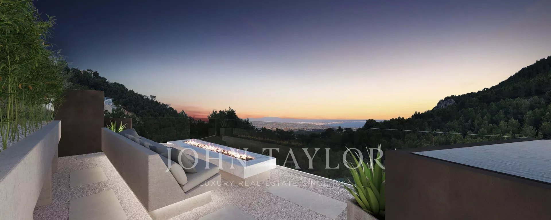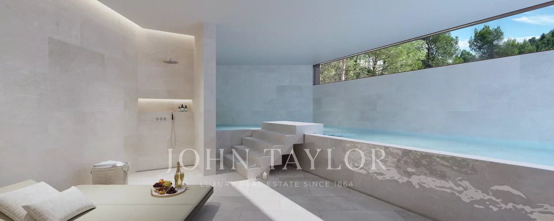 Právě dokončená vila nekompromisní kvality a stylu. Přelomový design a konstrukce vily jsou naprostou pastvou pro oči a příkladem pro budoucí domy. Skutečný trendsetter! Užijte si naprosté soukromí v této výjimečné nemovitosti. Masivní vstupní dveře vás z úrovně ulice zavedou do horní obytné části, kde najdete odpočinkový salonek, bar a fantastický nekonečný bazén, částečně prosklený. Zde si vychutnáte úchvatný výhled na záliv Palma. Tento výhled překonává pouze střešní terasa nad ním, na kterou se dostanete po vnějším schodišti. V celém domě je také výtah. Pod úrovní bazénu se nachází hlavní společenská zóna: prostorná, otevřená kuchyň/jídelna a obývací část s plynulým přechodem na velkorysou, částečně krytou terasu. O úroveň níže se nacházejí čtyři ložnice a dvě koupelny sdílené po dvou pokojích. Nachází se zde také velký vinný sklep. Hlavní apartmá zabírá celou úroveň přízemí s nadstandardně velkou šatnou, otevřenou koupelnou, saunou a přímým vstupem do zahrady, kde na vás čeká vířivka. V nejnižší úrovni se nachází vyhřívaný krytý bazén s lázněmi a posilovnou. Mnoho technických prvků, jako je například systém cirkulace vzduchu, vychází z návrhu z leteckého průmyslu (developer pochází z tohoto odvětví) a i ostatní prvky jsou mimořádně orientované na budoucnost a nejmodernější. Výsledek: energeticky úsporný a jednoduše jedinečný komfort.