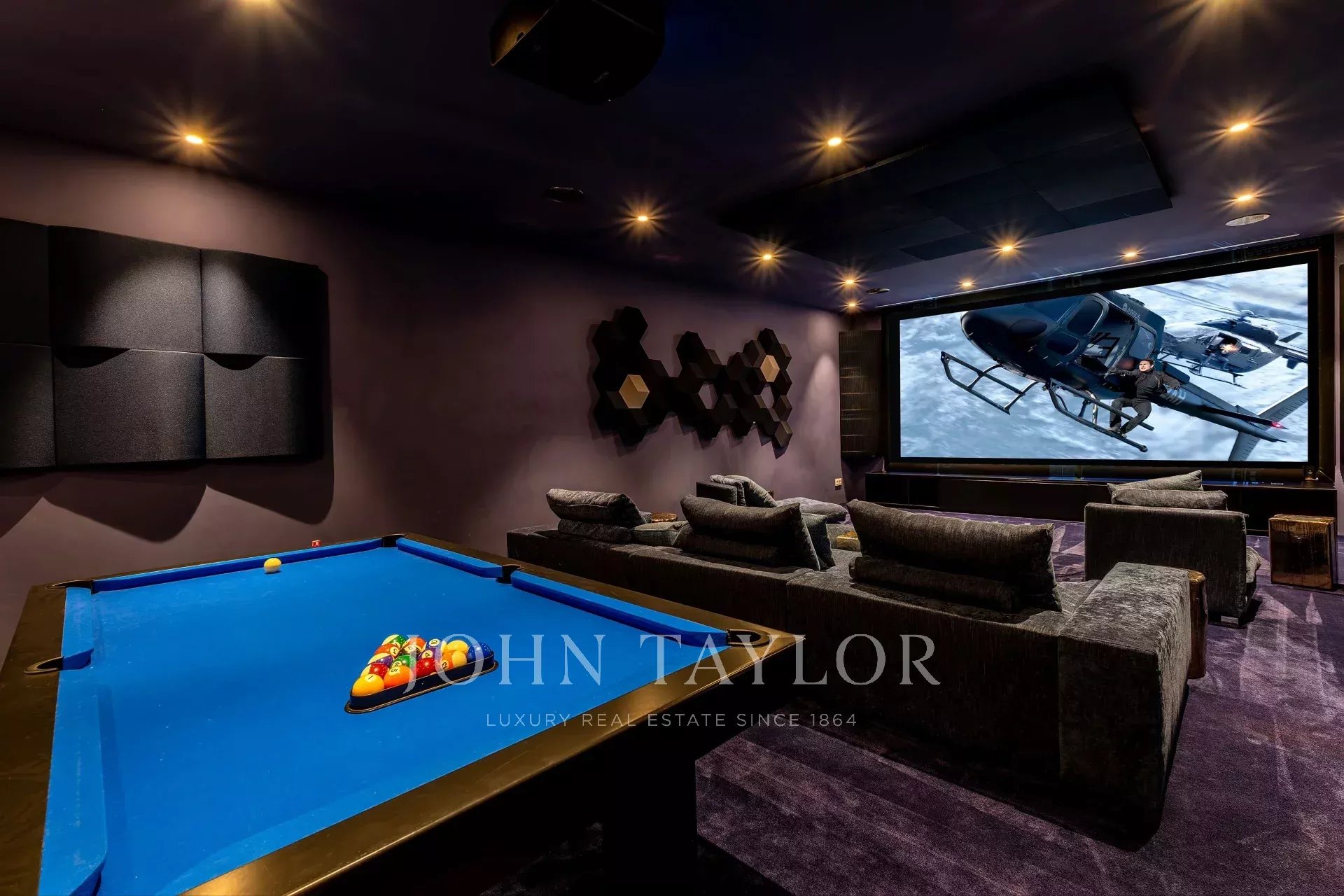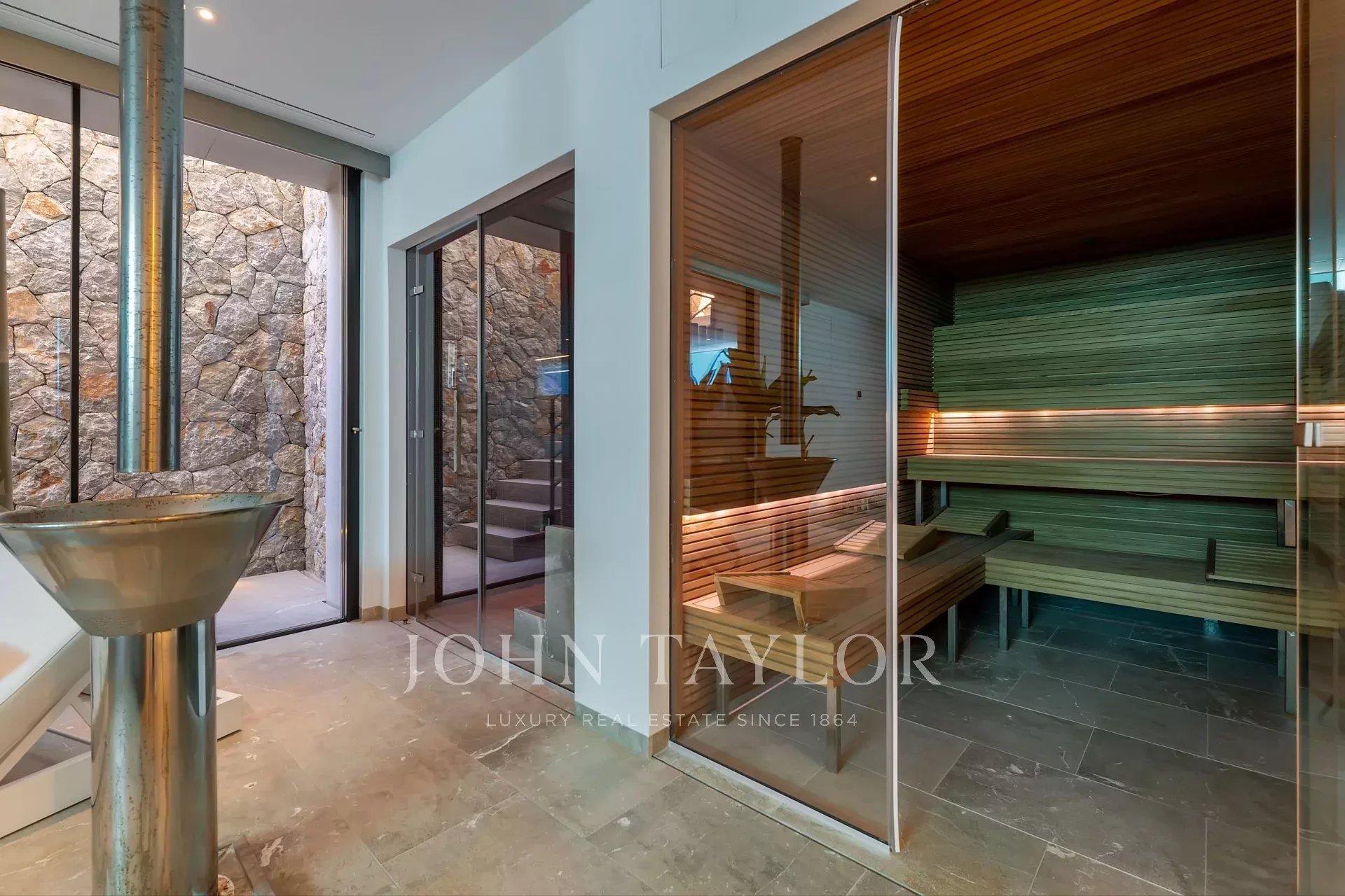 Plně vybavené lázně a posilovna v hlavním domě umožňují novým majitelům relaxovat a užívat si naprostého soukromí se saunou, parní lázní a ledovou skluzavkou ze střechy, kouzelně osvětlenou přirozeným světlem z okna u bazénu. Pro větší pohodlí je nemovitost vybavena integrovanou garáží s otočným stolem pro snadné použití a nabíjecími body pro elektromobily. Nedávno postavená rezidence vyzařuje sofistikovanost díky špičkovým luxusním povrchovým úpravám a kvalitním materiálům v celém objektu.