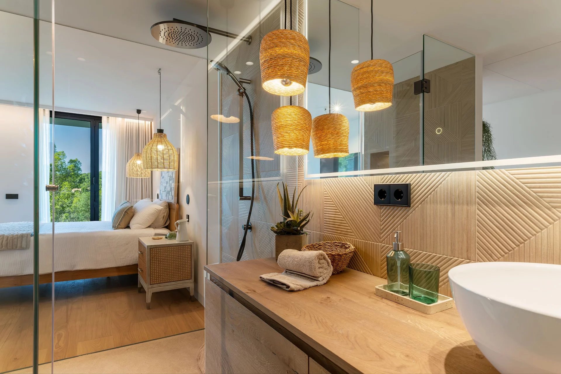 Design se rozšiřuje i do venkovního prostoru s několika terasami, které maximálně využívají mallorské sluneční paprsky a vytvářejí venkovní obytné prostory ideální pro hvězdné večery nebo setkání pod širým nebem. Nekonečný bazén, jako oáza klidu, kontrastuje se zářivou oblohou a poskytuje dokonalé prostředí pro relaxaci, zatímco soukromá pracovna nebo knihovna s bezkonkurenčním výhledem dodává okolí nádech sofistikovanosti.