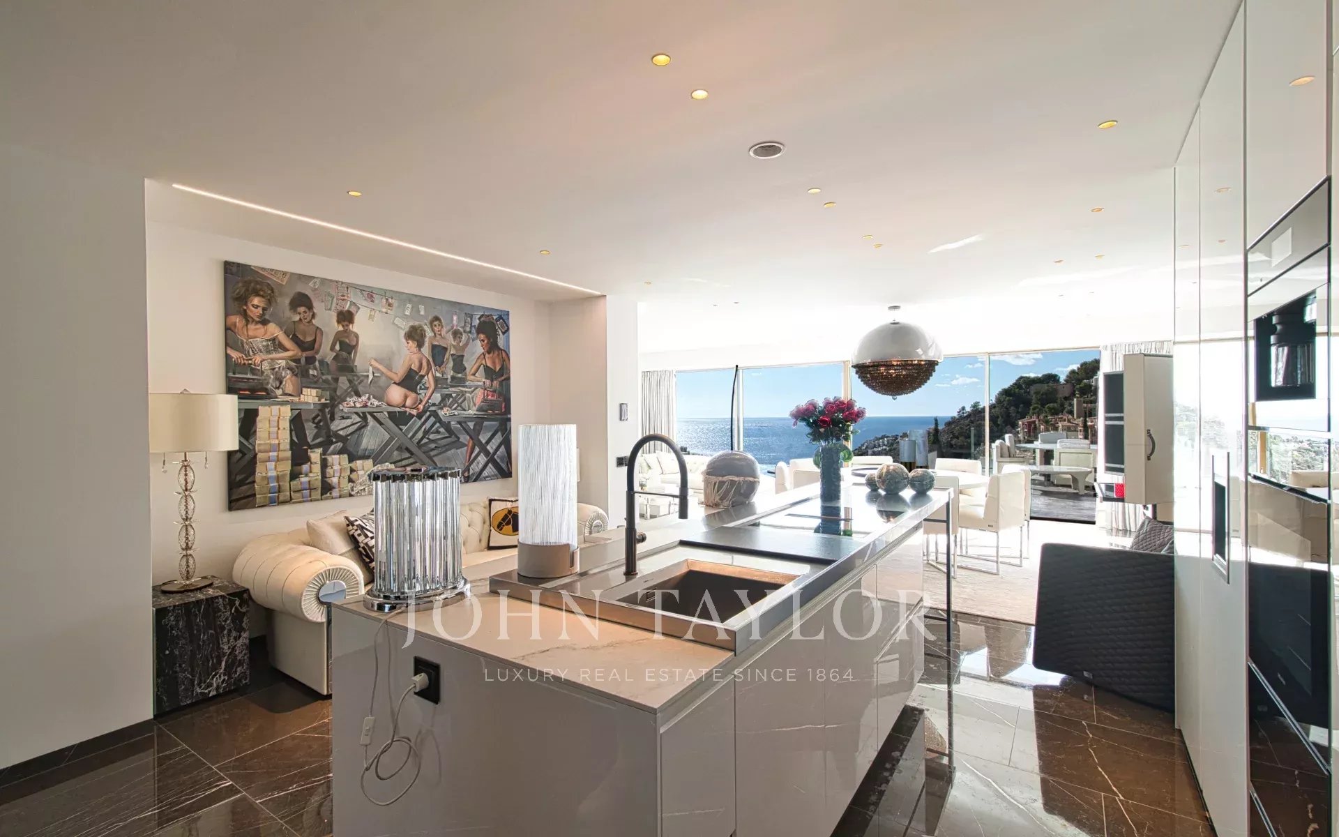 Uvnitř se na třech úrovních rozkládá 532 m² rafinovaných pokojů: svět klidné sofistikovanosti a úchvatného výhledu na moře. Hlavní patro se otevírá do velkého, světlem naplněného obývacího pokoje s velkými okny rámujícími středomořský horizont. Designová kuchyň od společnosti Poliform kombinuje formu a funkci se spotřebiči Miele, Gaggenau a Bora, zatímco přímý vstup na terasu vybízí k prožitku dokonalého spojení vnitřního a venkovního života. Nekonečný bazén jako by splýval s mořem a vytvářel atmosféru nekonečného klidu.