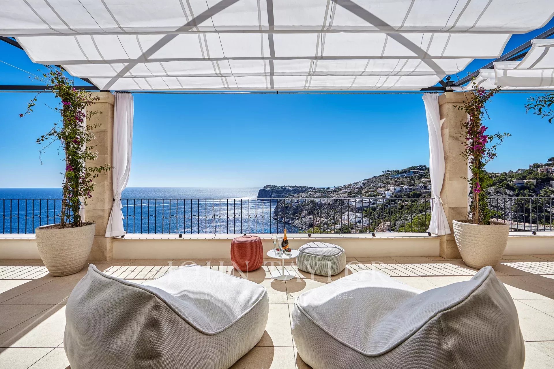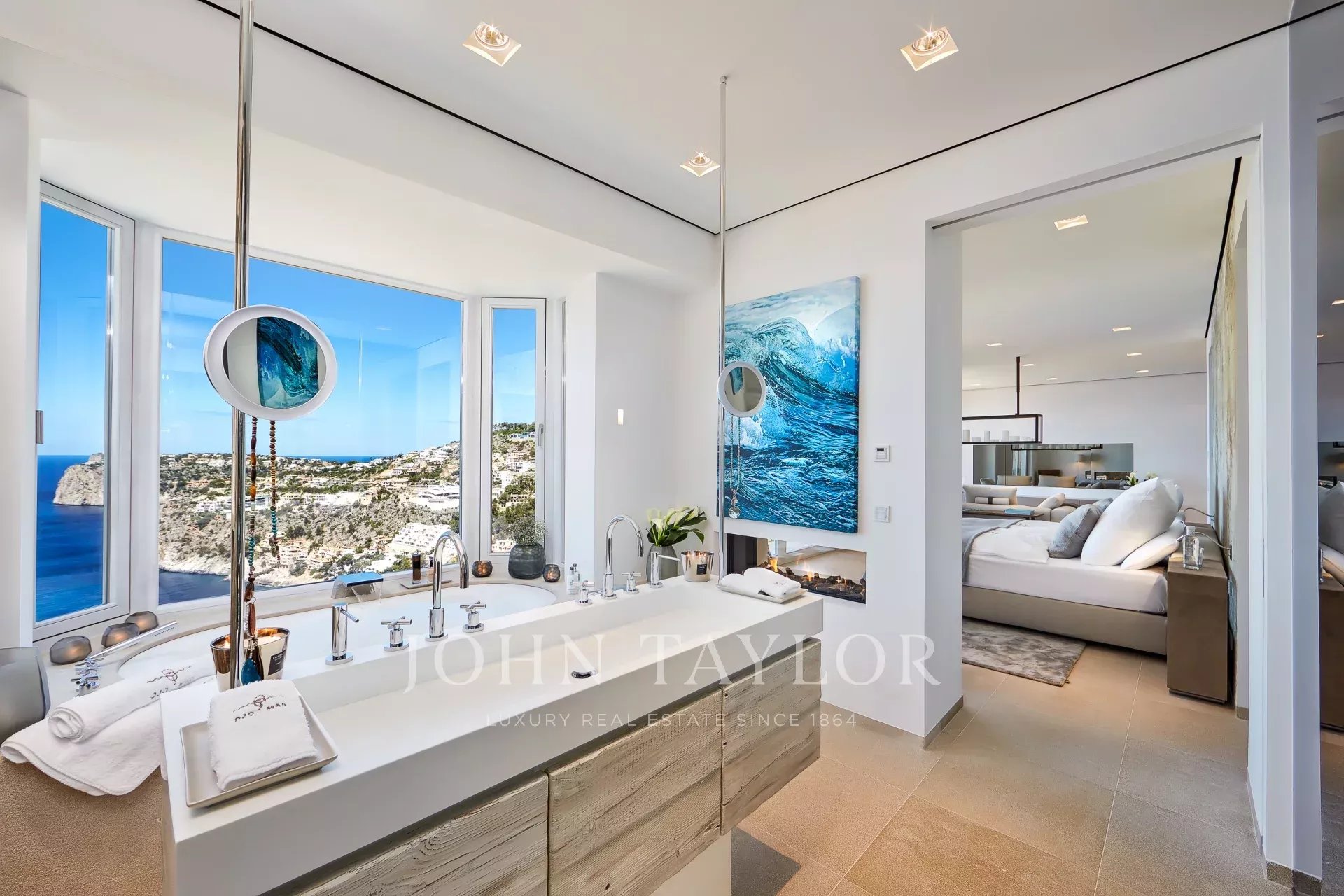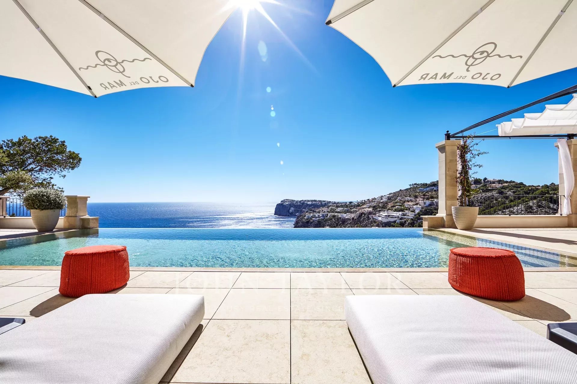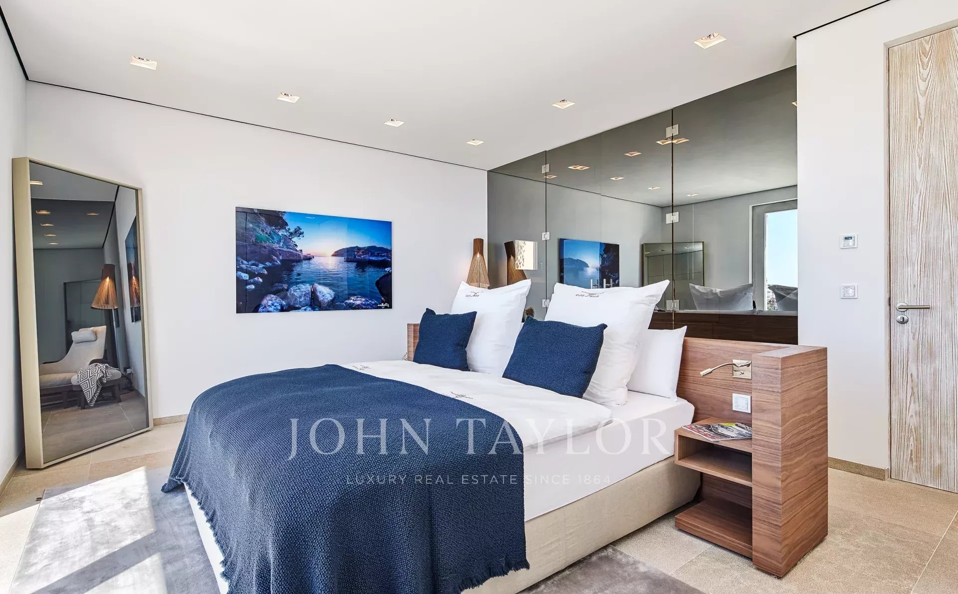 Tato luxusní nemovitost se nachází ve vyhledávané lokalitě nad zálivem Cala Llamp a nabízí úchvatný panoramatický výhled na moře. Vila má zastavěnou plochu 700 m2 na třech úrovních. V přízemí se nachází elegantní vstupní hala, která vede do televizního salonu, obývacího pokoje, jídelny a kuchyně. Prostorný obytný prostor je rozšířen přes pergoly na terasy, kde se nacházejí dvě venkovní kuchyně s grily a velkým jídelním stolem a také koupelna. Další zajímavostí je nekonečný bazén o rozloze 60 m2. Venkovní prostor je navržen tak, abyste si mohli dokonale vychutnat středomořské klima. Do horního patra se dostanete výtahem nebo po elegantně osvětleném schodišti, kde se nachází spací část. Ta se skládá ze dvou ložnic s vlastními koupelnami a pohodlného hlavního apartmá. To se skládá z předsíně, prostorné spací části a luxusní koupelny s vanou v arkýři. V suterénu se kromě garáže o rozloze 100 m2, která nabízí místo pro nejméně 5 aut, nachází vinárna, fitness se saunou, domácí kino, služební ložnice s vlastní koupelnou, další koupelna, prádelna, technická místnost a sklad. Nemovitost se prodává včetně nábytku.