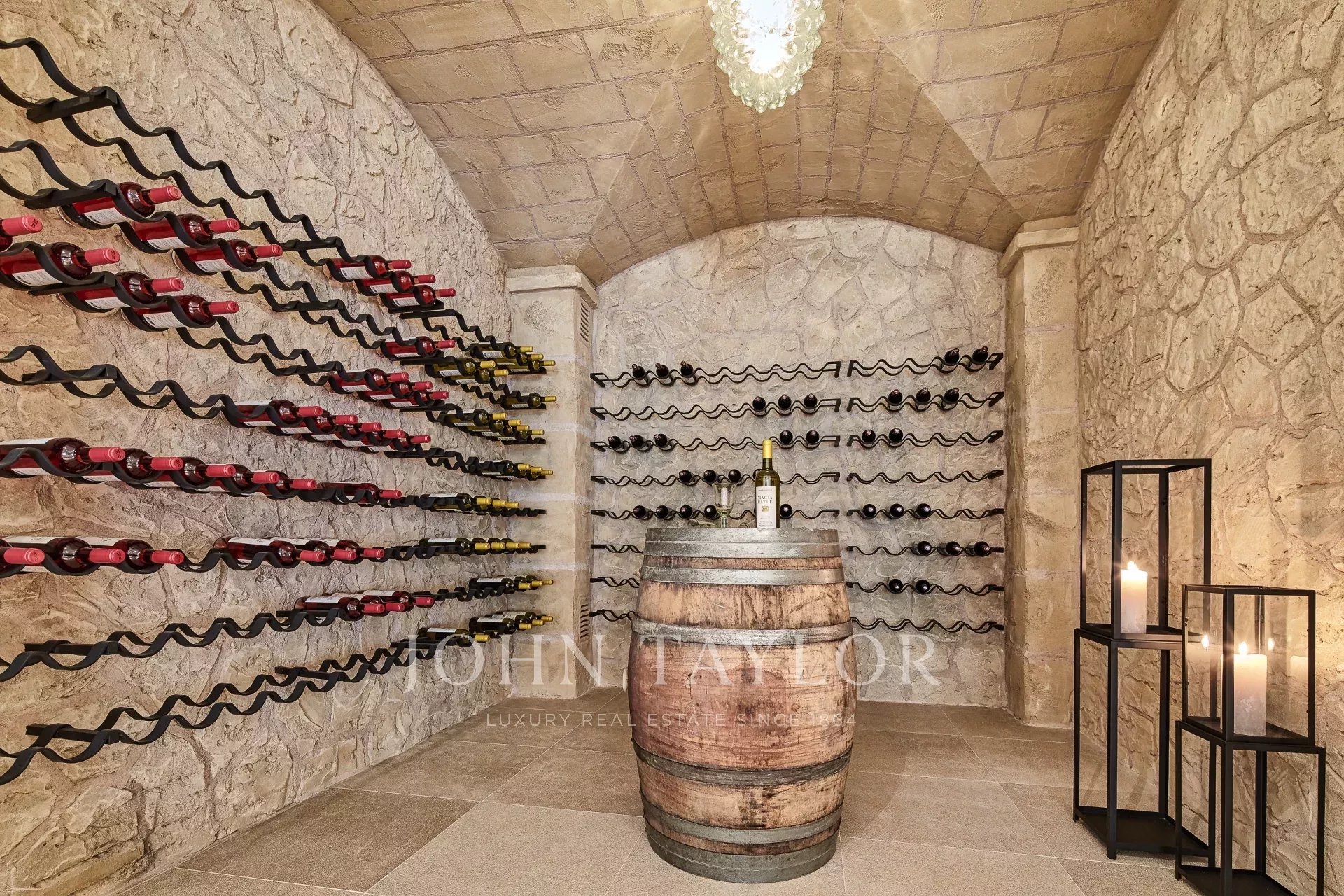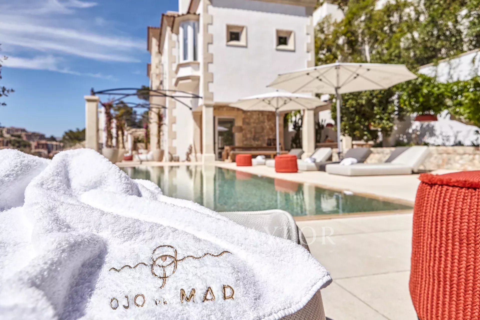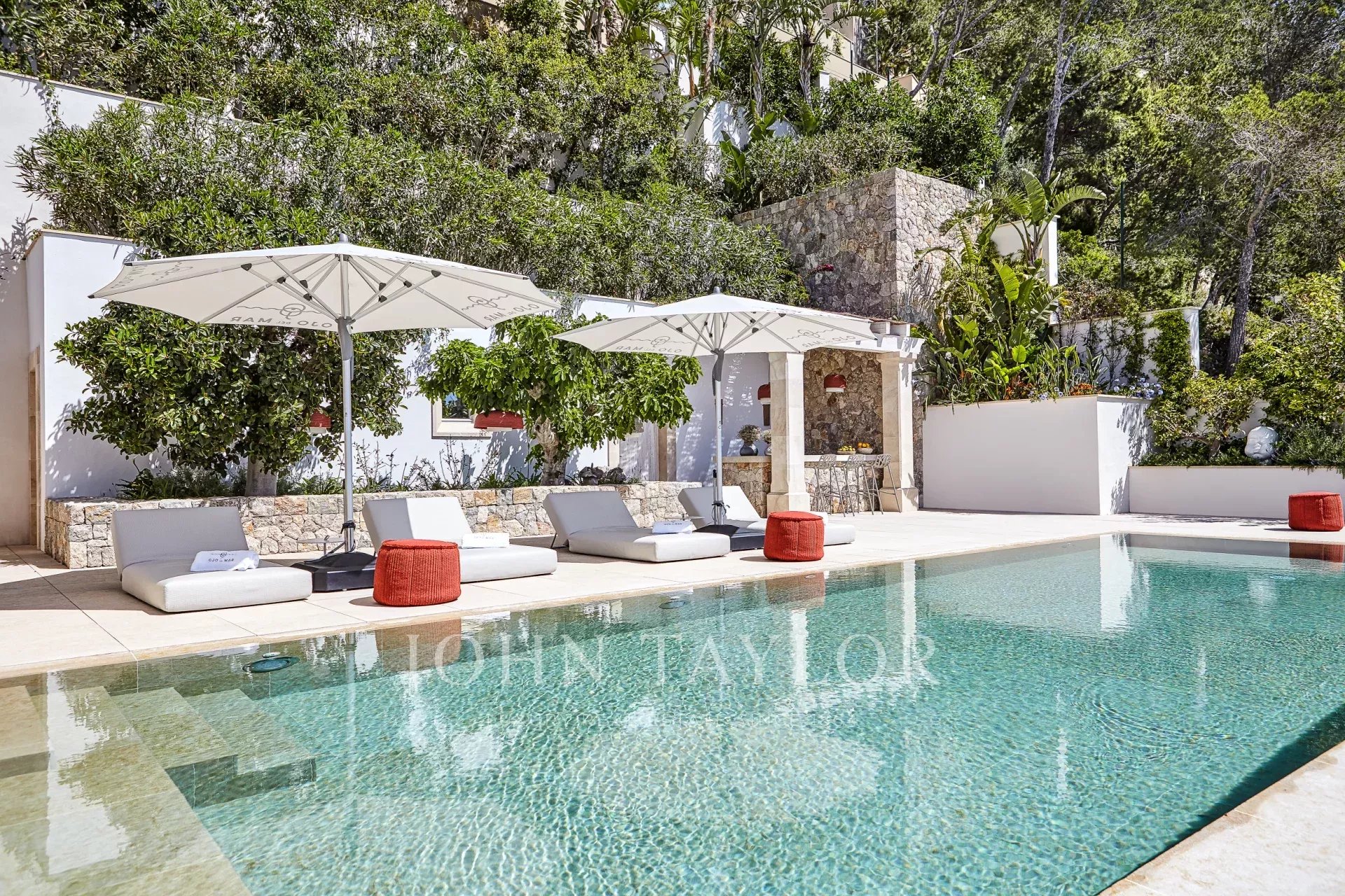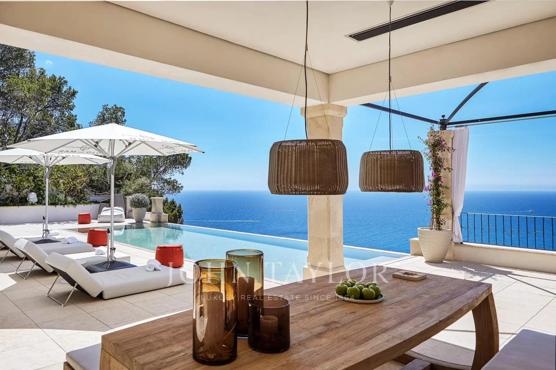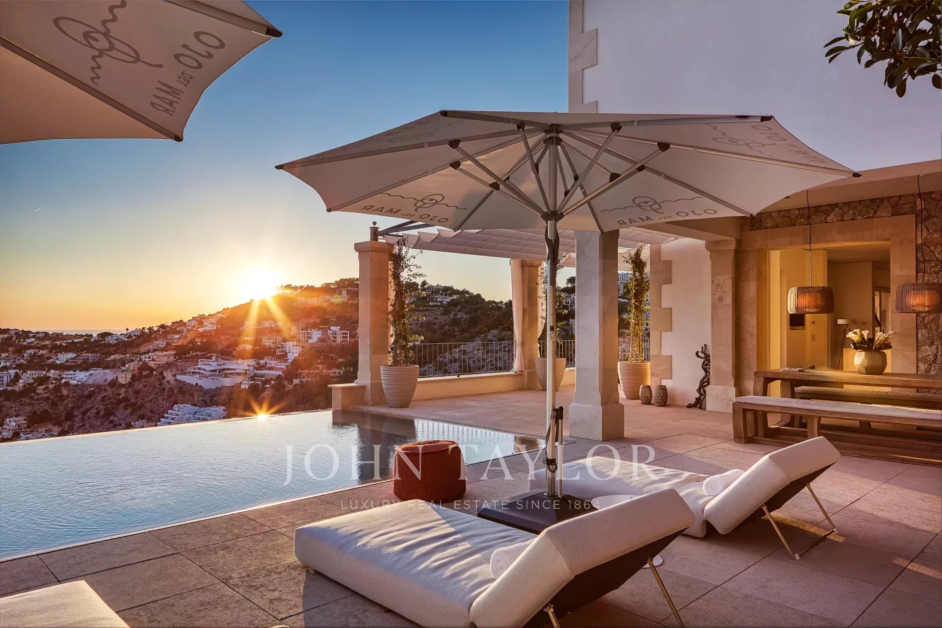 Tato luxusní nemovitost se nachází ve vyhledávané lokalitě nad zálivem Cala Llamp a nabízí úchvatný panoramatický výhled na moře. Vila má zastavěnou plochu 700 m2 na třech úrovních. V přízemí se nachází elegantní vstupní hala, která vede do televizního salonu, obývacího pokoje, jídelny a kuchyně. Prostorný obytný prostor je rozšířen přes pergoly na terasy, kde se nacházejí dvě venkovní kuchyně s grily a velkým jídelním stolem a také koupelna. Další zajímavostí je nekonečný bazén o rozloze 60 m2. Venkovní prostor je navržen tak, abyste si mohli dokonale vychutnat středomořské klima. Do horního patra se dostanete výtahem nebo po elegantně osvětleném schodišti, kde se nachází spací část. Ta se skládá ze dvou ložnic s vlastními koupelnami a pohodlného hlavního apartmá. To se skládá z předsíně, prostorné spací části a luxusní koupelny s vanou v arkýři. V suterénu se kromě garáže o rozloze 100 m2, která nabízí místo pro nejméně 5 aut, nachází vinárna, fitness se saunou, domácí kino, služební ložnice s vlastní koupelnou, další koupelna, prádelna, technická místnost a sklad. Nemovitost se prodává včetně nábytku.