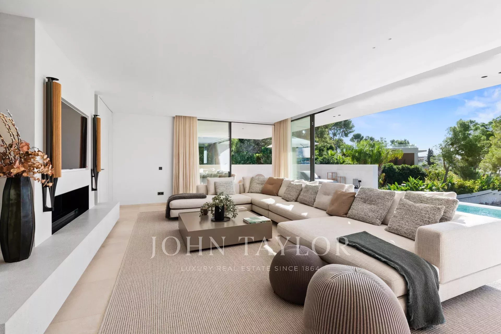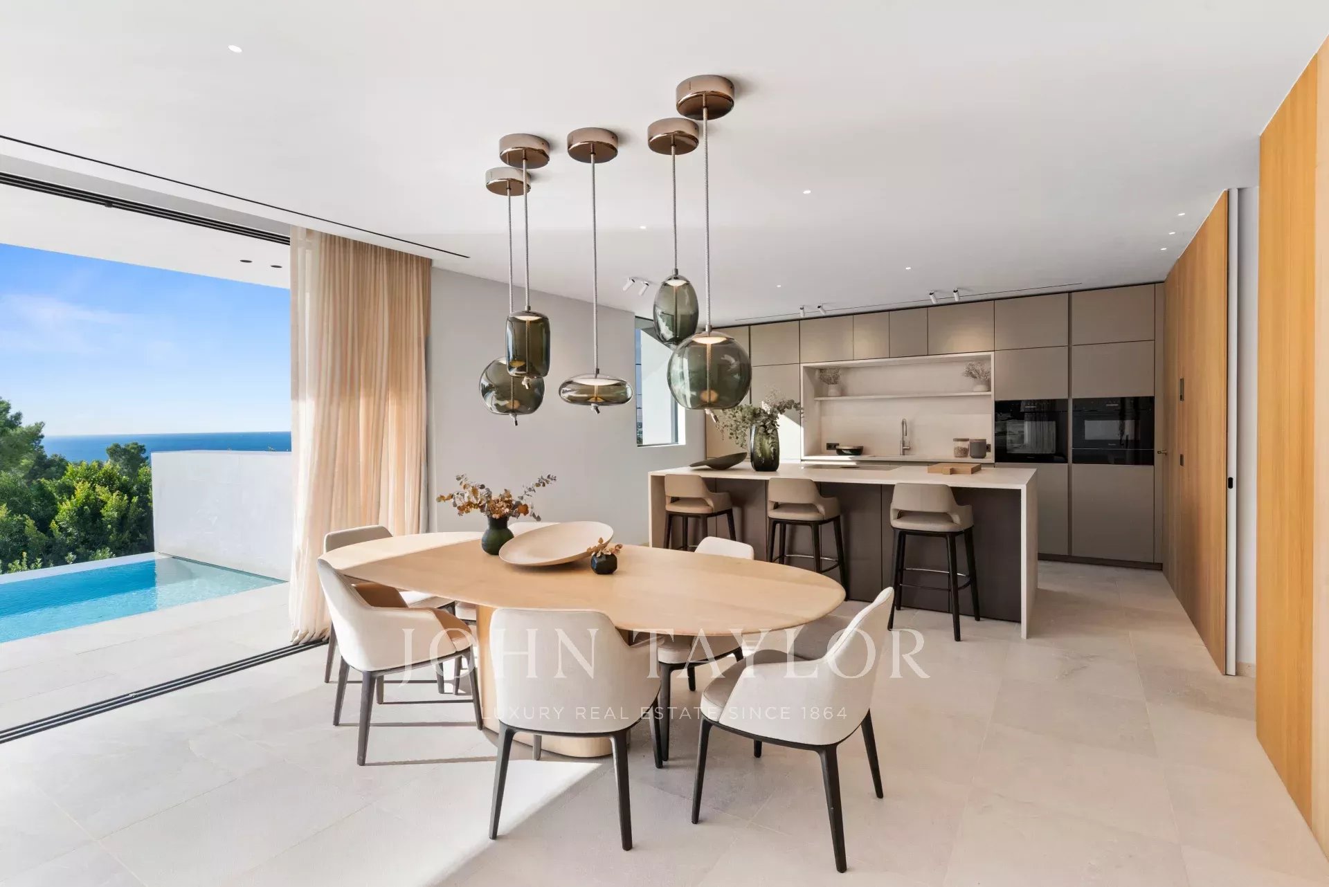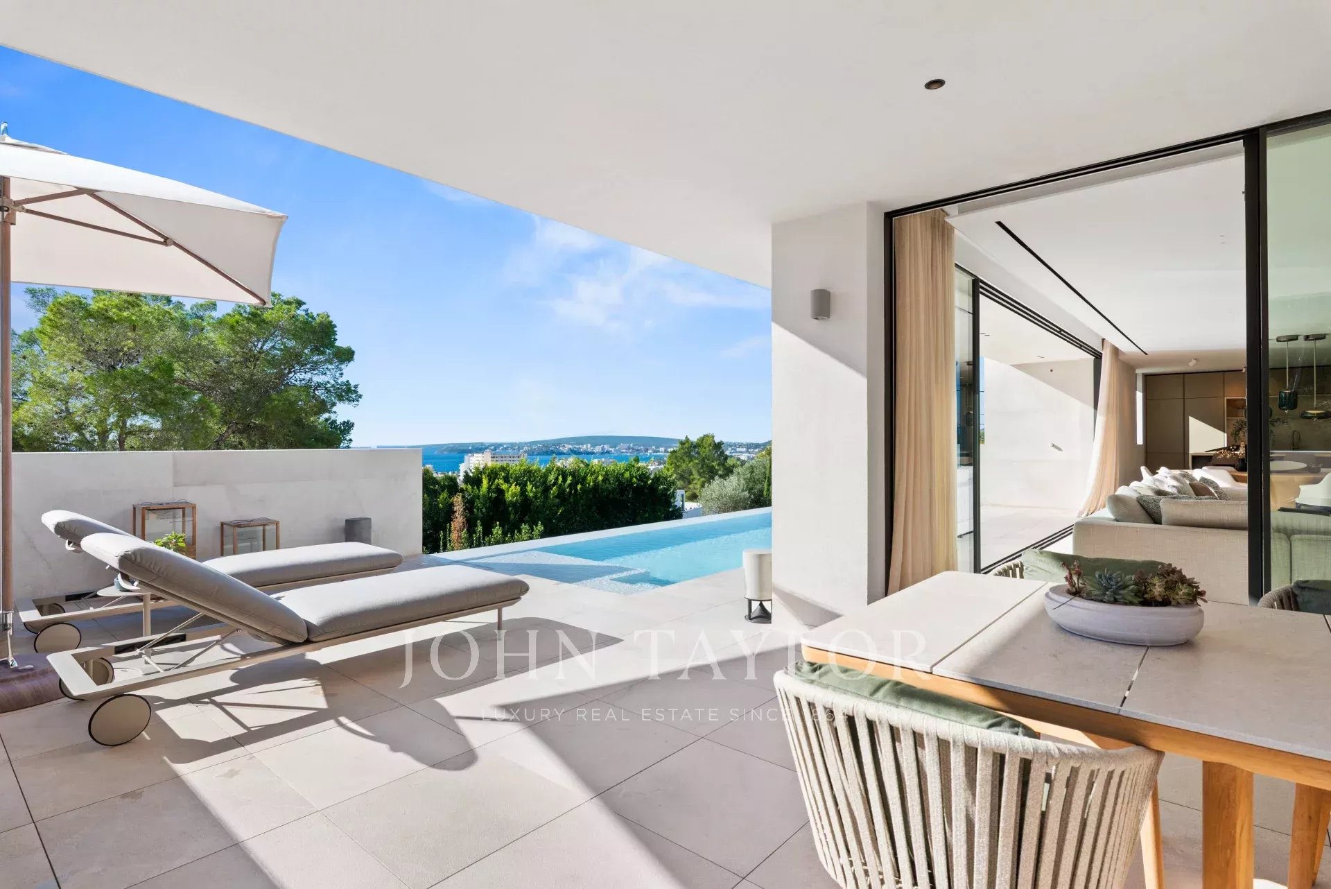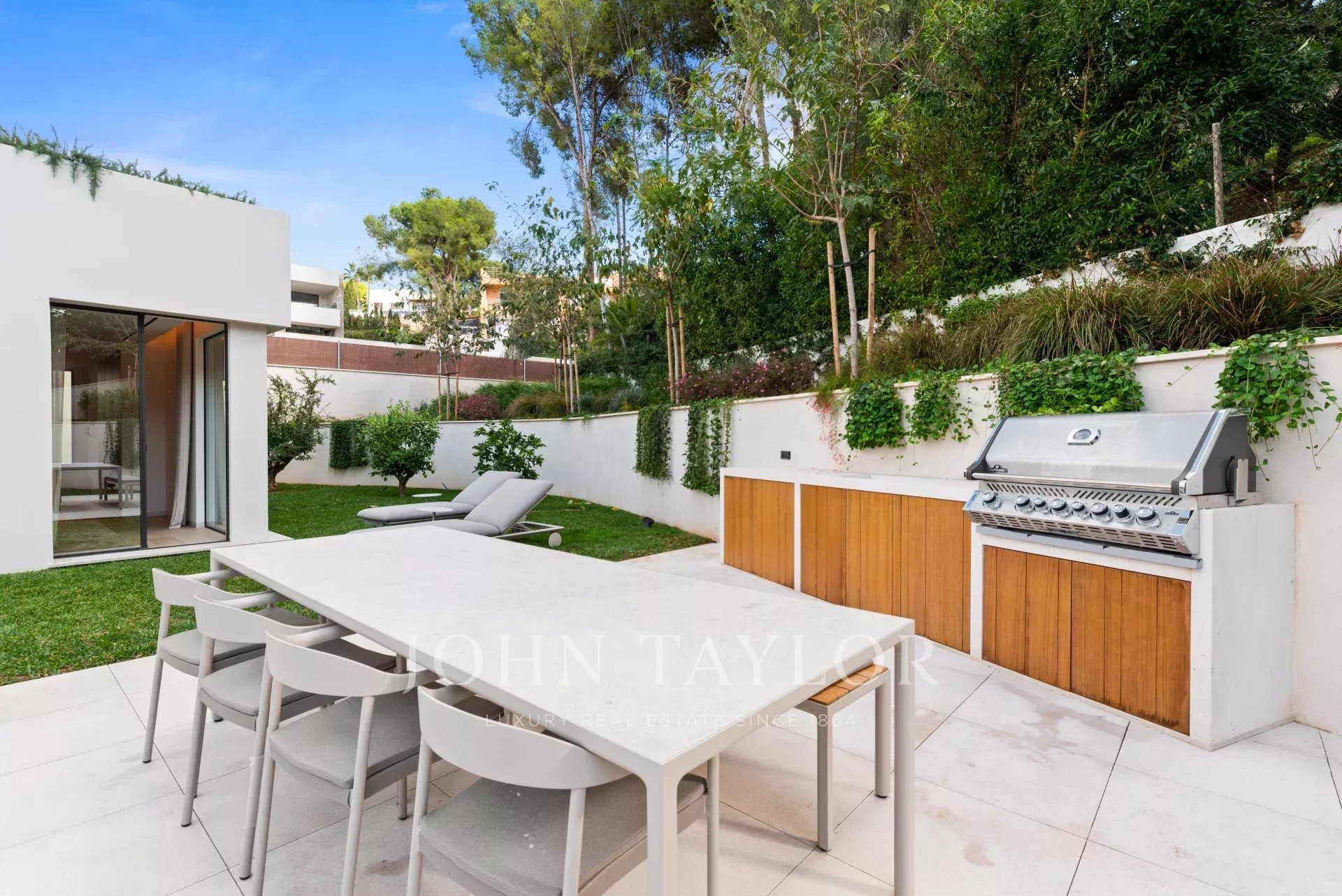 Tato nově postavená luxusní vila se nachází v prestižní čtvrti Portals Nous v pěší vzdálenosti od známého přístavu, na vyvýšeném místě s krásným výhledem na moře. Nádherný dům orientovaný na jihozápad vyniká svou prostorností, moderním stylem a komfortem. Denní část s obývacím pokojem, jídelnou a kuchyní se nachází v horním patře domu a plně využívá výhledů. Dokonale navazuje na terasu, bazén a verandu s grilem. Ve spodním patře se nacházejí 4 ložnice s vlastním sociálním zařízením a pracovna. Uprostřed se nachází terasa, kam se můžete uchýlit v nejteplejších dnech roku. Venku se nachází další terasová část s letní kuchyní a druhý bazén, obklopený svěží zahradou.