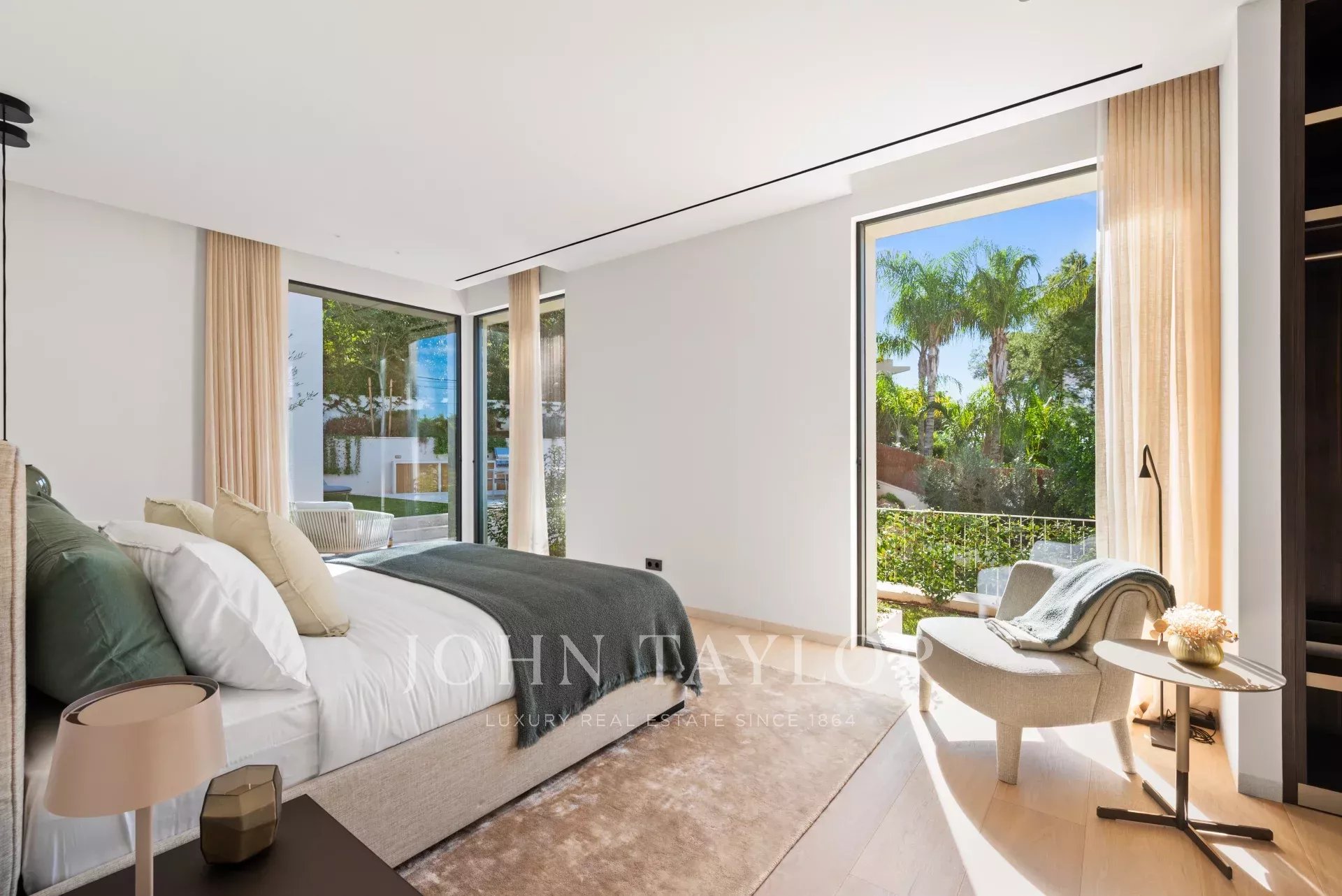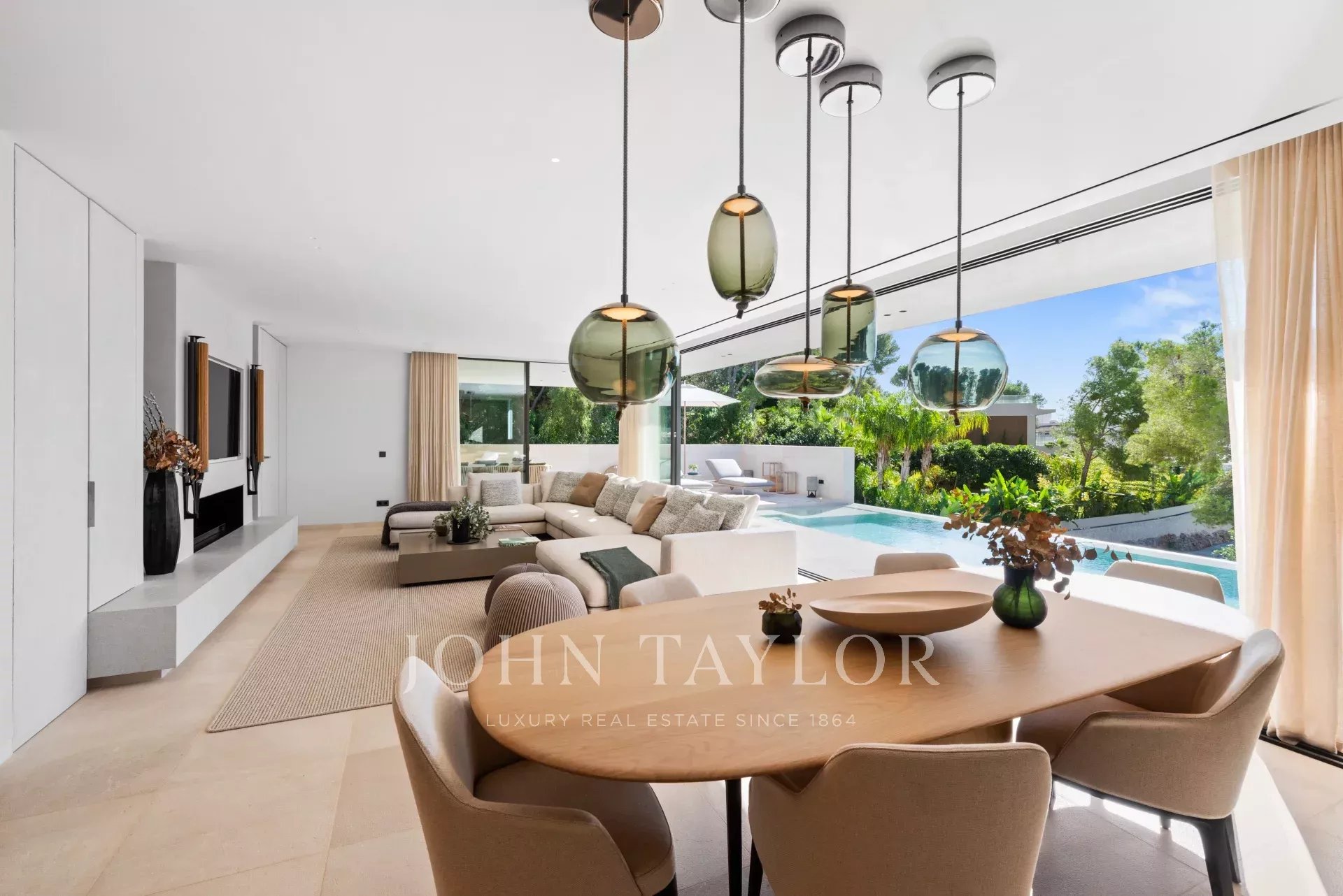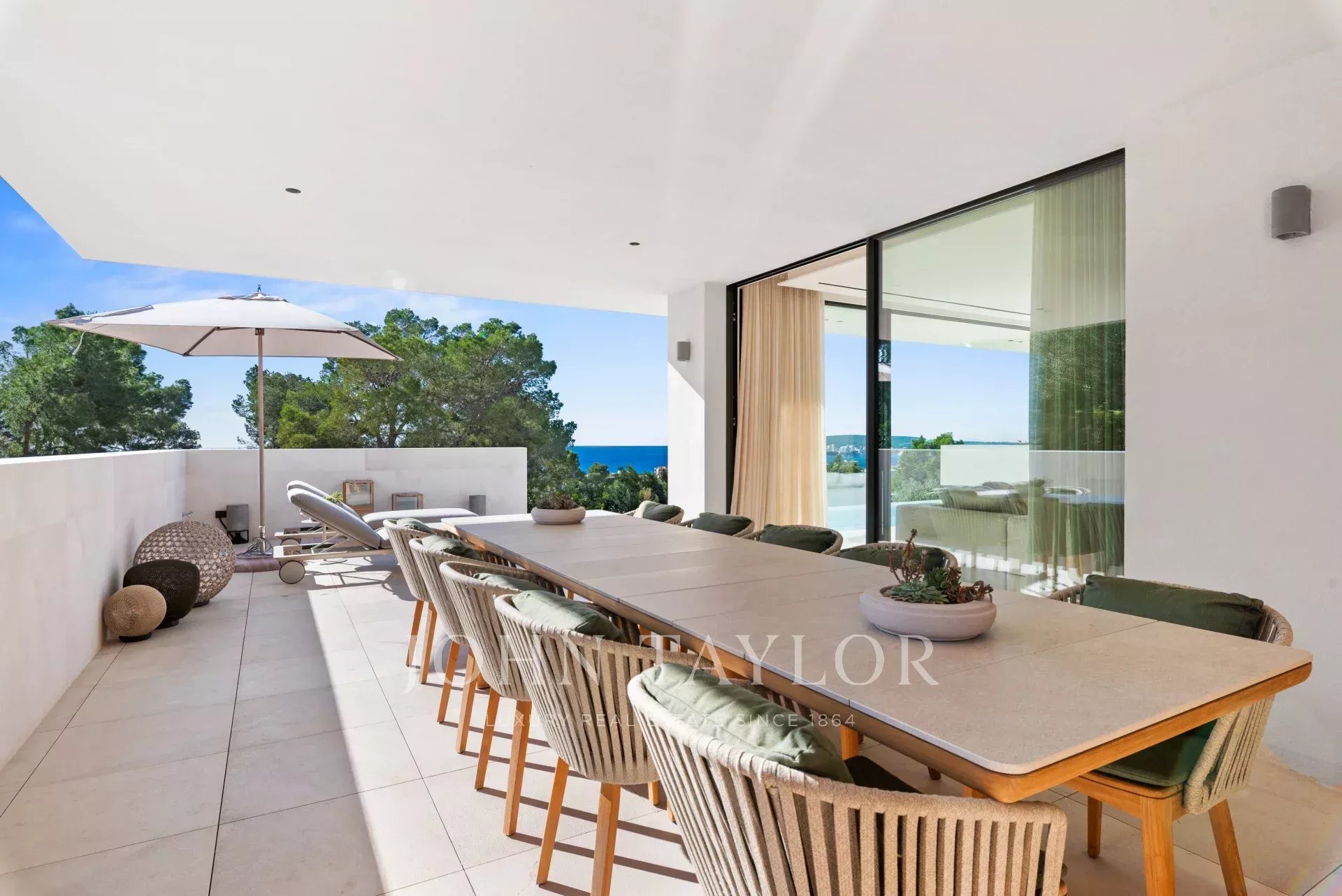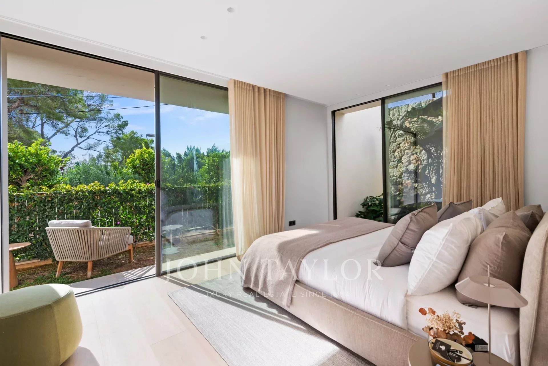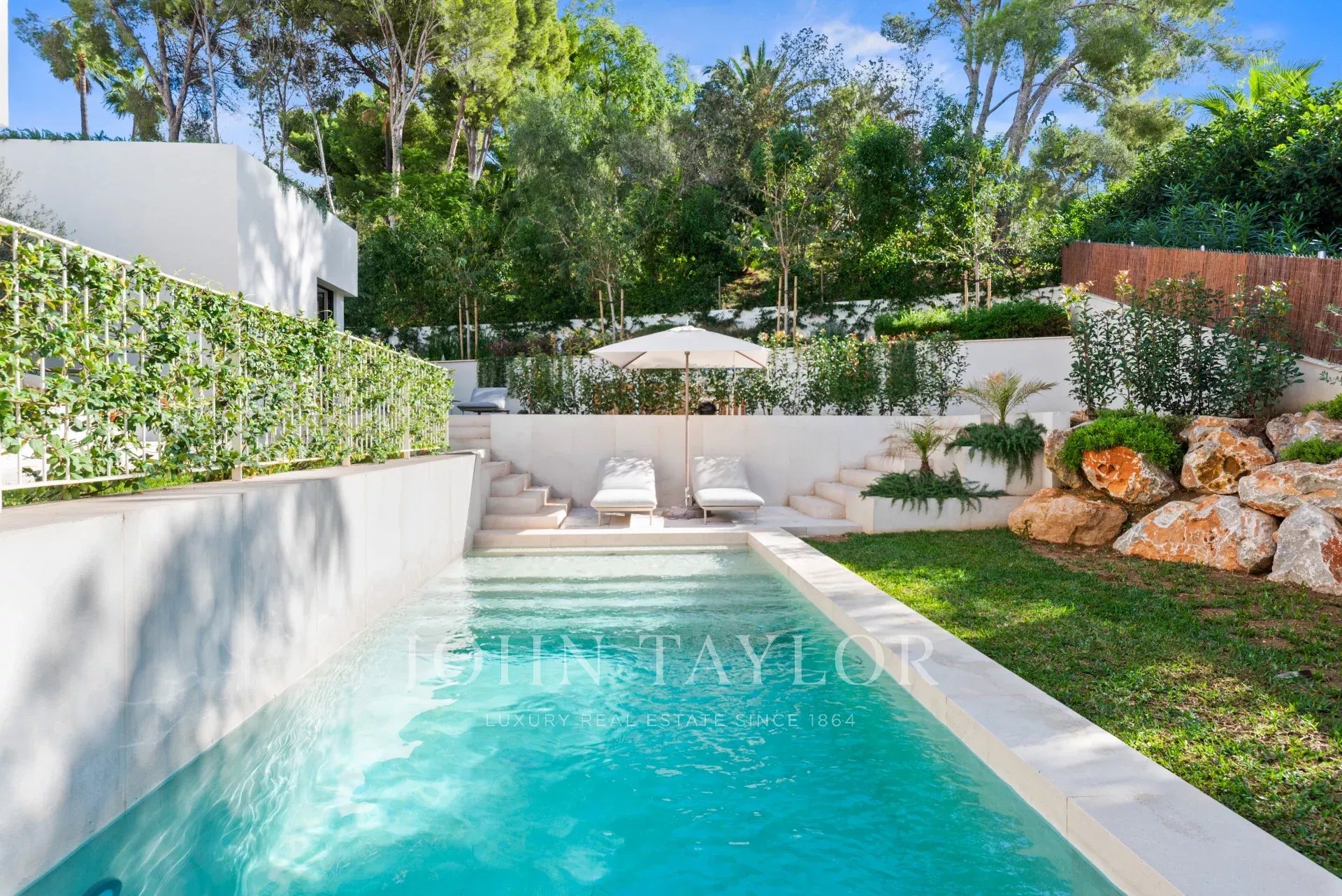 Tato nově postavená luxusní vila se nachází v prestižní čtvrti Portals Nous v pěší vzdálenosti od známého přístavu, na vyvýšeném místě s krásným výhledem na moře. Nádherný dům orientovaný na jihozápad vyniká svou prostorností, moderním stylem a komfortem. Denní část s obývacím pokojem, jídelnou a kuchyní se nachází v horním patře domu a plně využívá výhledů. Dokonale navazuje na terasu, bazén a verandu s grilem. Ve spodním patře se nacházejí 4 ložnice s vlastním sociálním zařízením a pracovna. Uprostřed se nachází terasa, kam se můžete uchýlit v nejteplejších dnech roku. Venku se nachází další terasová část s letní kuchyní a druhý bazén, obklopený svěží zahradou.