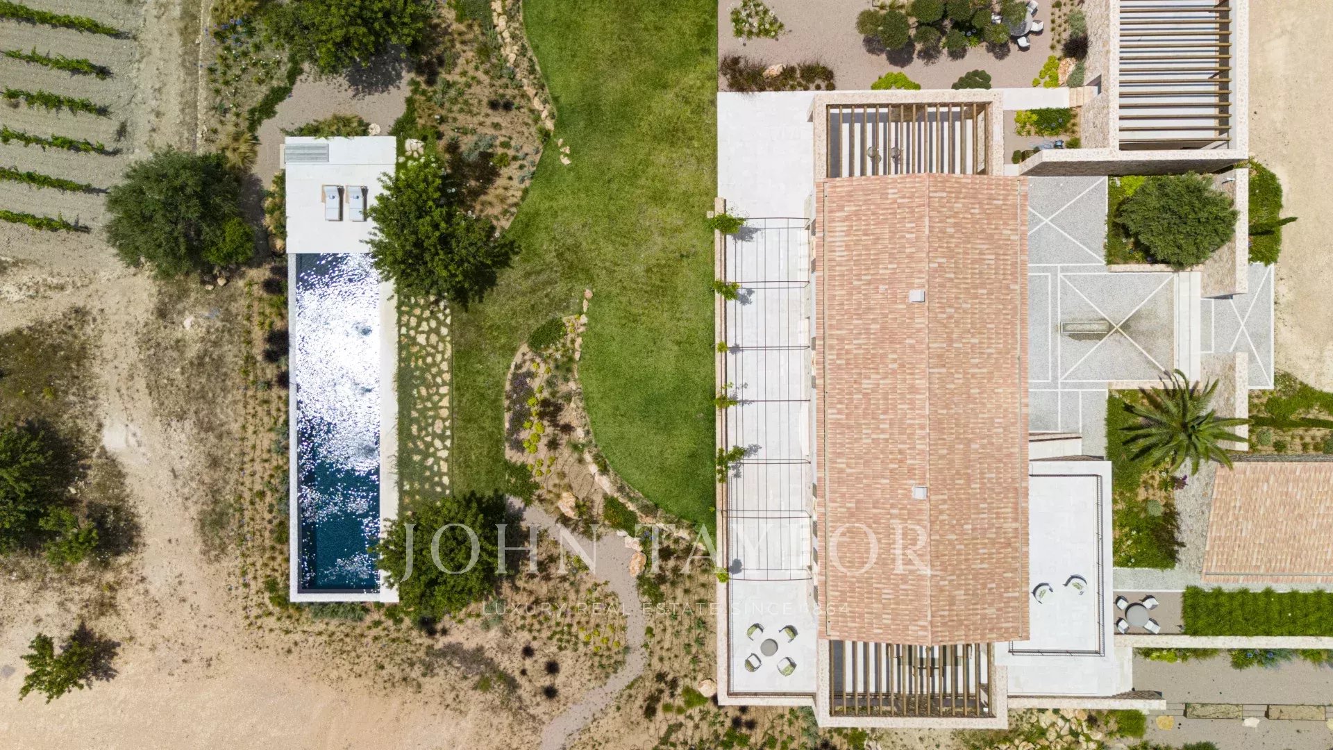 Exkluzivní prvky a povrchové úpravy této nemovitosti zahrnují dlažbu z přírodního kamene marfil v celém přízemí a prvním patře, podlahové vytápění ve všech místnostech, dubové dřevěné obložení vyrobené na zakázku a ručně vyráběná umyvadla z přírodního kamene ve všech koupelnách, designové vodovodní baterie a sprchy od společnosti VOLA, systém solárních panelů (cca 1,5 m) a další. 30 KW) pro udržitelnou energii, velký bazén s vyhrazenou technickou a skladovací místností, ozvučení SONOS na několika místech v exteriéru, grilovací domek se dvěma grily (plynový a na dřevěné uhlí), dvě venkovní fontány s nezávislými čisticími a čerpacími systémy, vinice o rozloze cca 3 750 m2 osázená odrůdou révy vinné Prensal, která je outsourcována místnímu vinařství - roční výnos cca 40 lahví, ručně tesané fasády z přírodního kamene pro nadčasovou architekturu a krajinářská architektura od NONAMu