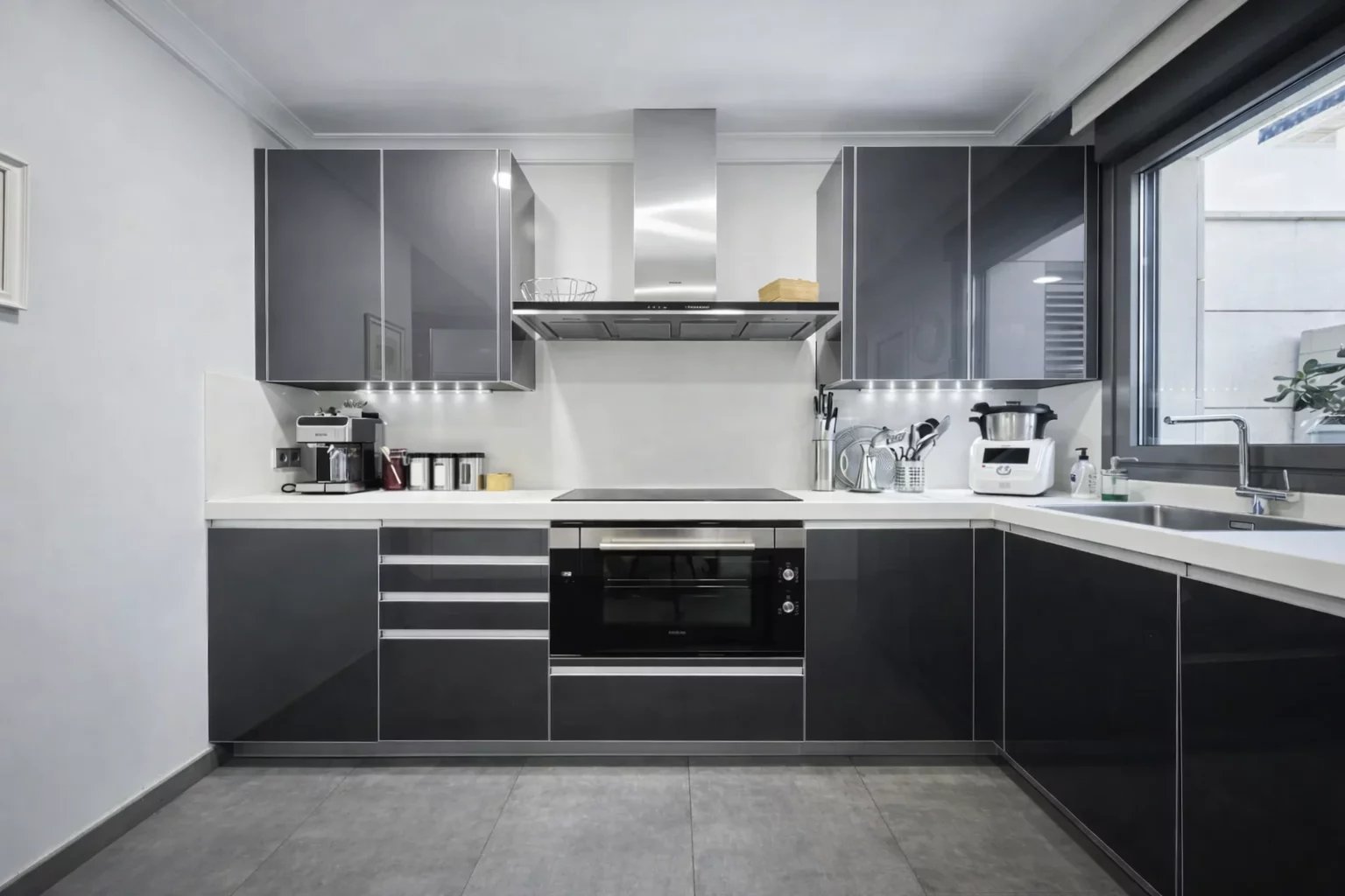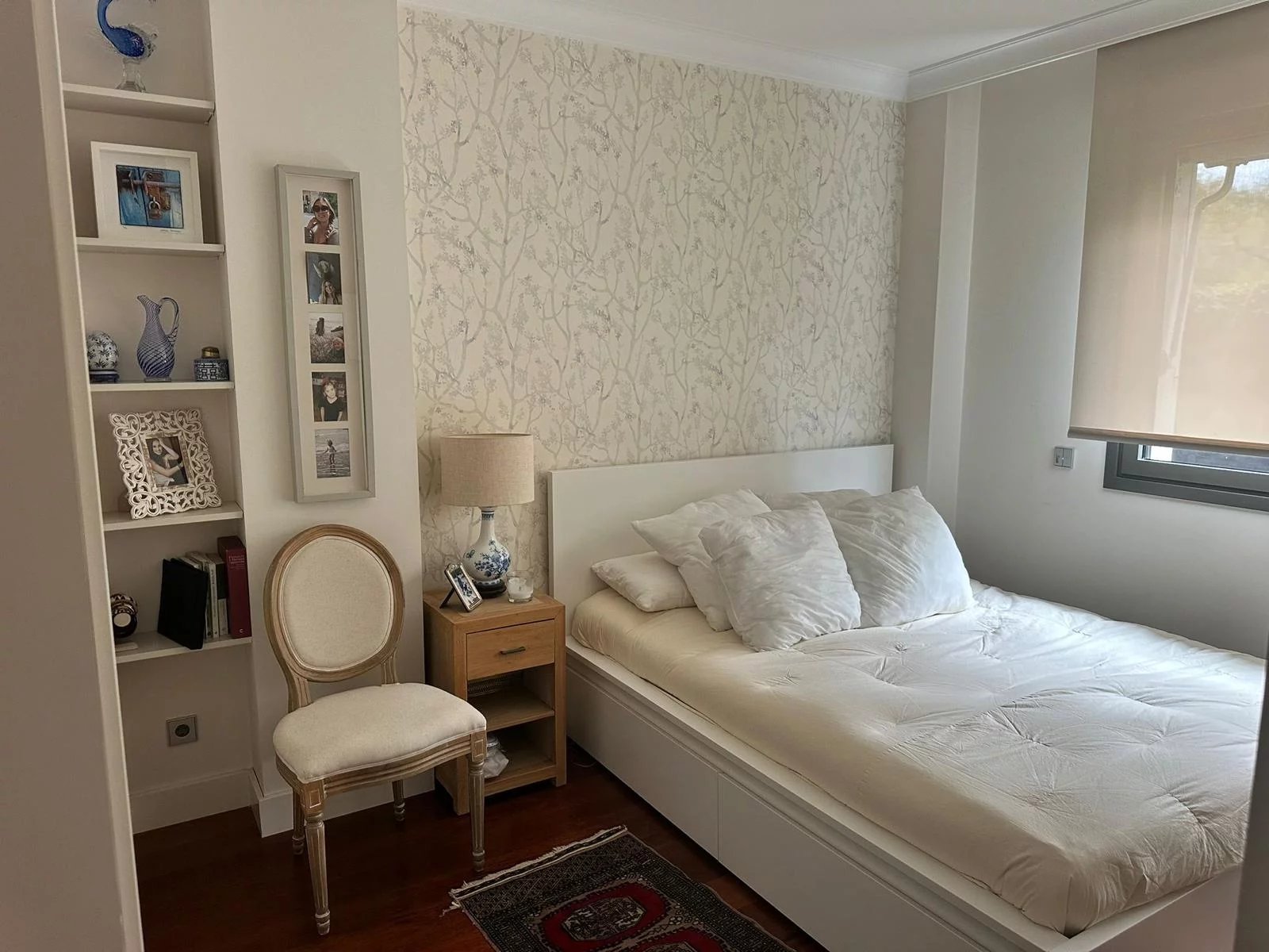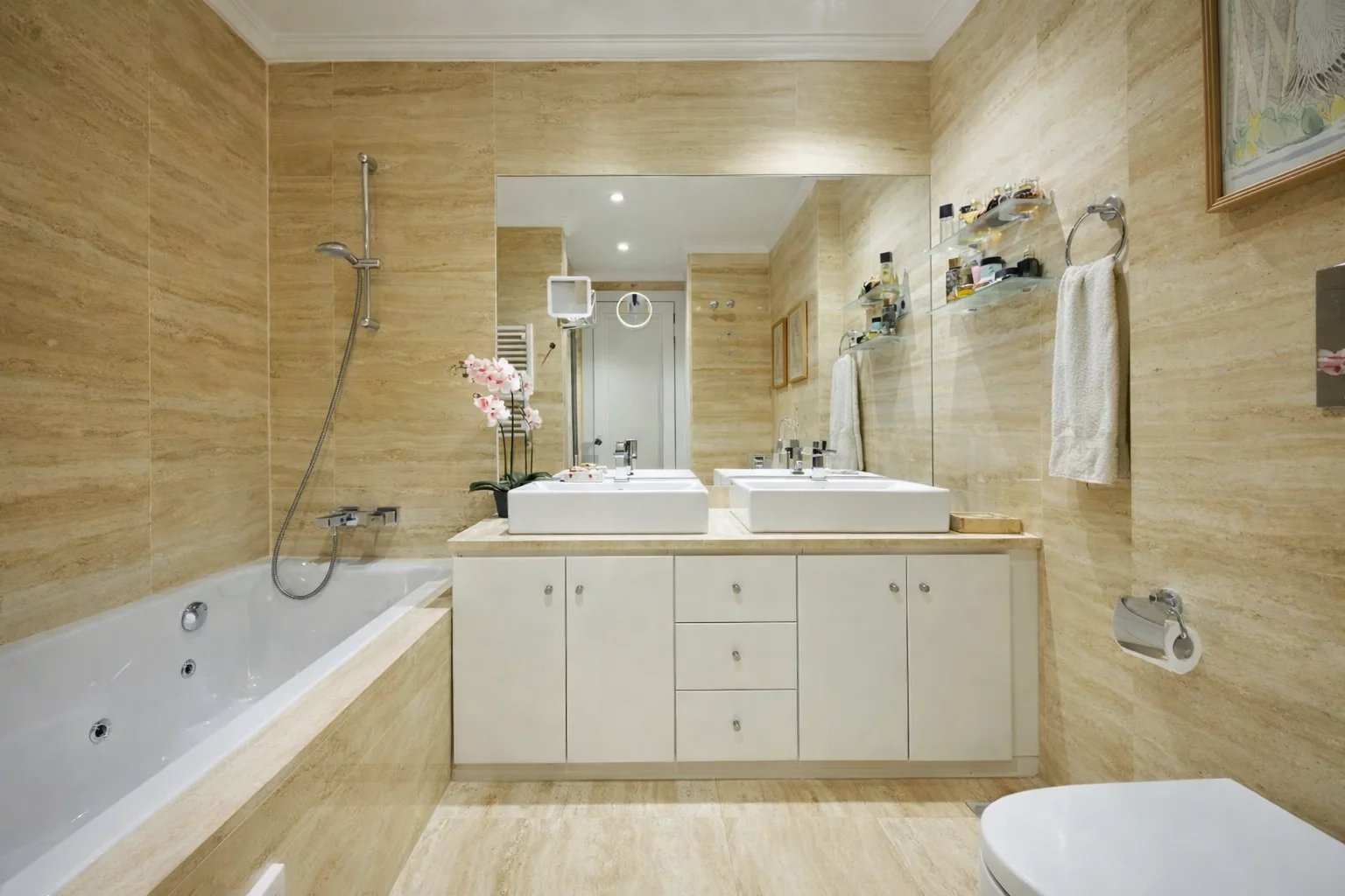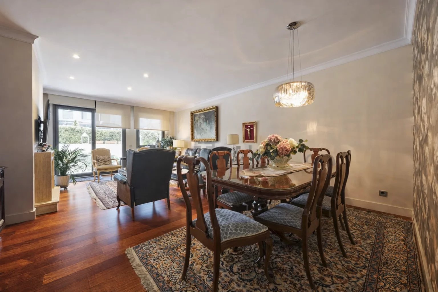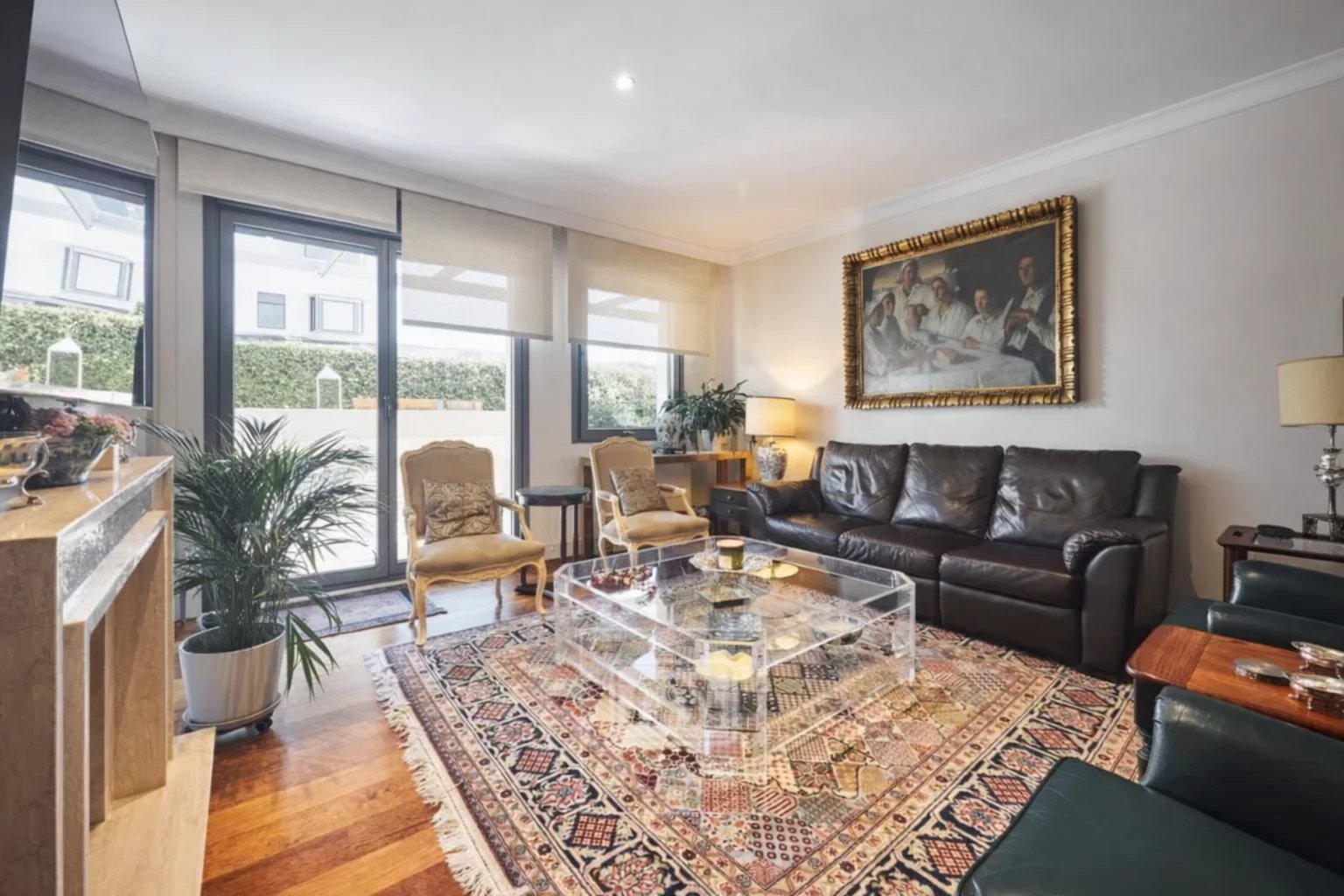 Nemovitost orientovaná na jih vyniká vynikající světlostí a je rozdělena na obývací pokoj s jídelnou, krbem a vstupem na terasu, plně vybavenou kuchyň se špičkovými spotřebiči a sušárnou, tři ložnice, dvě koupelny a toaletu pro hosty, přičemž hlavní ložnice má vlastní koupelnu.