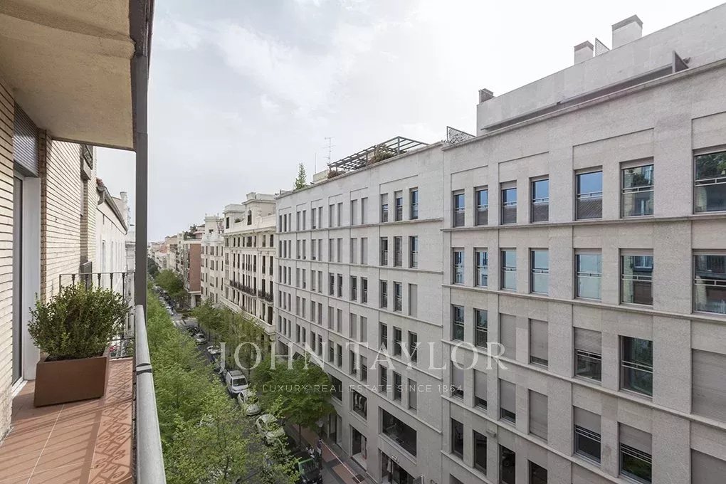 Do bytu se vchází přes elegantní vstupní halu s toaletou pro hosty, která vede do působivého obývacího pokoje s jídelnou s dubovou podlahou a třemi velkými okny s výhledem do ulice Claudio Coello.