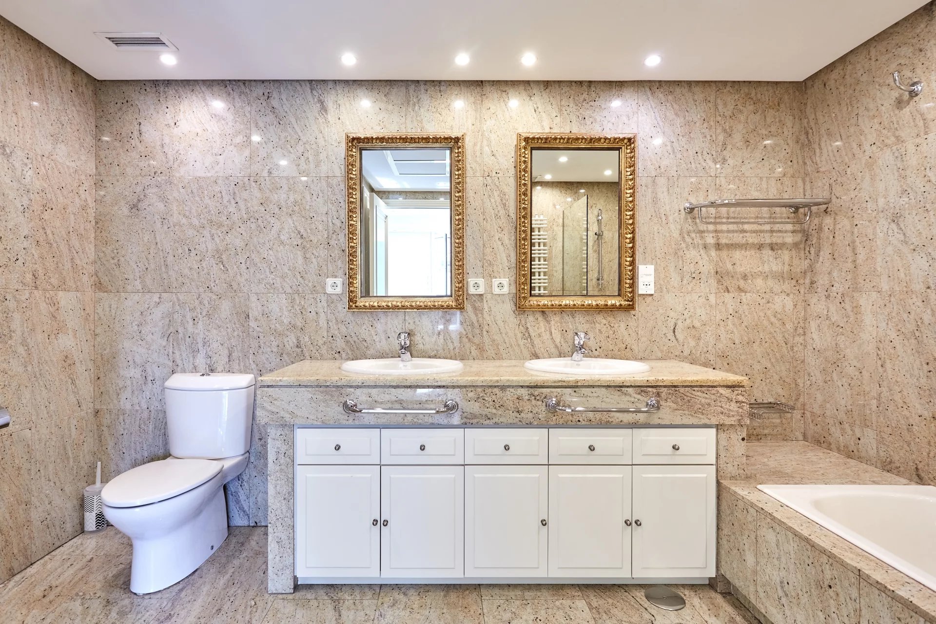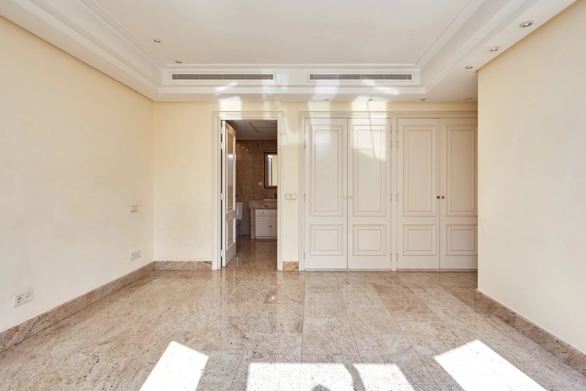 V odpočinkové části jsou tři velké ložnice, dvě z nich s vlastní koupelnou a velkými okny. Nemovitost má dva trezory a vyniká velkou úložnou kapacitou díky velkému počtu skříní.