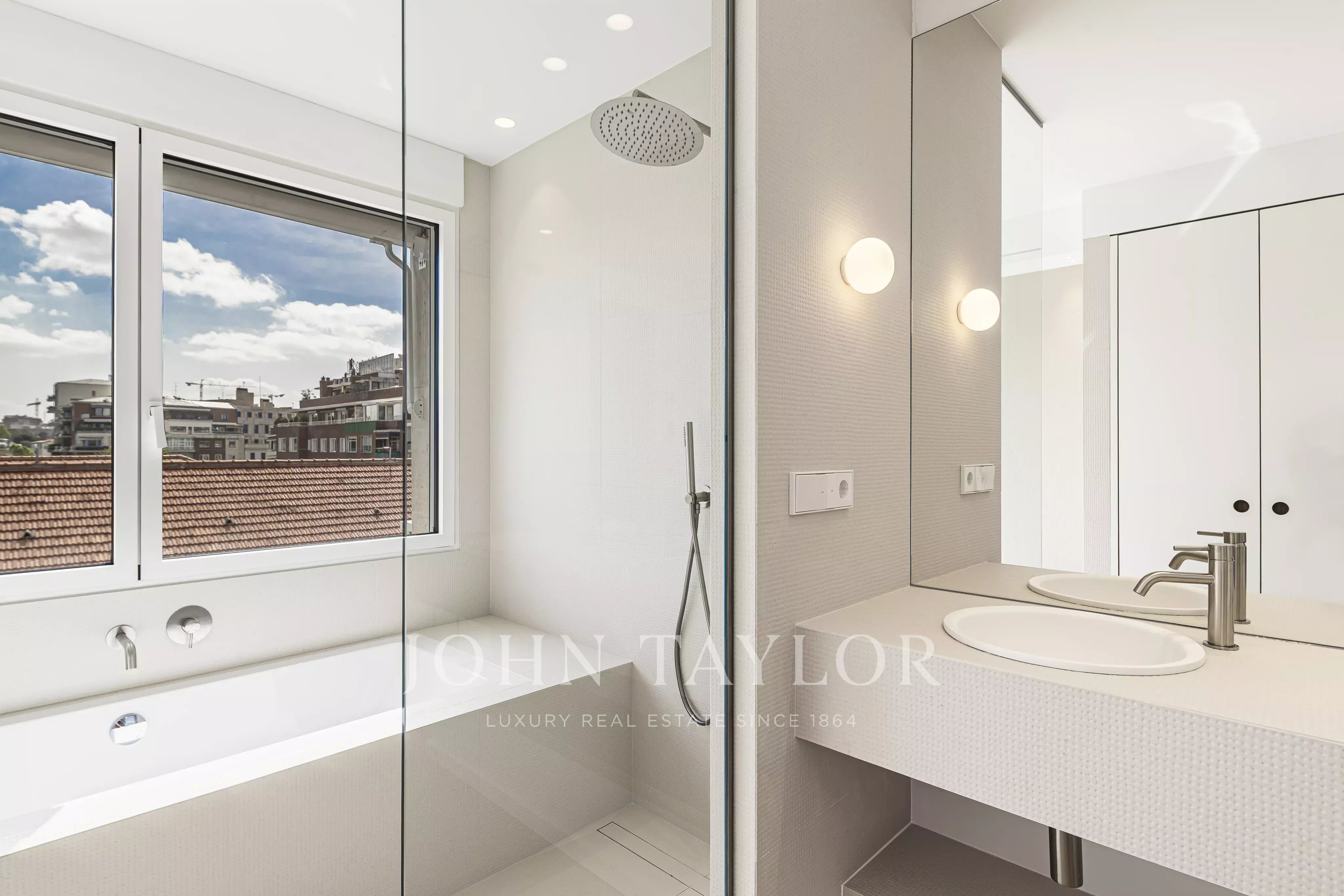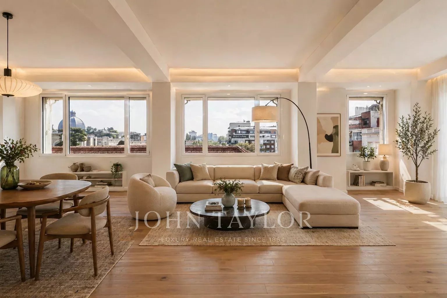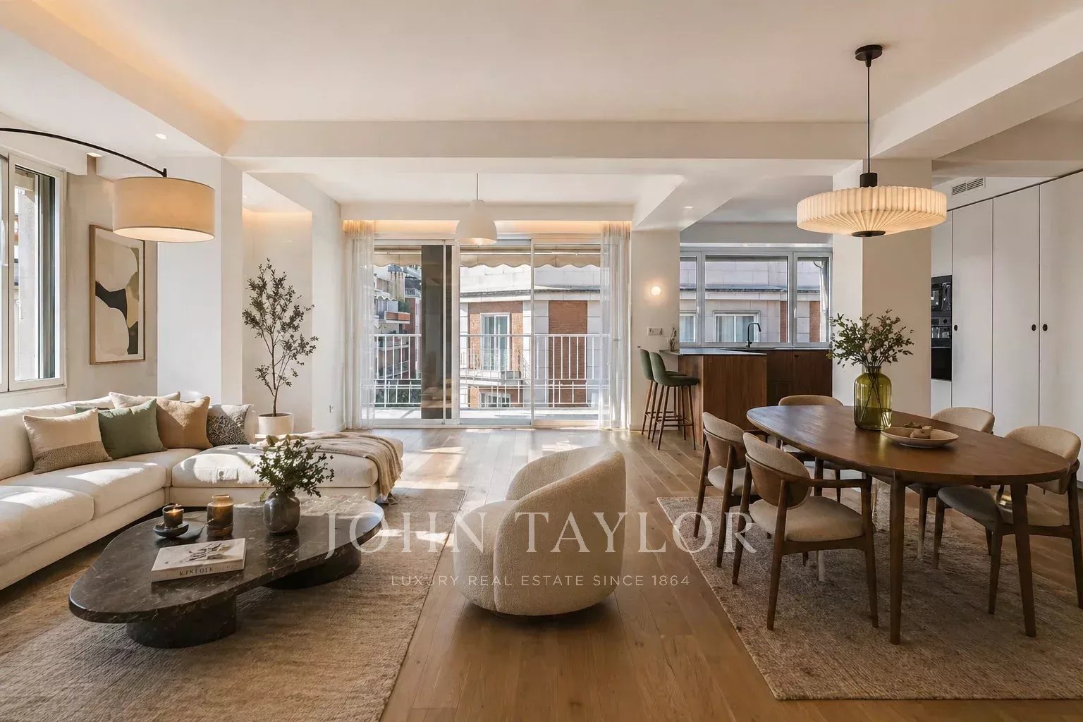 Hlavní část se soustředí kolem impozantního obývacího pokoje s jídelnou o přibližně 90 m², zalitého přirozeným světlem po celý den díky široké prosklené fasádě. Tento prostor pokračuje do nádherné terasy, dokonale orientované, navržené pro užívání si výhledů v klidném a reprezentativním prostředí.
