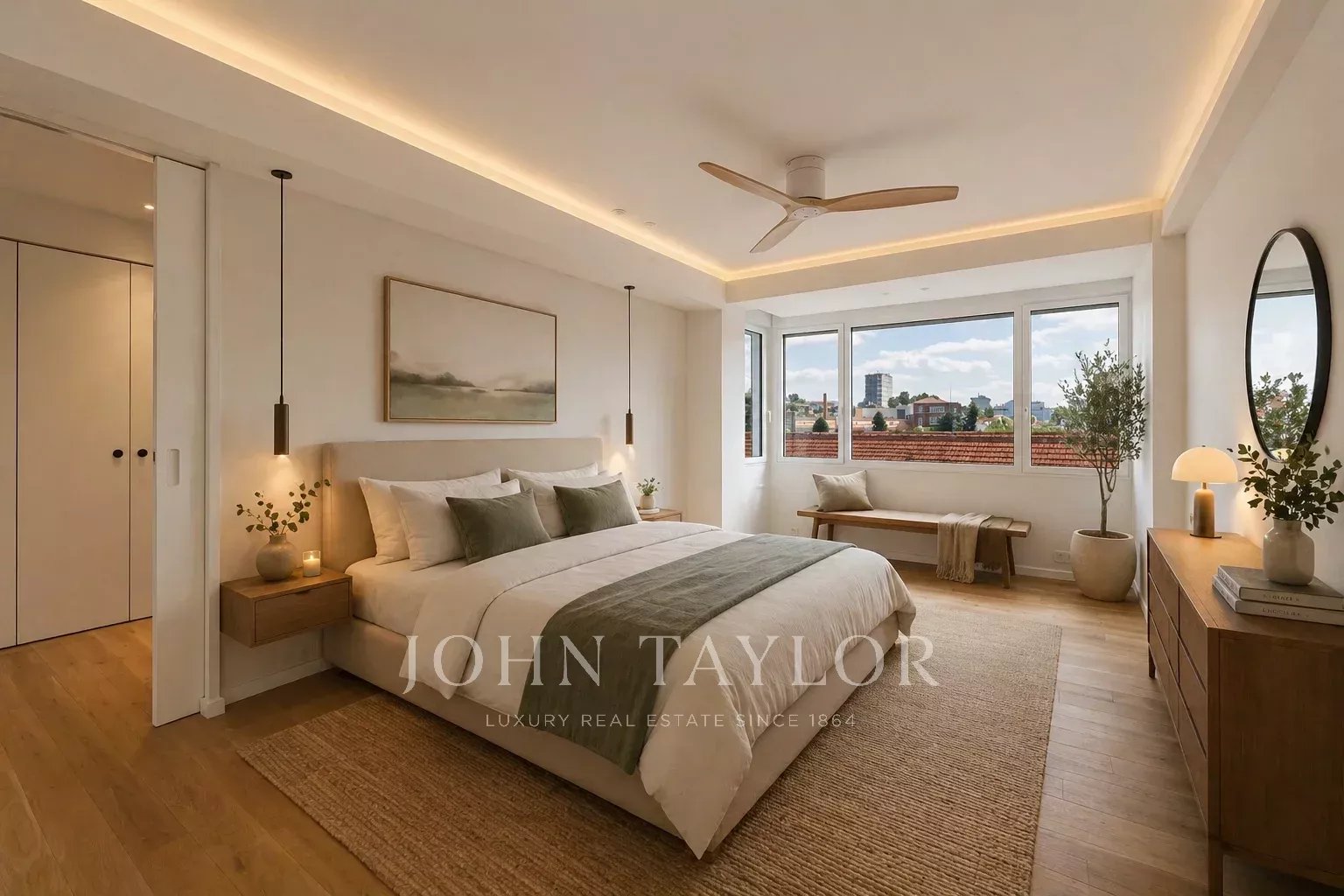 Odpočinková část nabízí tři ložnice. Hlavní, orientovaná do exteriéru, má šatnu a sofistikovanou koupelnu en suite s oddělenou sprchou a vanou. Další dvě ložnice, velmi tiché, mají vestavěné skříně a sdílejí druhou kompletní koupelnu a také toaletu pro hosty.