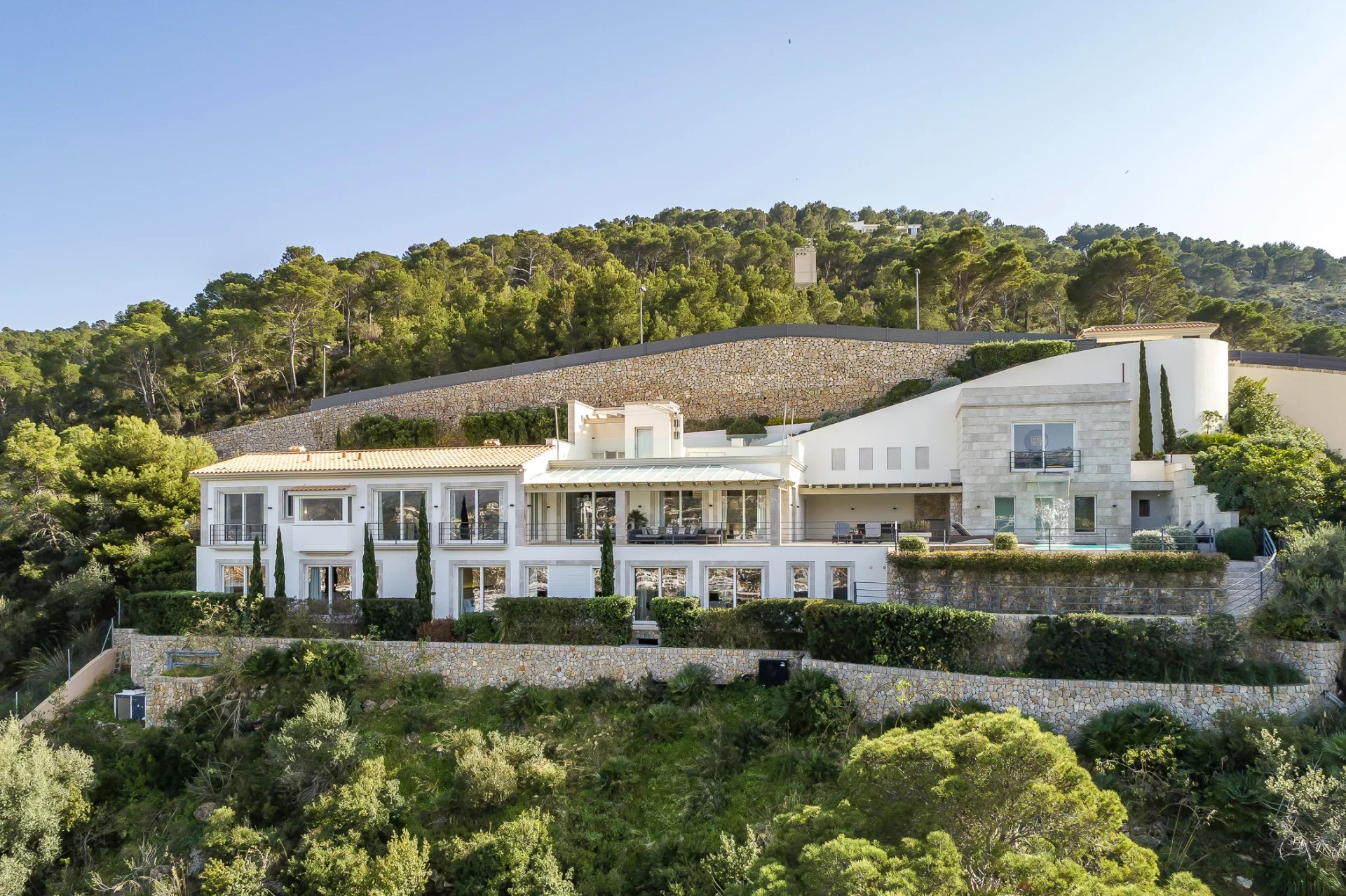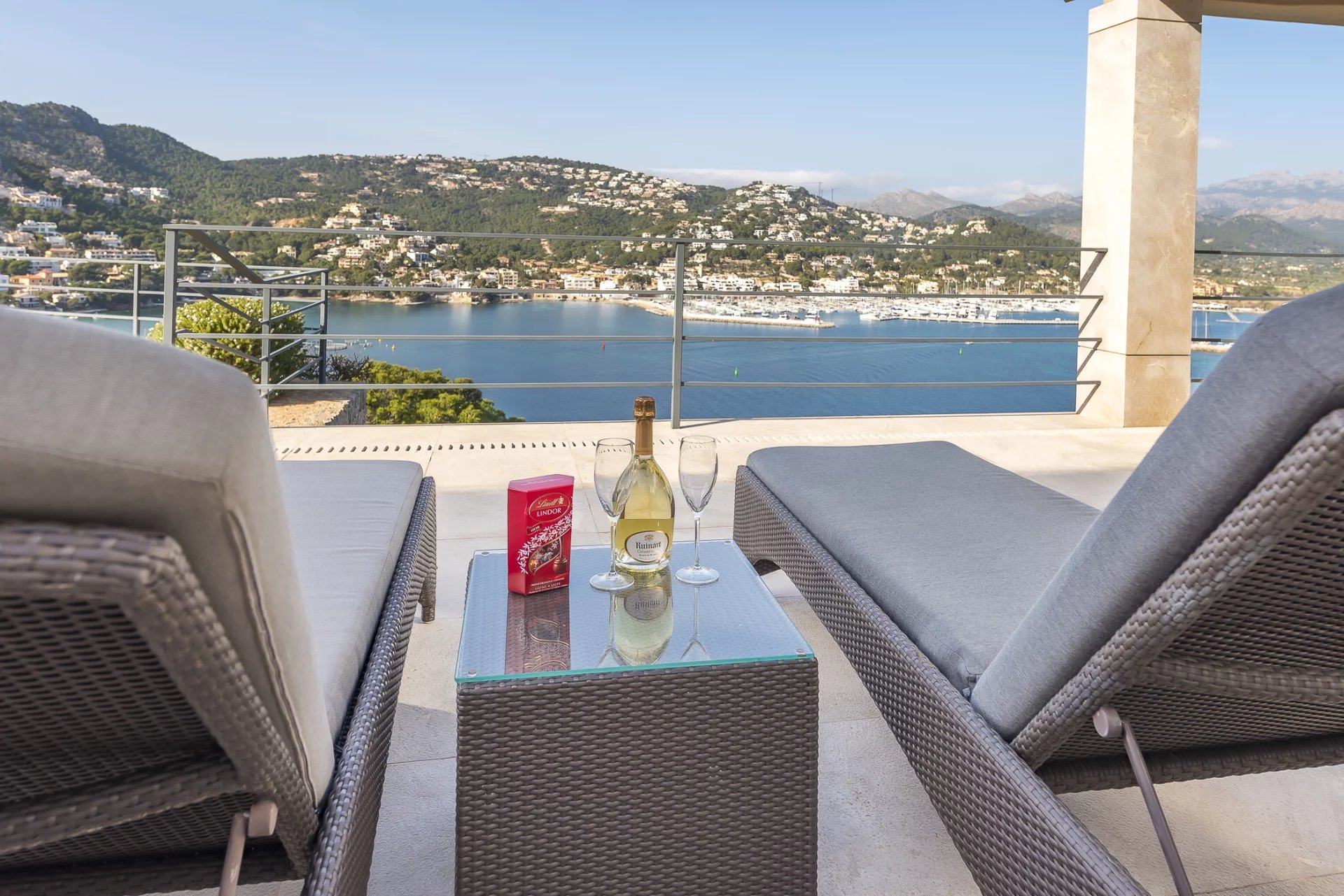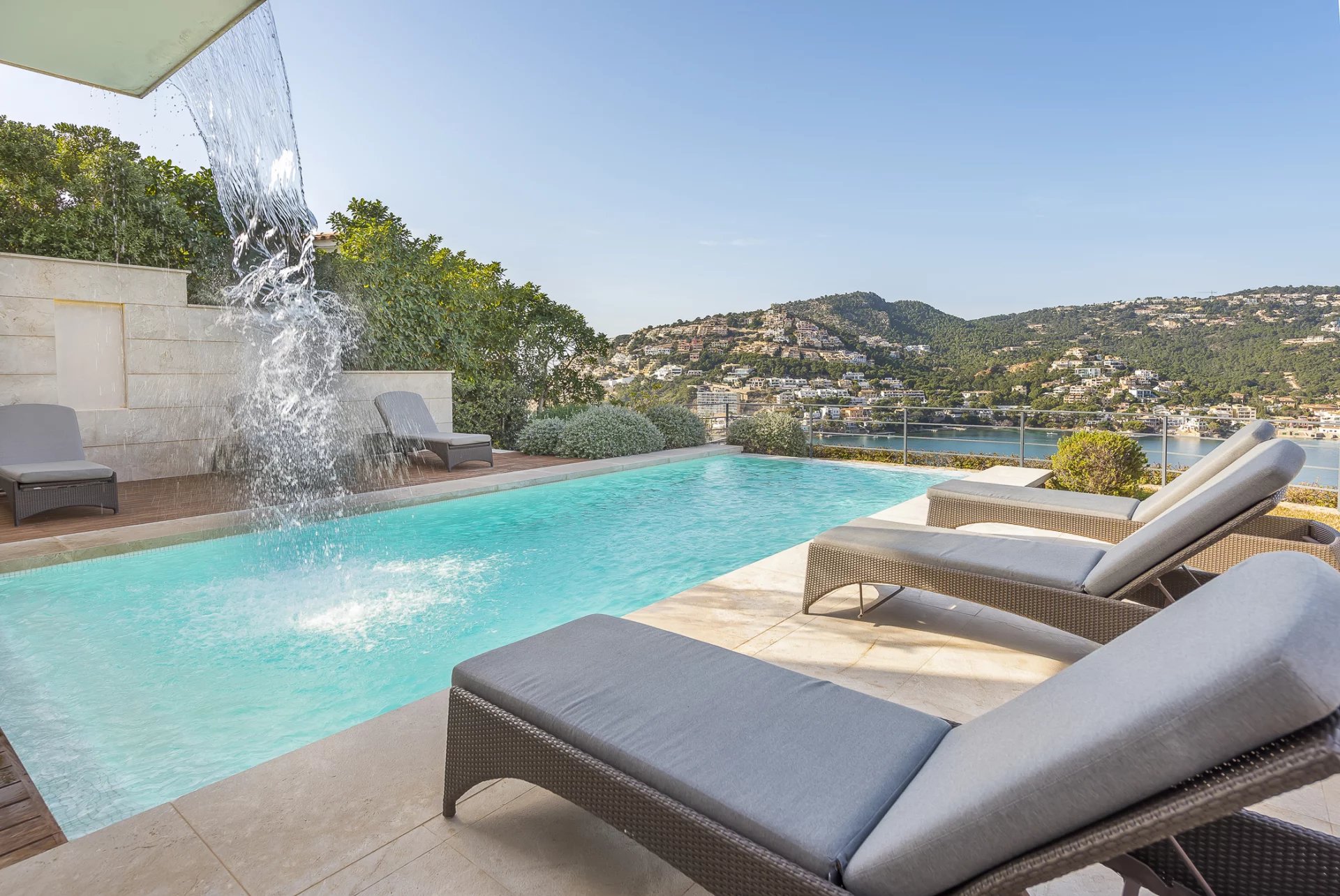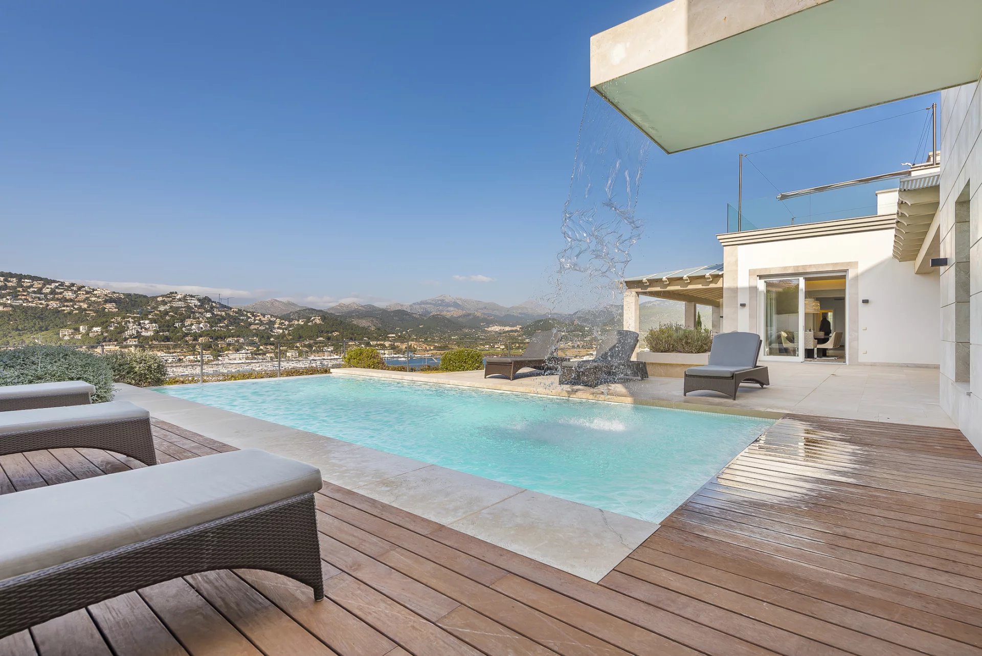 Luxusní vila v nejlepší lokalitě. V této nově postavené vile se na 600 m2 obytné plochy nachází 5 ložnic s vlastním sociálním zařízením. Moderní konstrukce a design prochází celým domem. Plně vybavená otevřená kuchyně nenechává nic náhodě. Ať už z ložnice, útulného obývacího prostoru s krbem nebo z kuchyně, z každé místnosti je úchvatný výhled na záliv Puerto de Andratx a přístav. Venku najdete vyhřívaný nekonečný bazén s odpočinkovou zónou a velký jídelní stůl s grilem. Zvláštní pozornost si zaslouží vlastní sauna, z níž je díky velkému prosklenému průčelí nádherný výhled na moře. Dechberoucí západy slunce jsou zde zaručeny.