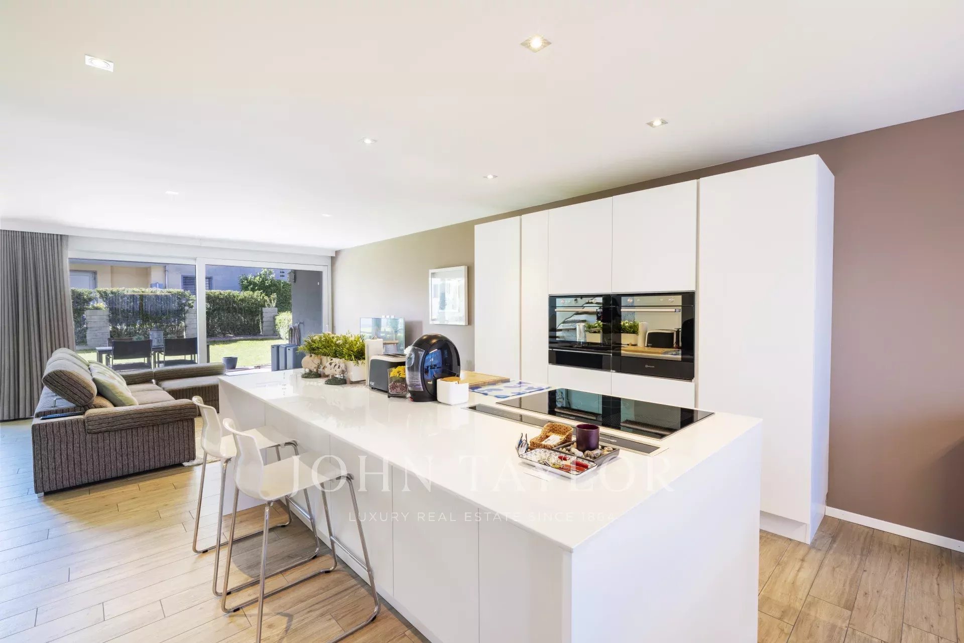 Přízemí: samostatný vchod, jídelna se vstupem na první terasu, dobře vybavená kuchyň s centrálním ostrůvkem, komora/spíž, velmi světlý obývací pokoj se vstupem na druhou terasu a nádhernou uzavřenou zahradu, WC pro hosty.